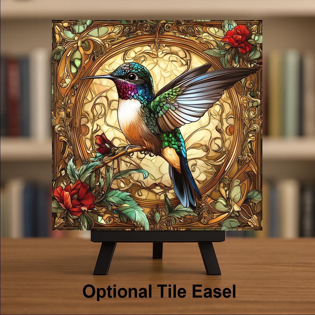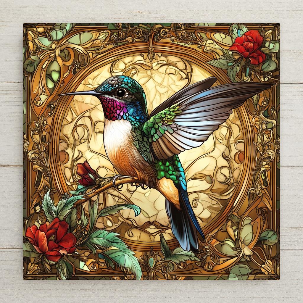 Bring the beauty of nature and art together with this hummingbird ceramic tile. The design features a hummingbird in mid-hover, with wings outstretched beside glowing red flowers. A soft stained glass-style border and golden light create a warm, peaceful setting. Inspired by Art Nouveau and the graceful style of Alphonse Mucha, this tile is both artistic and heartfelt.