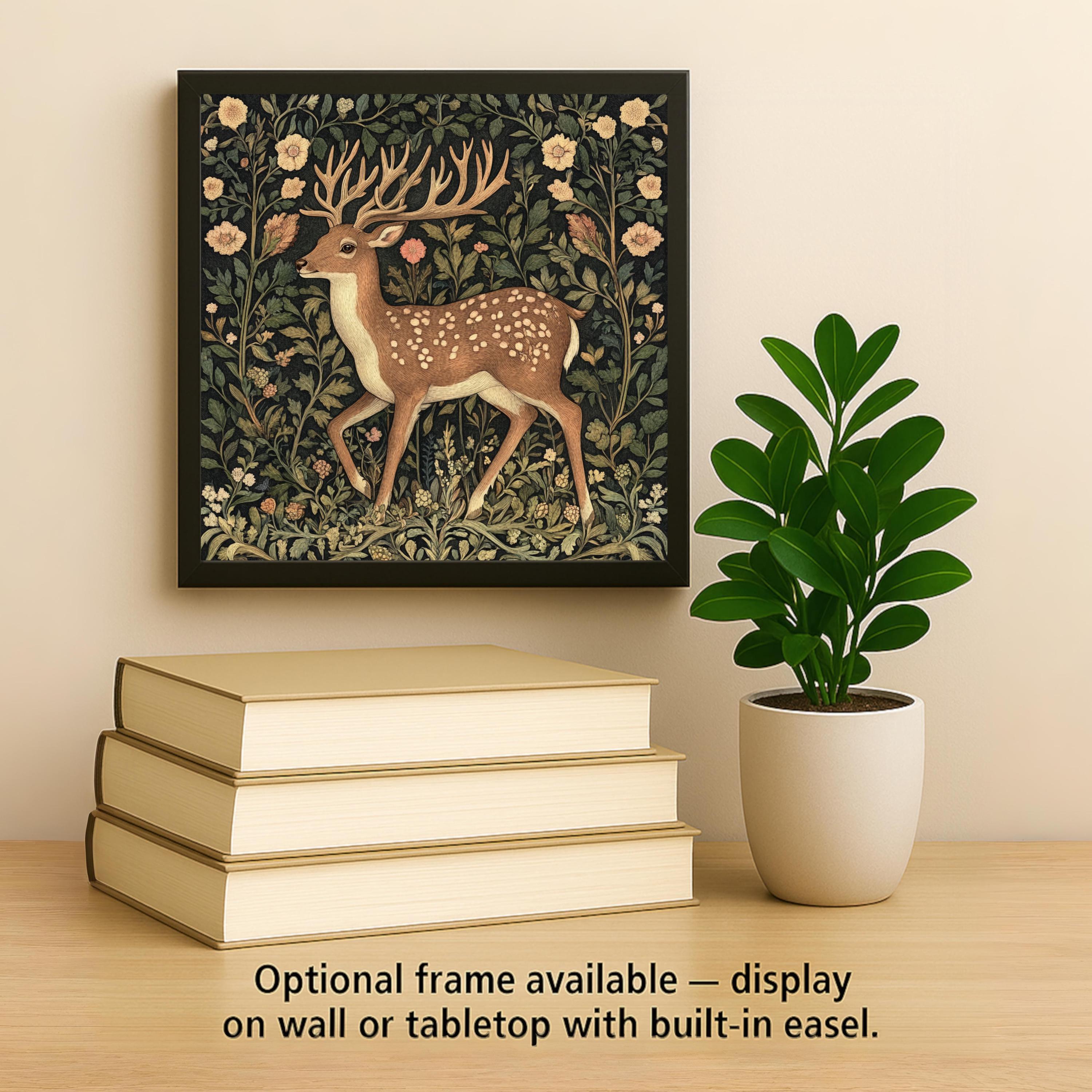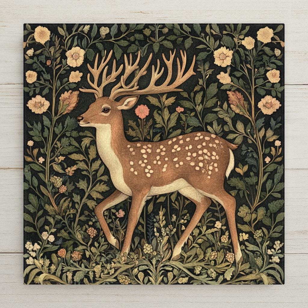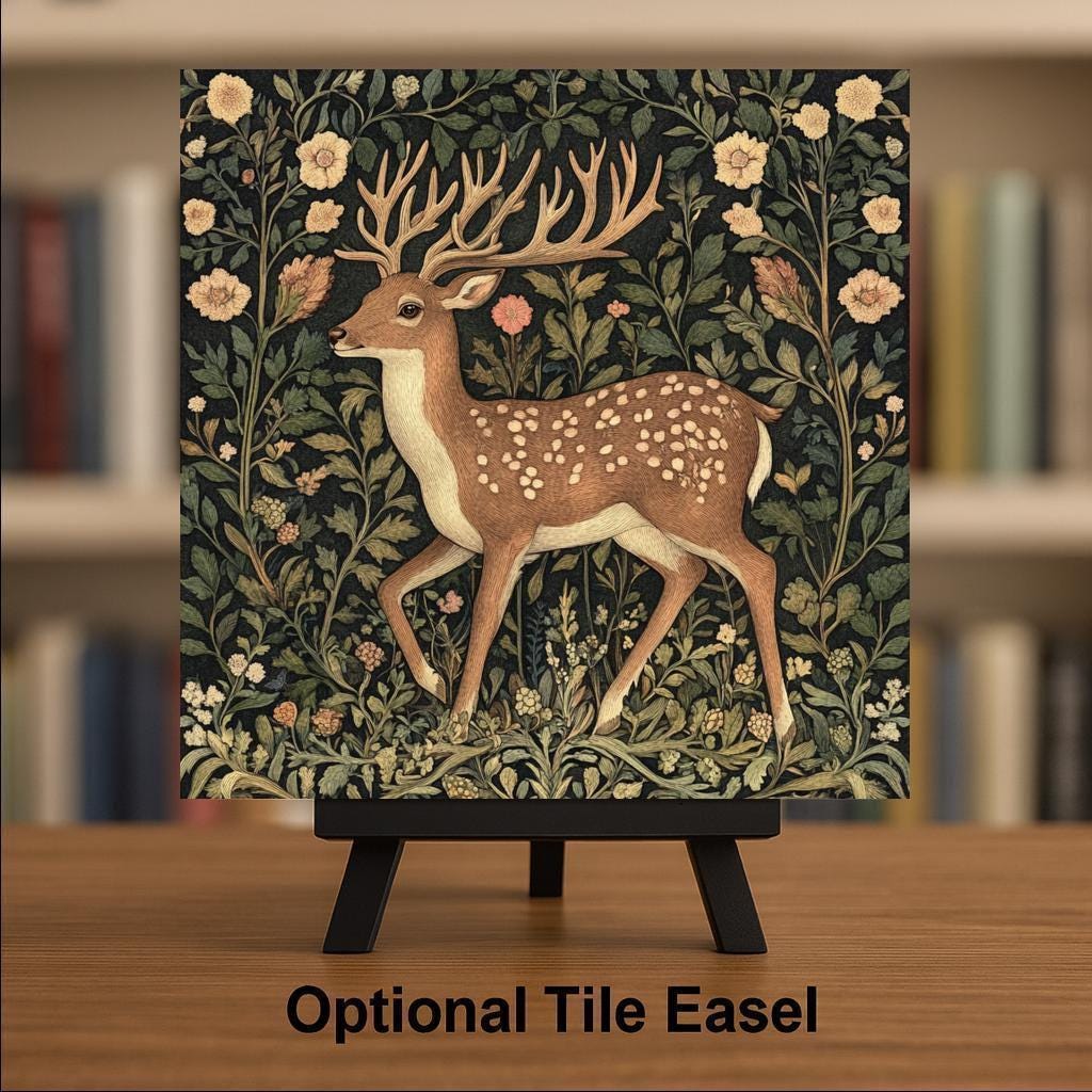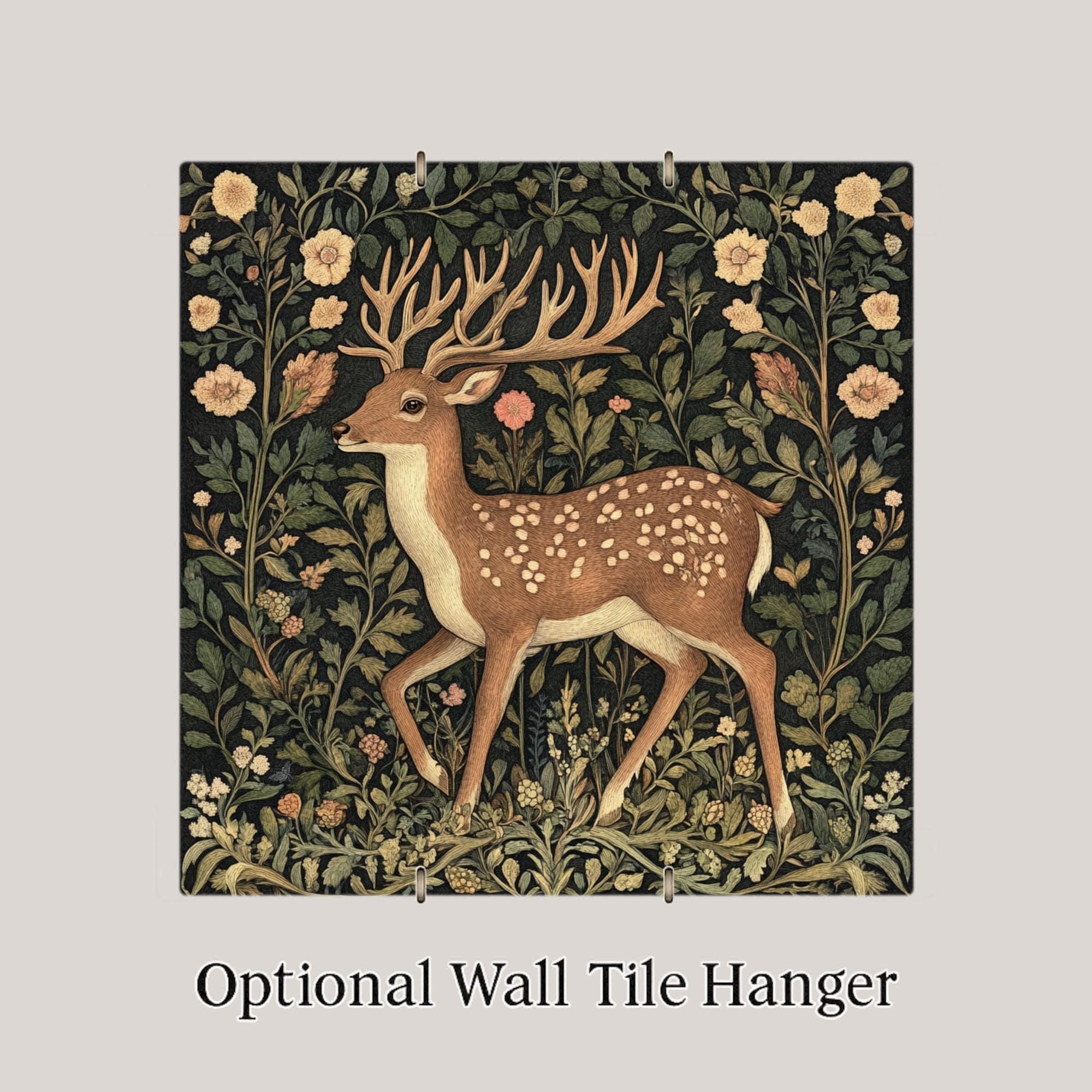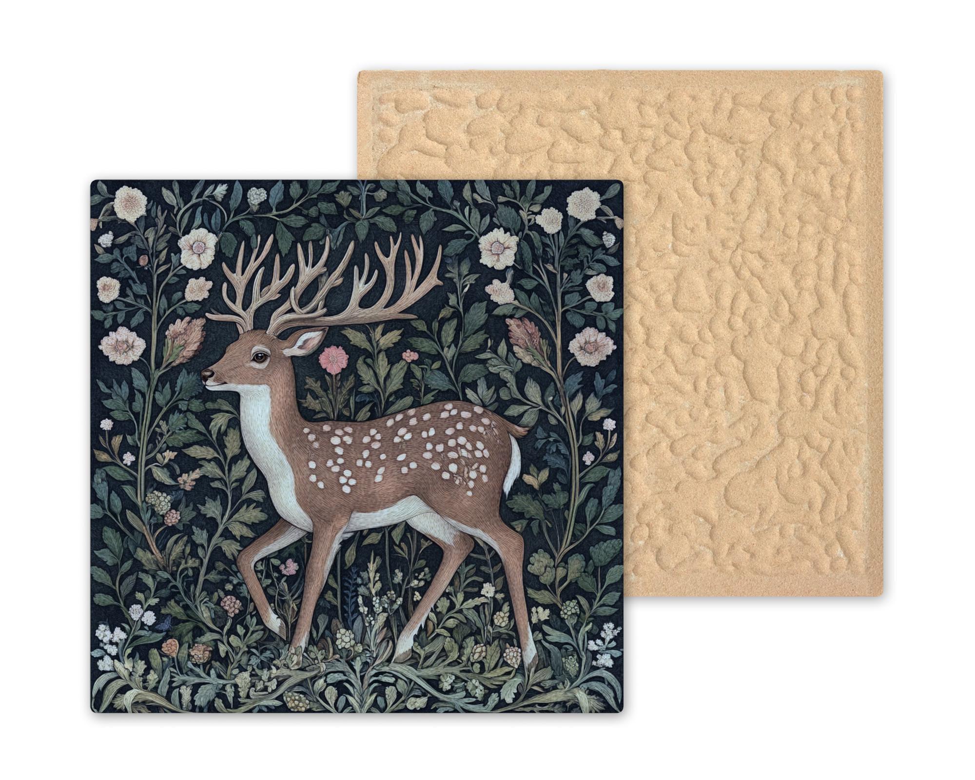 This enchanting ceramic tile features a graceful woodland buck nestled in a tapestry of vintage floral patterns, inspired by William Morris and traditional English textile art. A soft, earthy color palette sets the tone for this elegant design, with gentle greens, creams, and blush tones framing the deer in a lush forest.