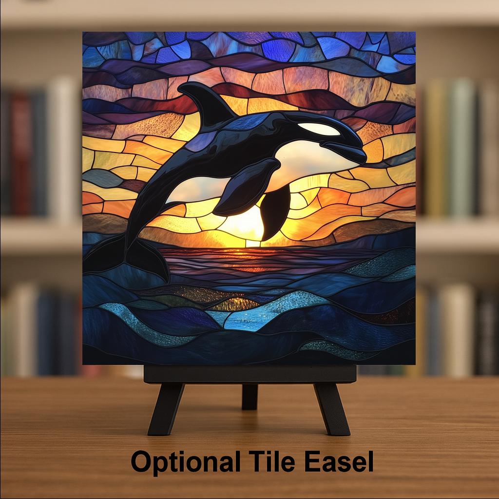Celebrate marine wildlife and coastal beauty with this stunning ceramic tile featuring a stained glass-style orca at sunset. With vibrant colors and detailed glass-mosaic textures, this handcrafted tile brings the ocean to life in a warm and uplifting way.