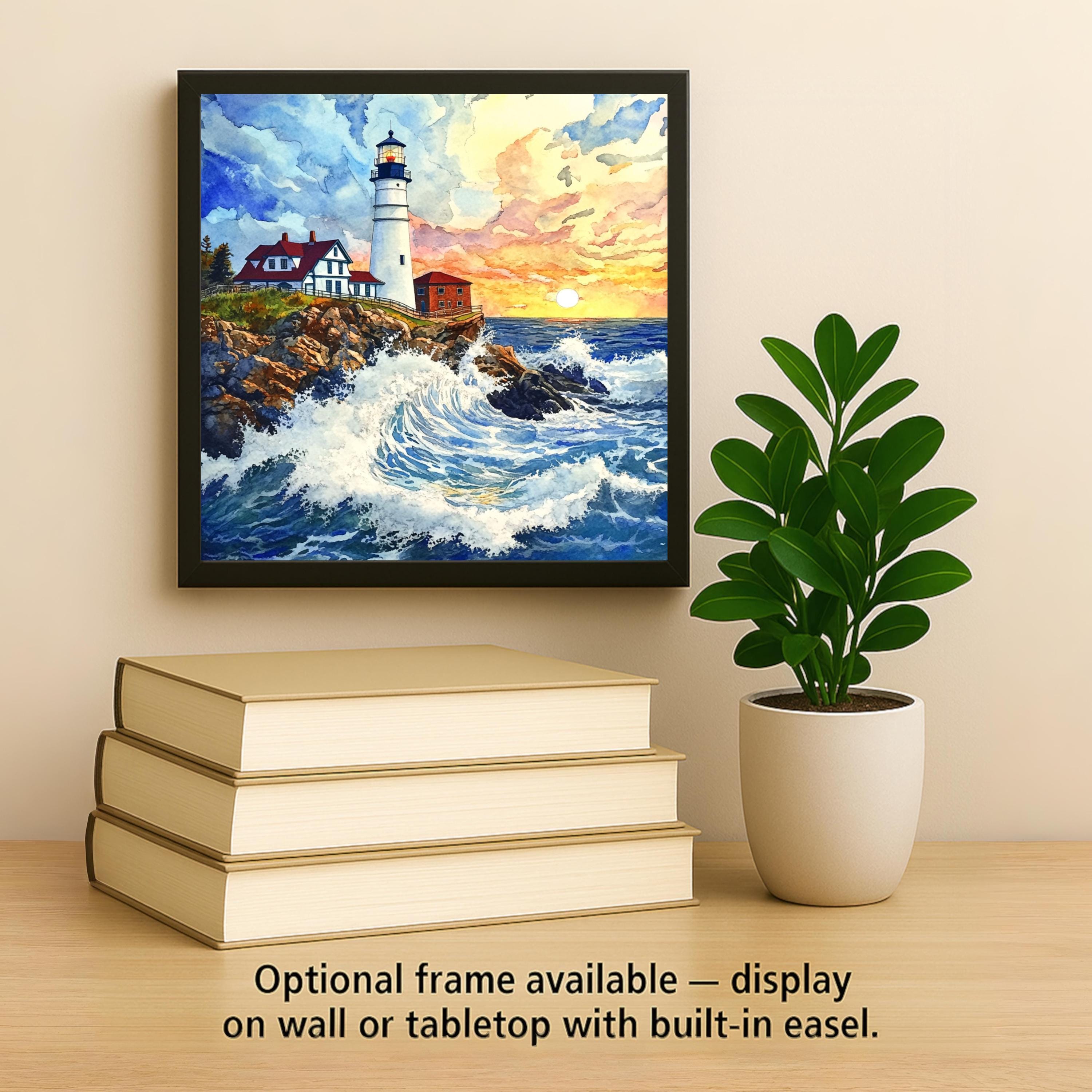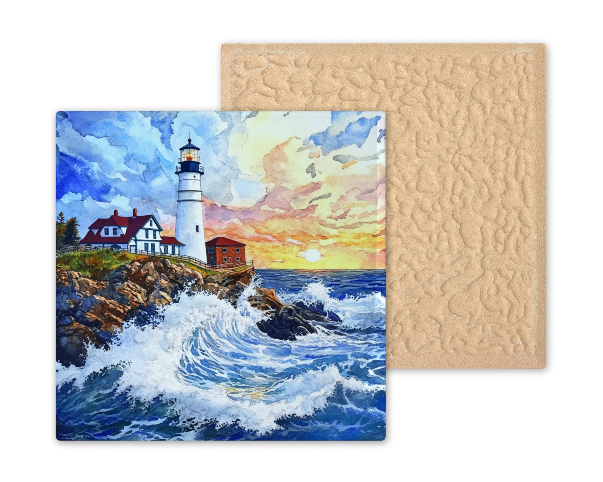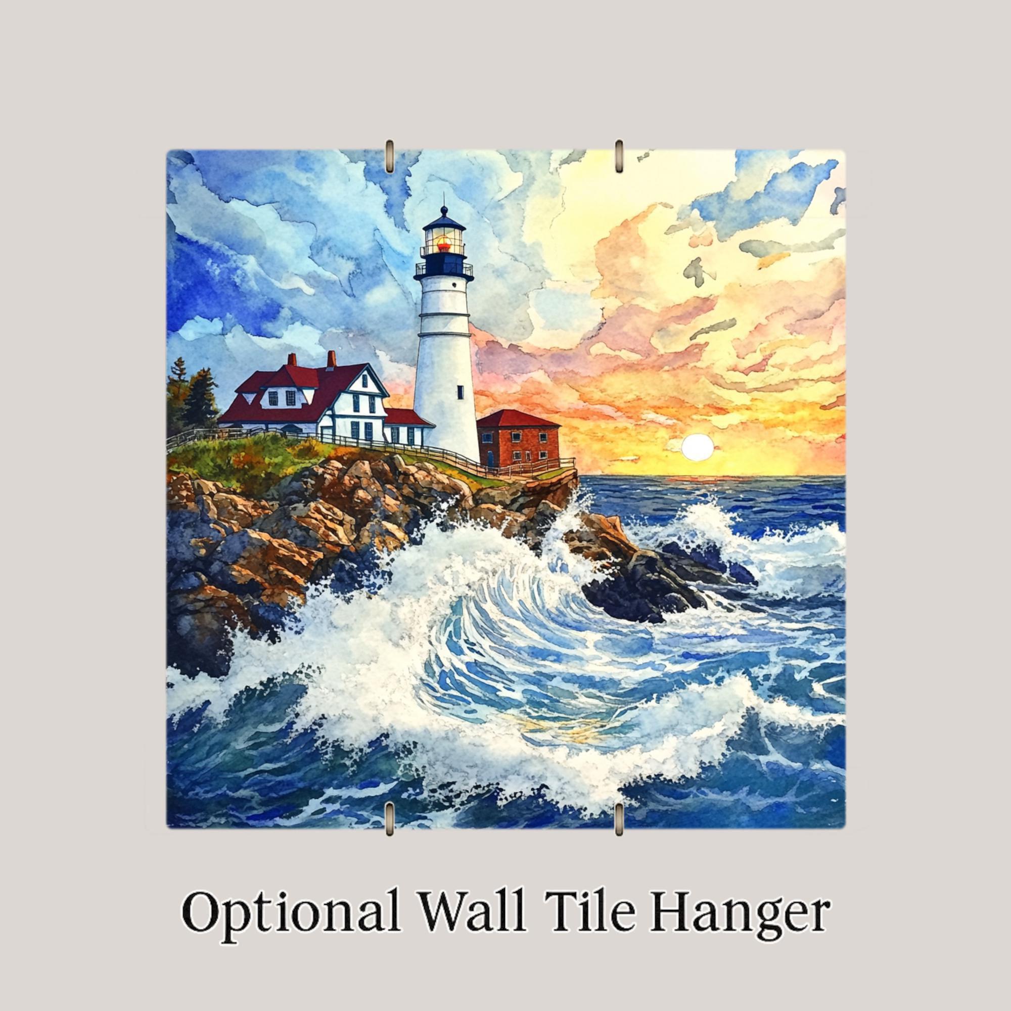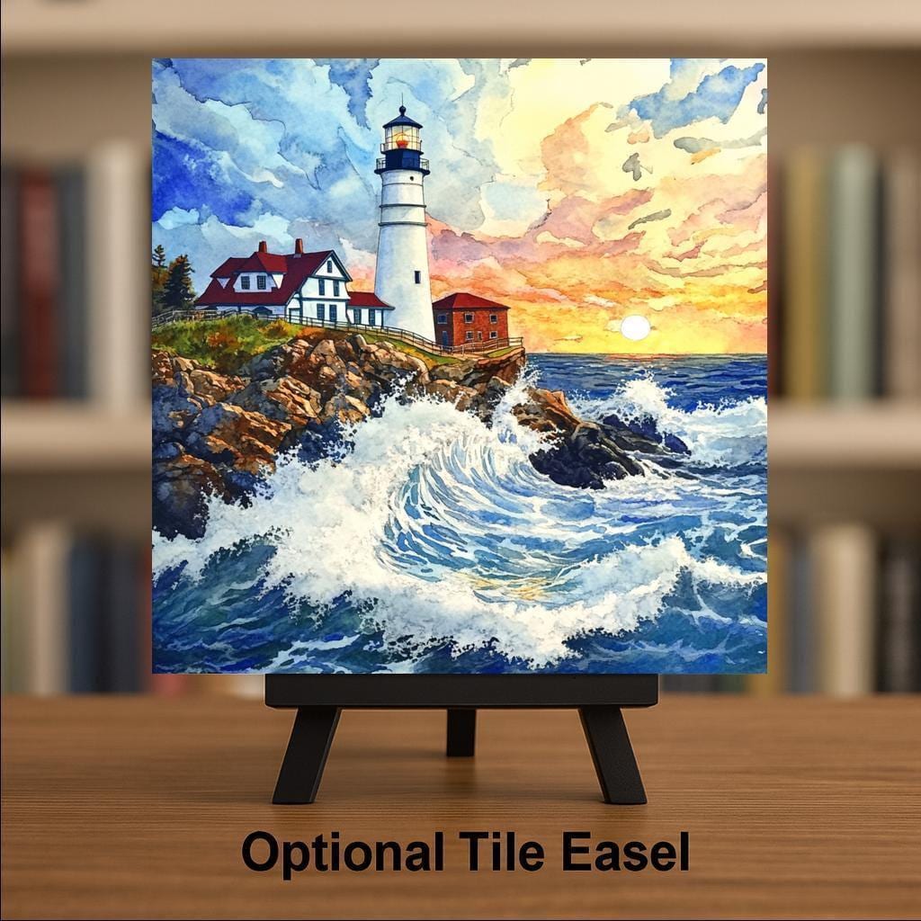 This Portland Head Lighthouse ceramic tile captures a dramatic scene of ocean waves crashing against rocky cliffs, all under a radiant sunset sky. The watercolor design brings soft brushstrokes and vivid detail to life, making this a perfect coastal piece for lighthouse fans and seaside dreamers.