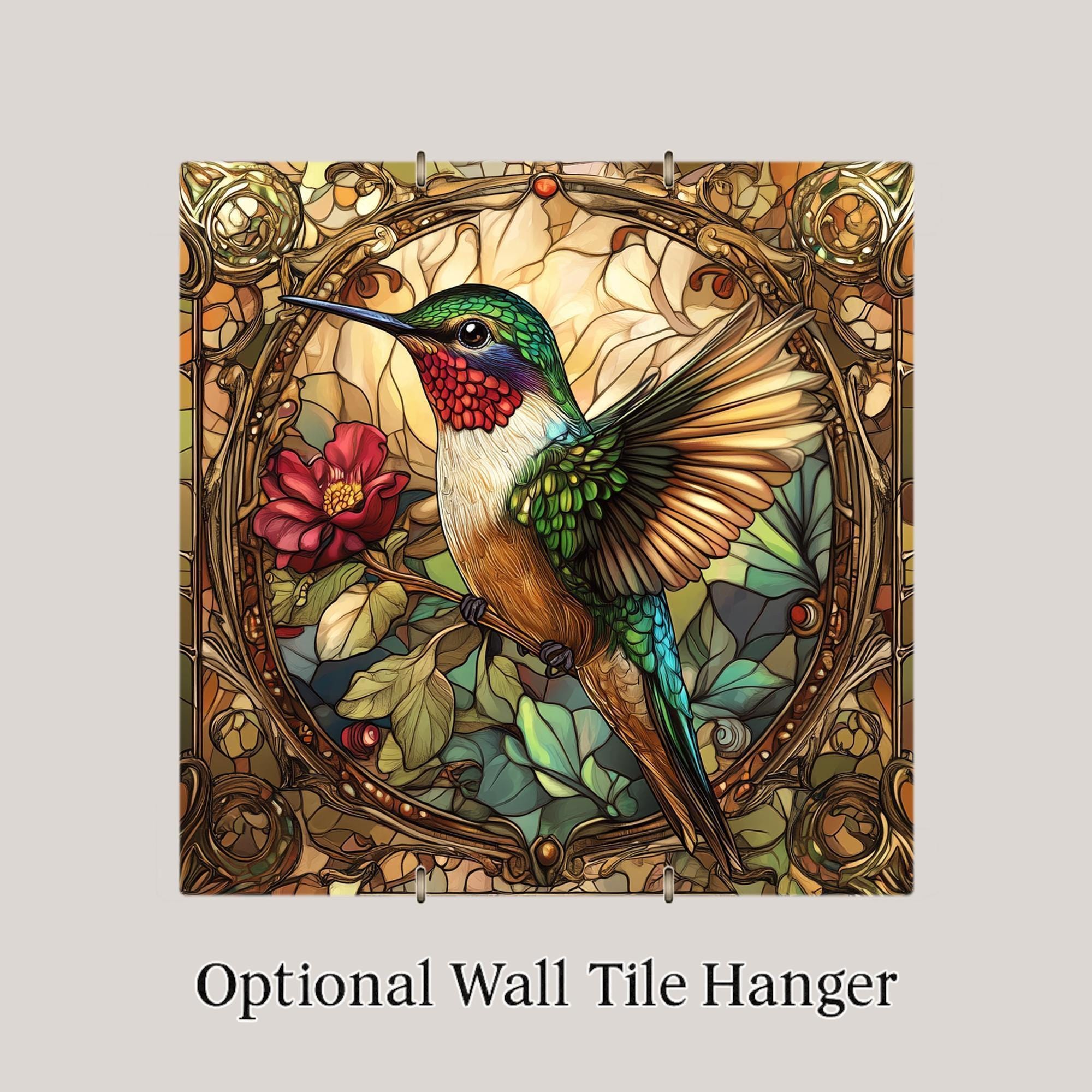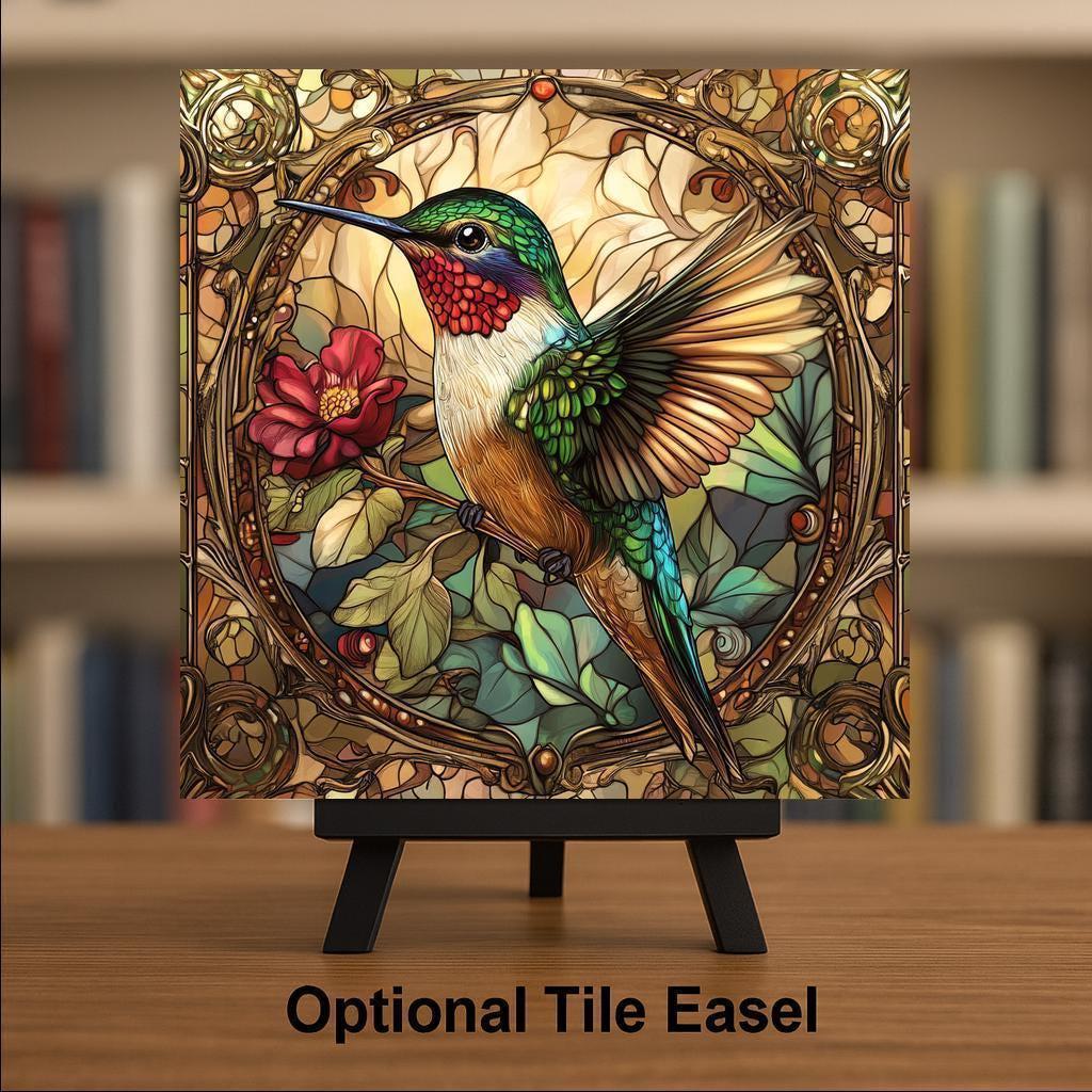 This handcrafted hummingbird tile brings a mix of beauty, detail, and vintage charm. The bird sits on a red flower, with its wings tucked in and feathers glowing in green, gold, and ruby tones. Around it, soft leaves and swirling gold lines form a detailed Art Nouveau frame, echoing stained glass windows.