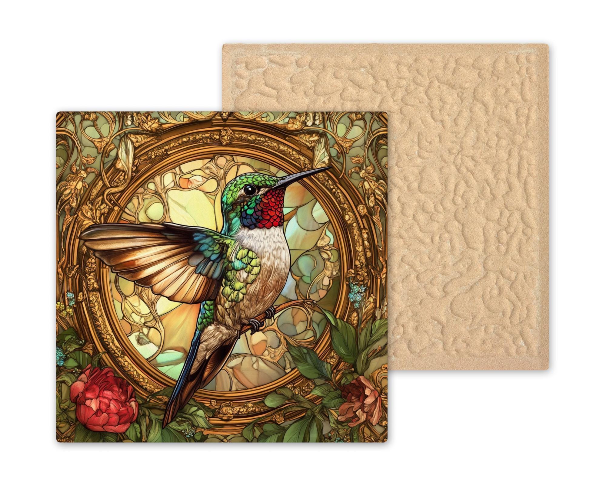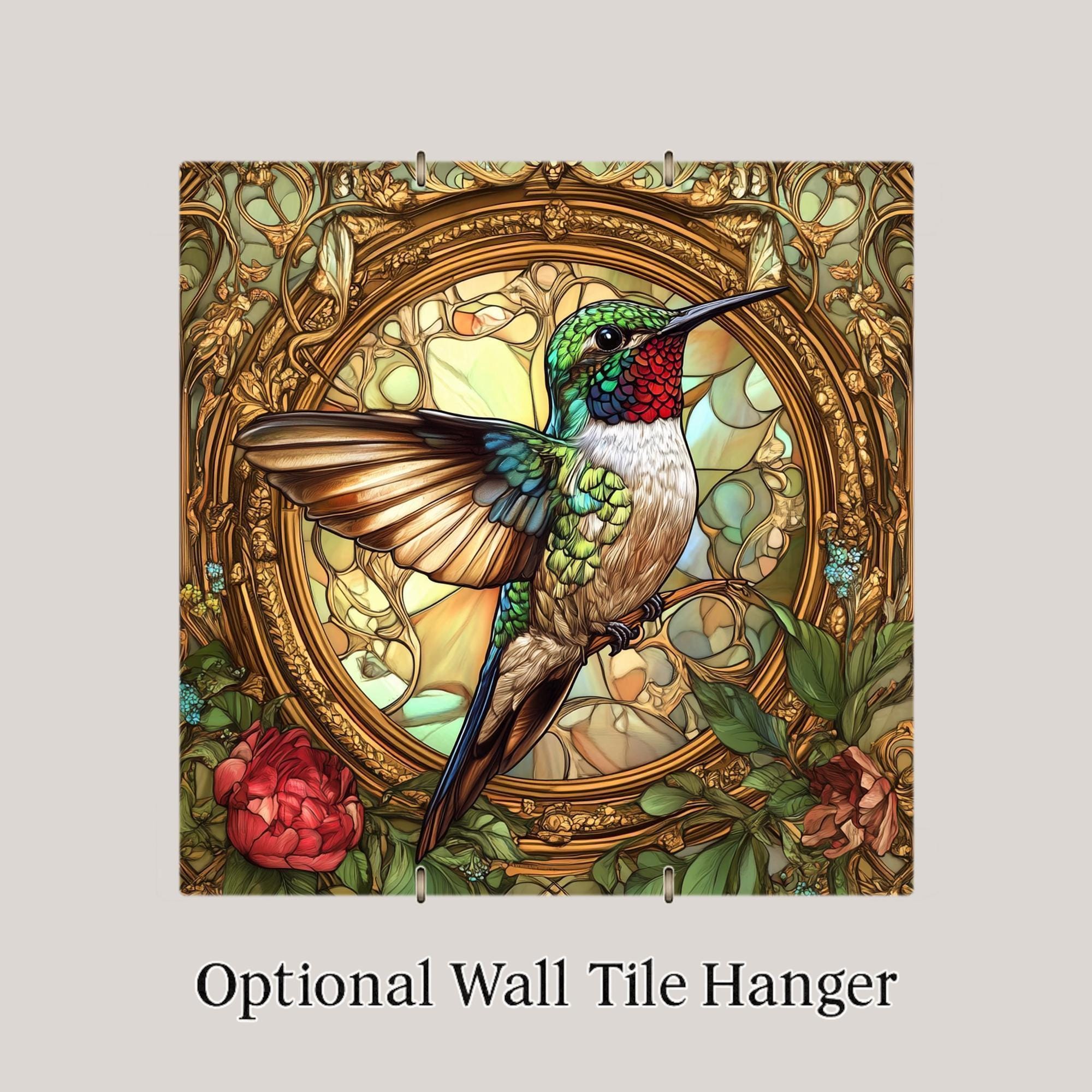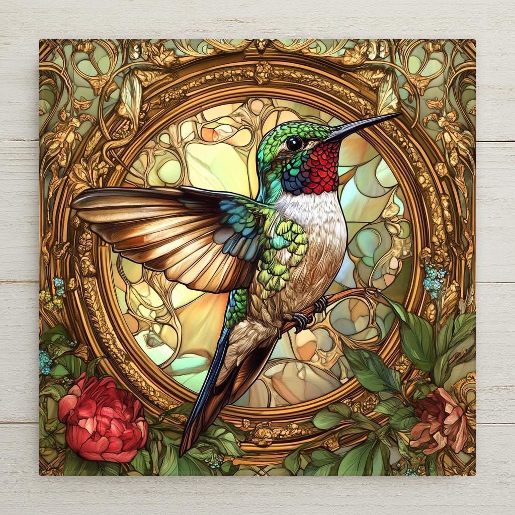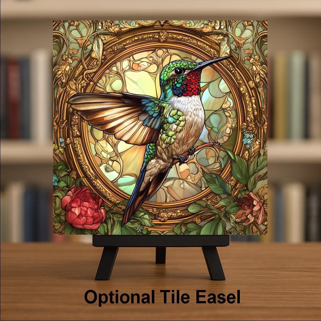 This handcrafted ceramic tile shows a beautiful hummingbird surrounded by flowers and stained glass patterns. The style is inspired by Alphonse Mucha’s famous Art Nouveau designs. The hummingbird's wings shine with green, red, and gold, while the floral background swirls with vines and petals in soft, rich colors.