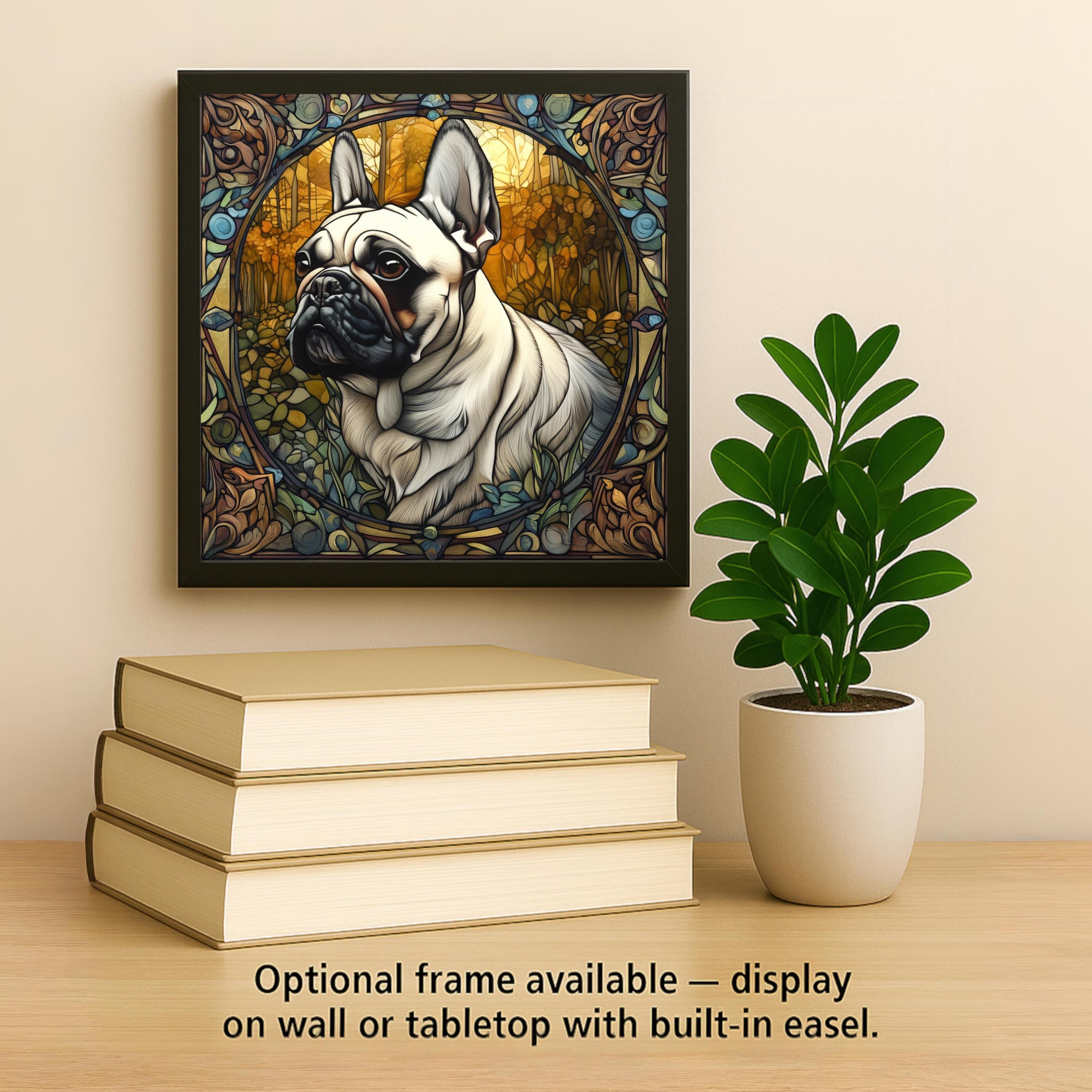The ornate frame and woodland tones evoke classic European decorative art traditions while highlighting the gentle strength and character of the Frenchie itself. The design blends beautifully with cottage decor, rustic interiors, dog themed spaces, and cozy home environments.