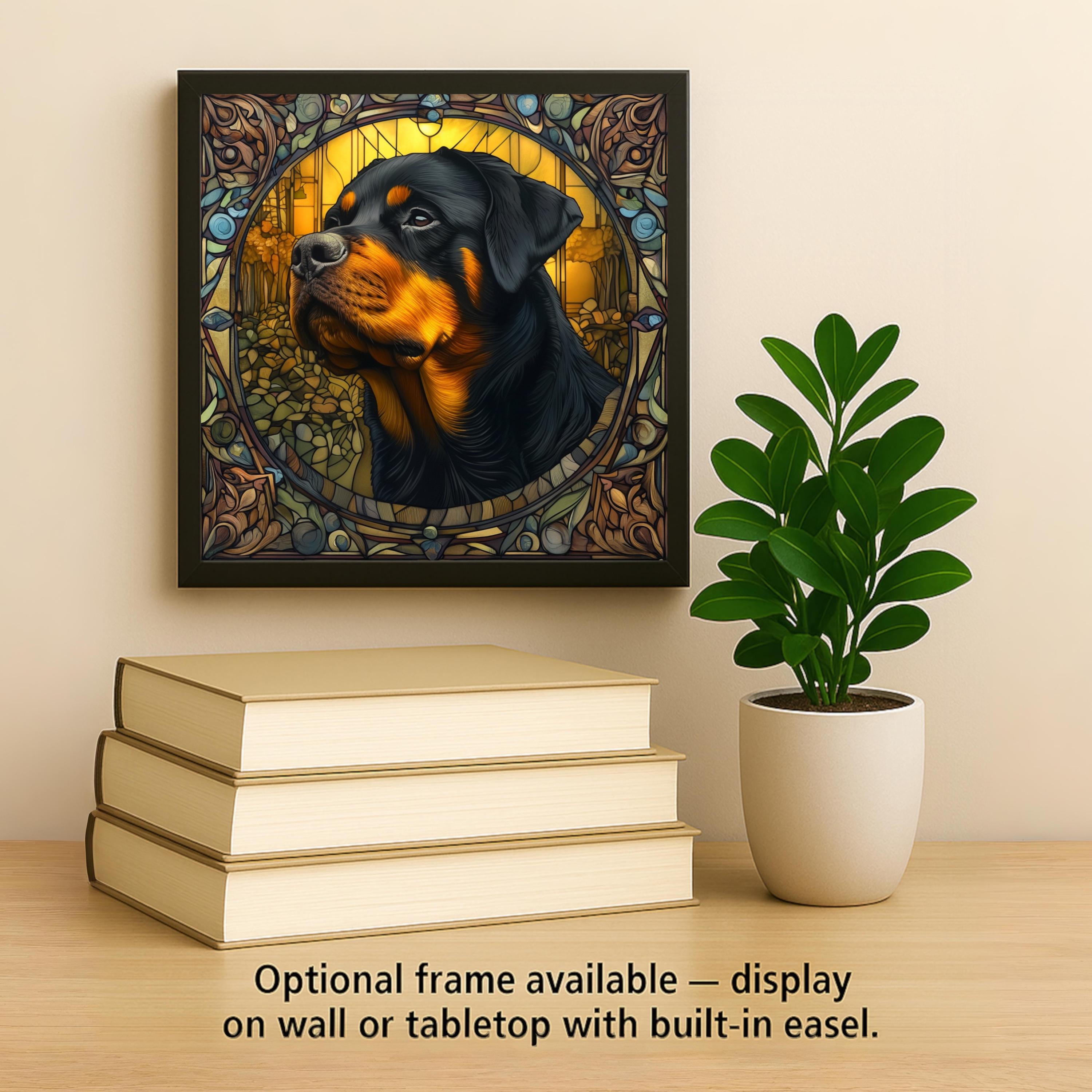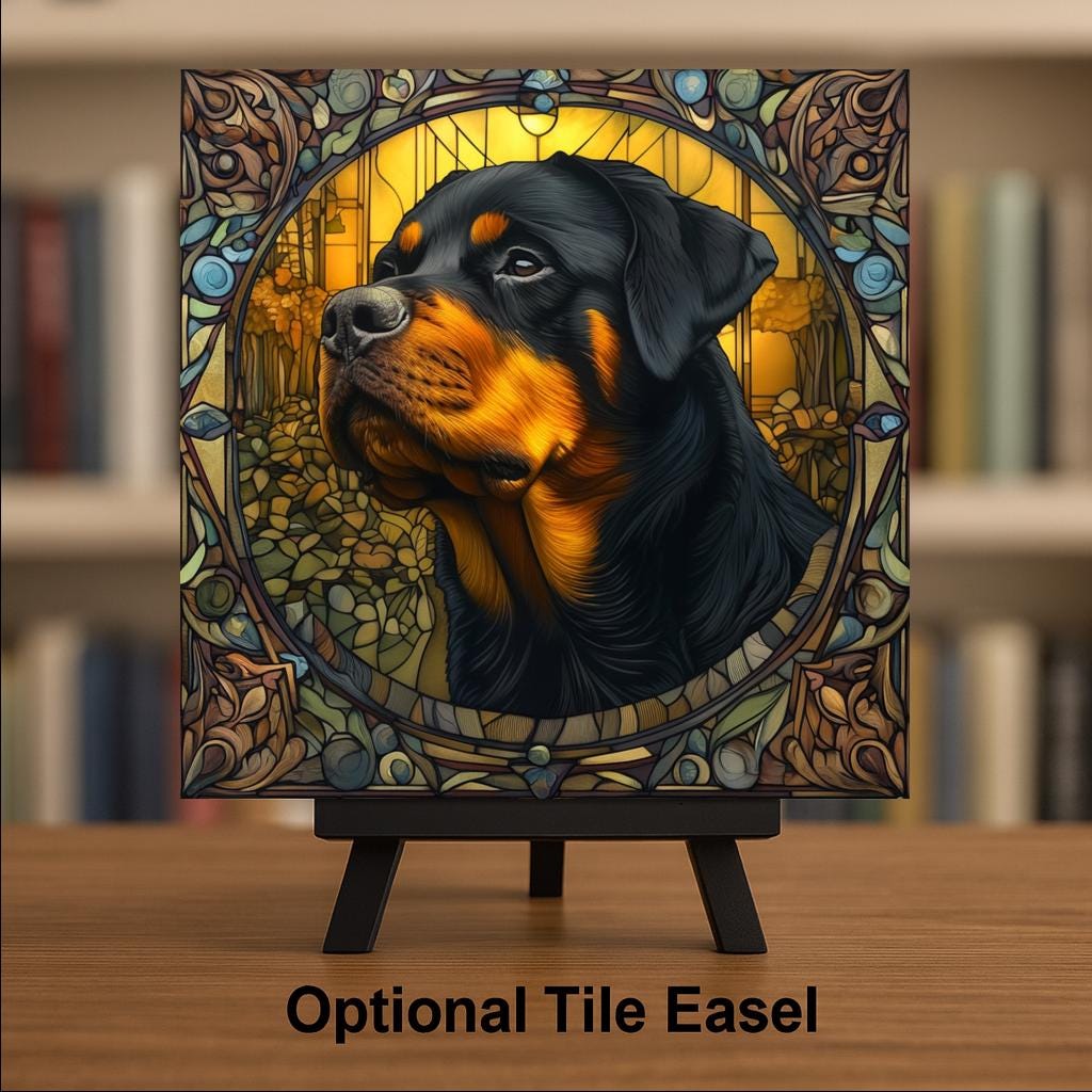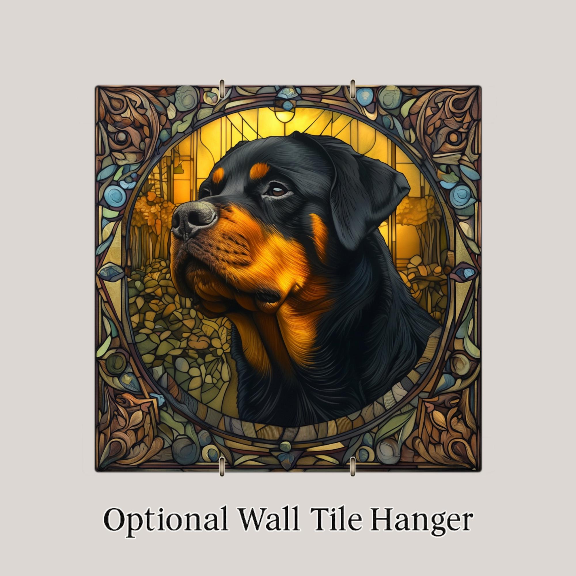 Celebrate the strength and beauty of Rottweilers with this Mucha-inspired ceramic tile. The design features a detailed Rottweiler framed by swirling Art Nouveau lines and glowing forest tones. With deep black fur and golden brown highlights, the dog looks noble and serene. The stained glass-style background adds vintage charm and artistic depth.