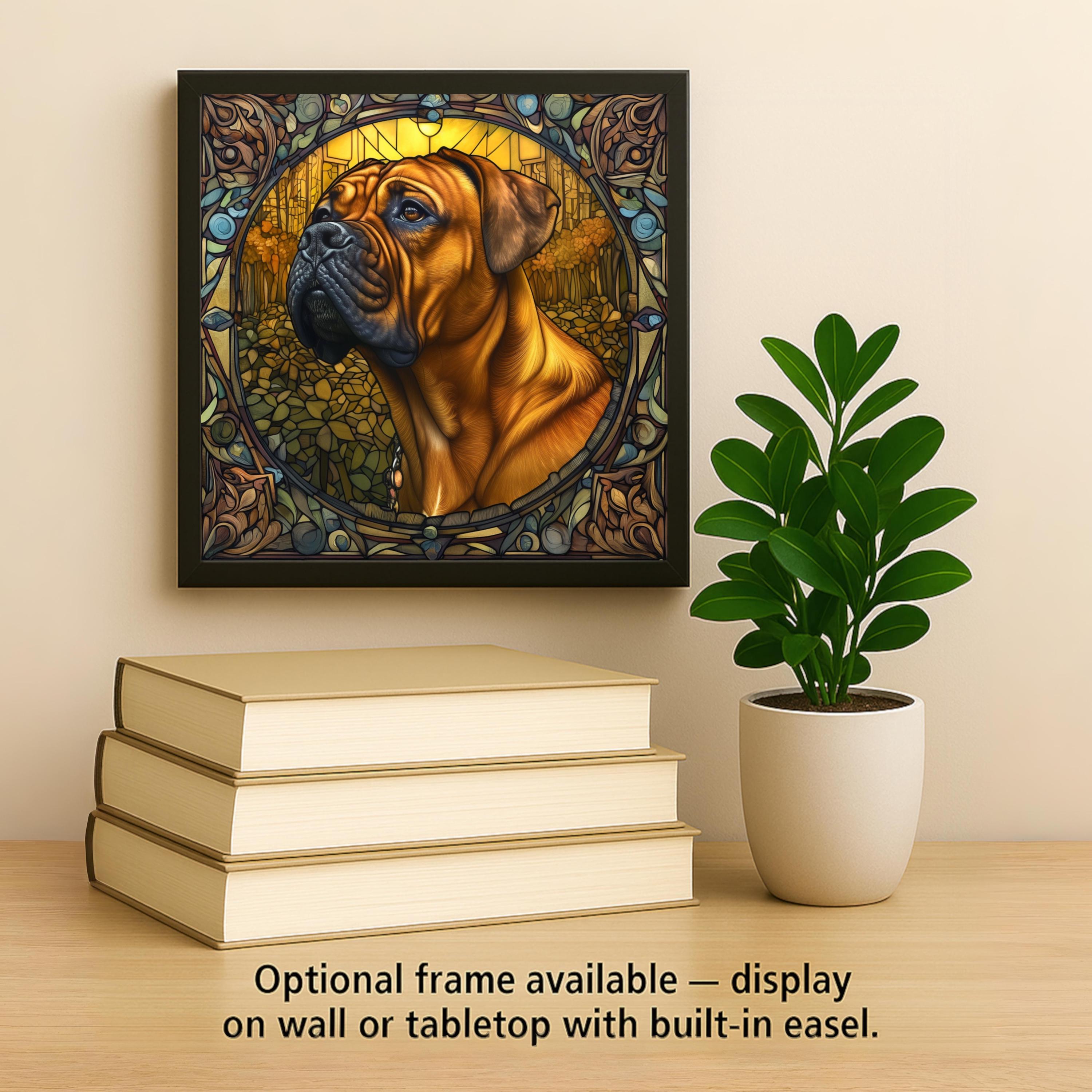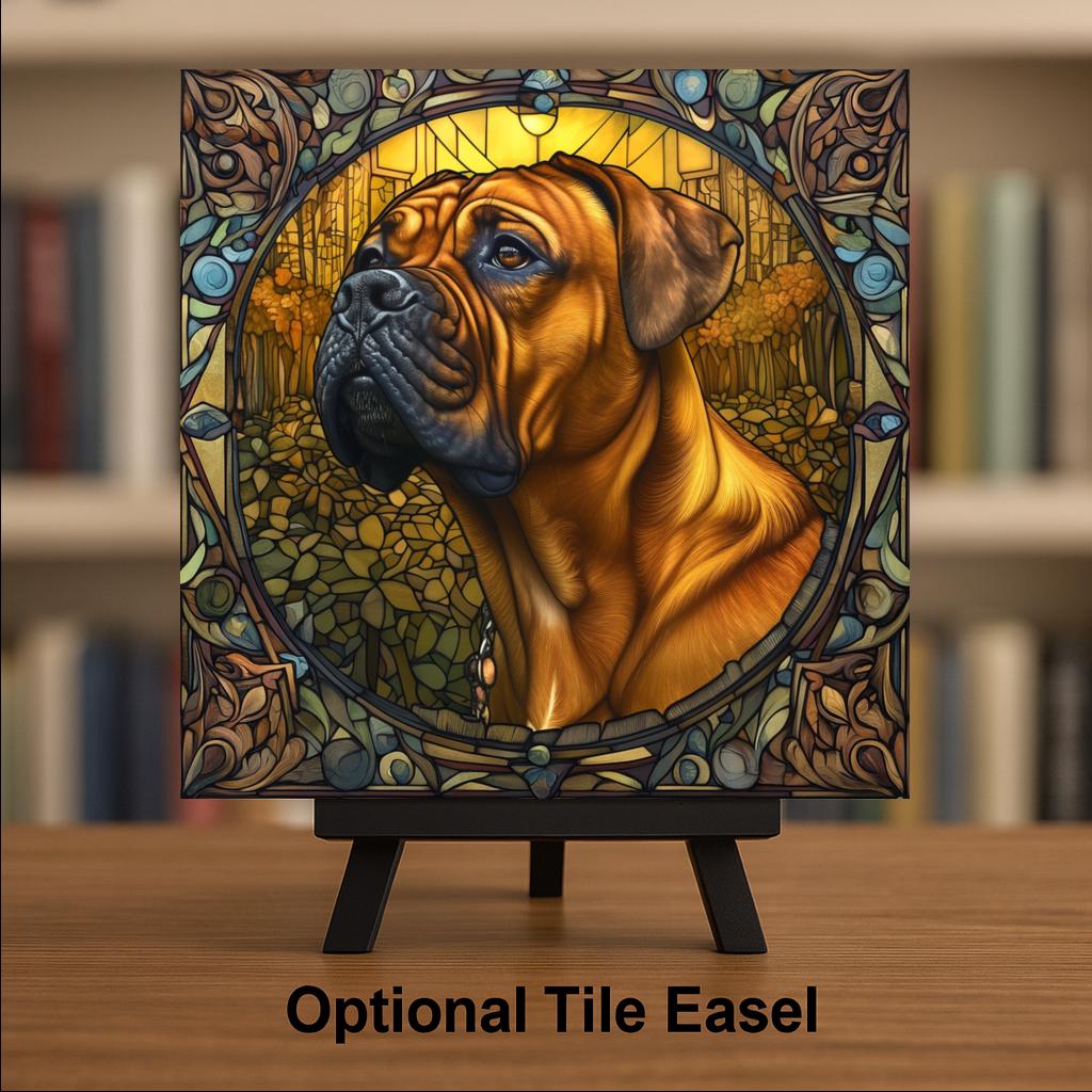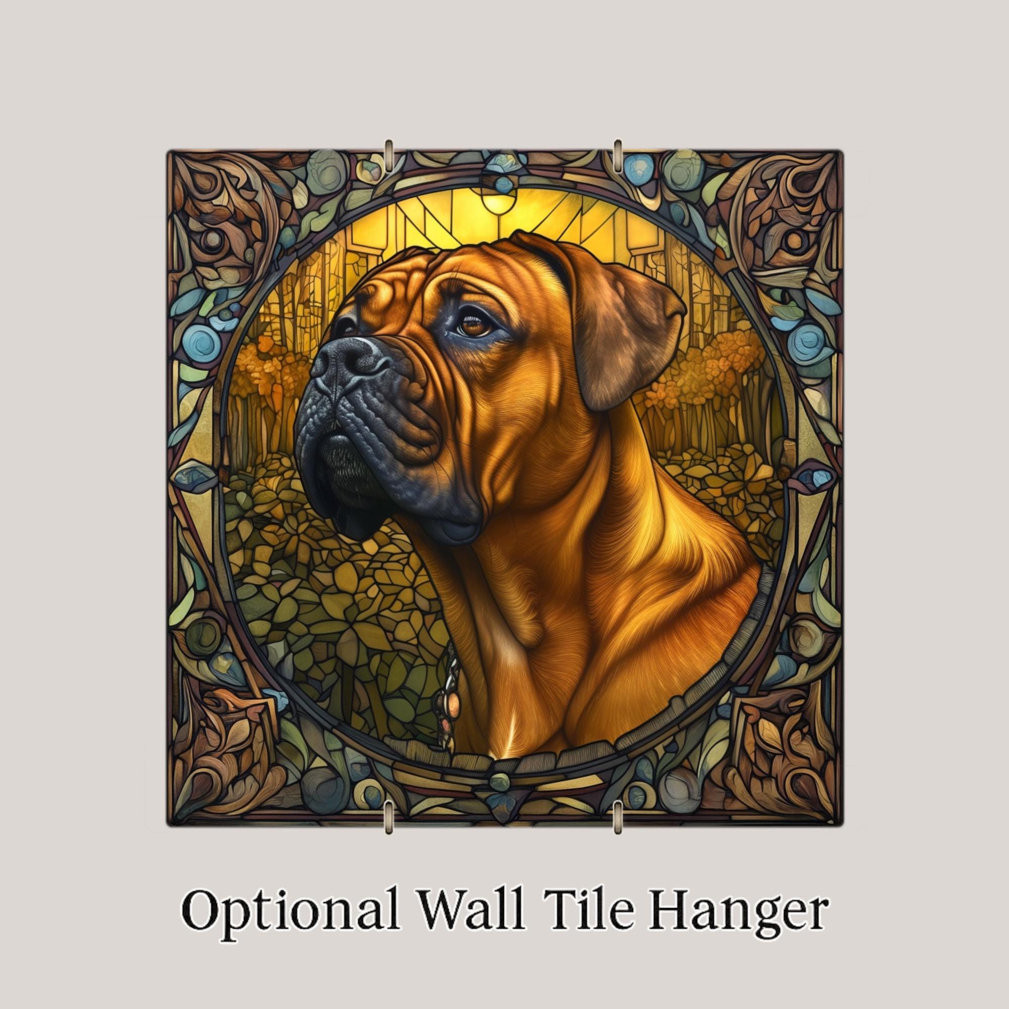 This Boxer dog tile brings warmth, strength, and beauty to your space. The artwork shows a handsome Boxer sitting tall with a focused gaze. Surrounding the dog is a stained glass-style frame filled with flowing vines, circular shapes, and floral details in warm amber, teal, and olive tones. The design feels earthy and elegant, with soft edges and natural symmetry.
