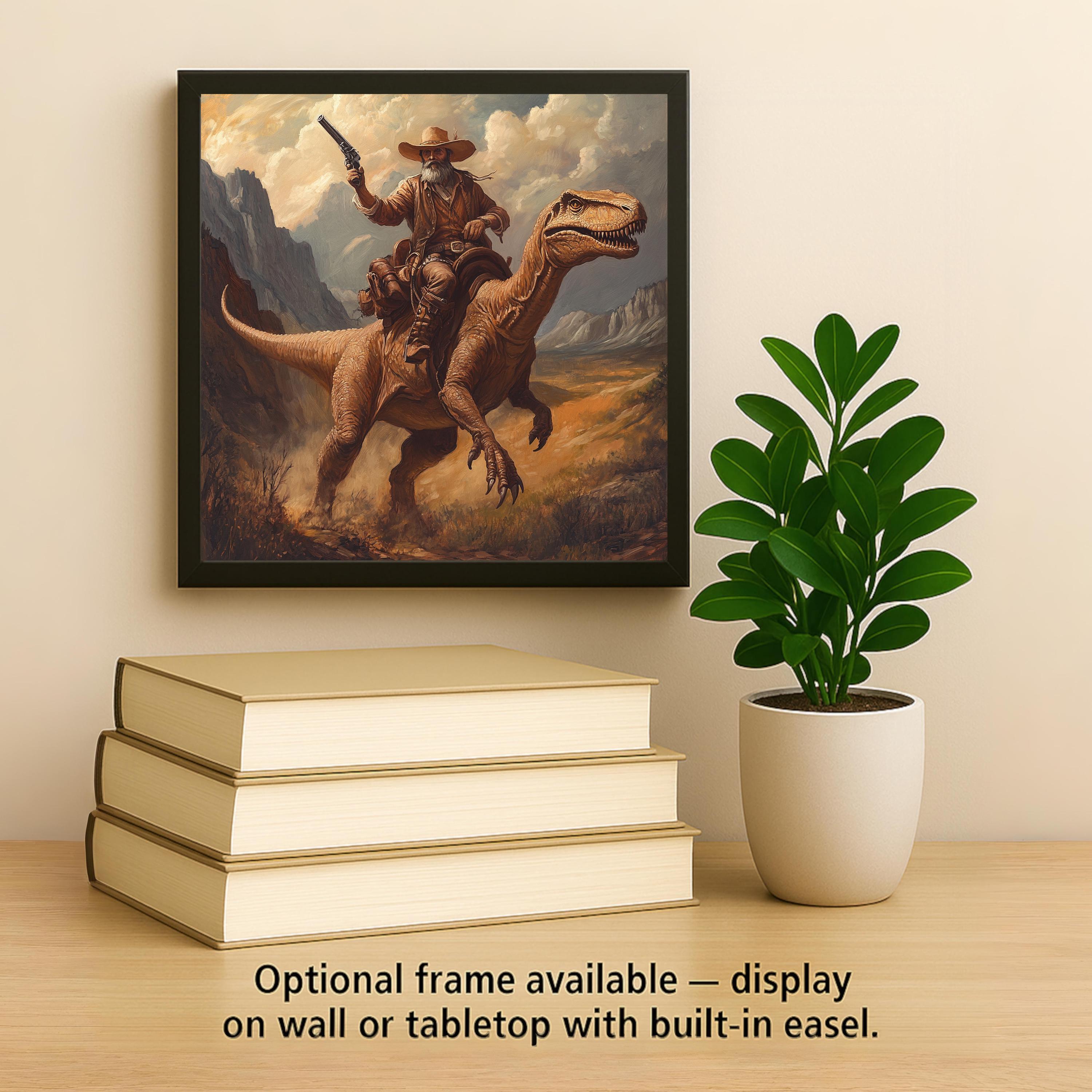 Whether used as a centerpiece or part of a themed gallery wall, this cowboy-and-raptor artwork infuses your home decor with attitude, motion, and rugged fantasy style.