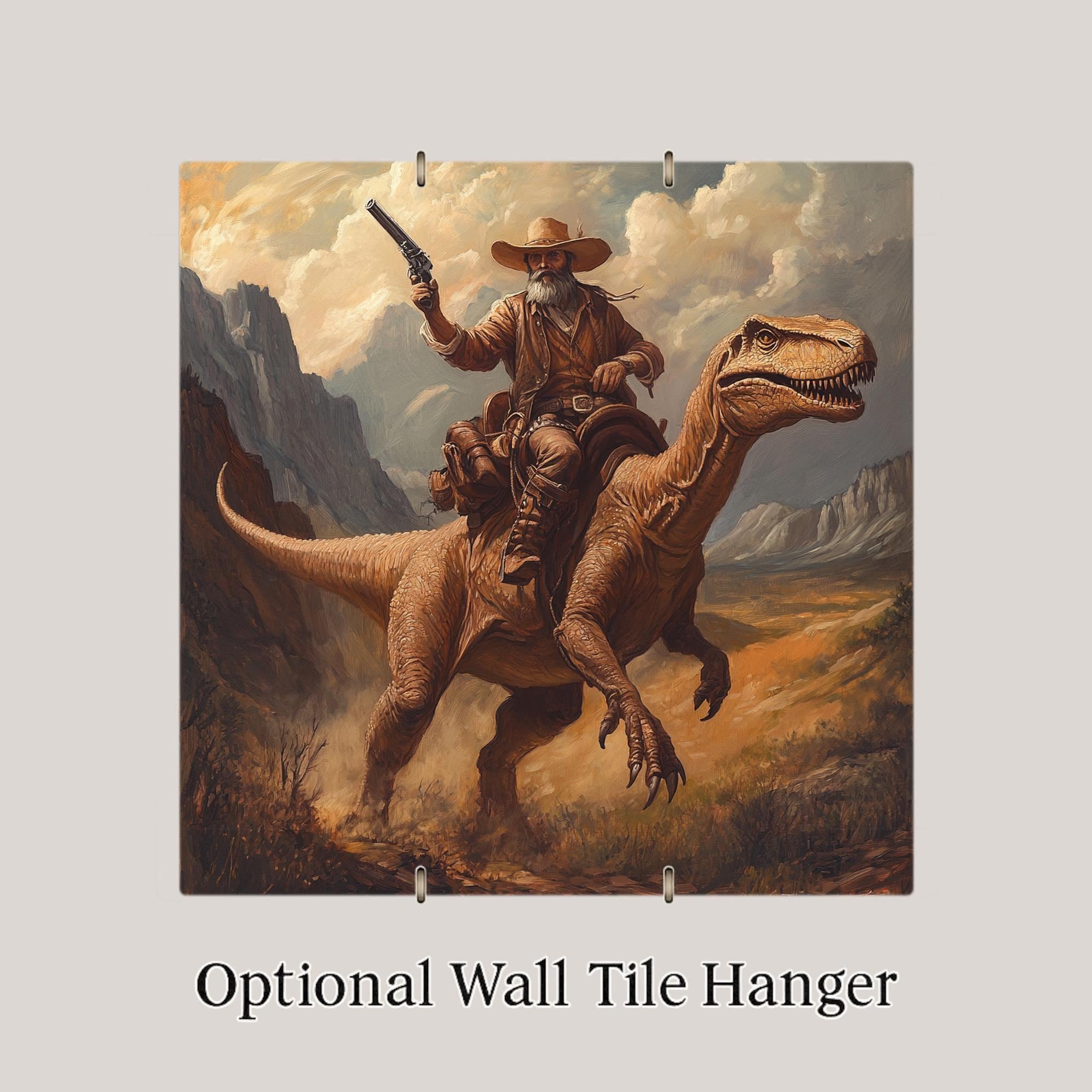 This Frontier Dinosaur Cowboy Tile Art is ideal for anyone who enjoys high-energy Western illustration, humorous mashups, and unique wall decor. The artwork shows a bearded cowboy gripping the reins of a velociraptor as they race across a rugged desert landscape surrounded by towering cliffs and stormy skies. The painterly brushwork and warm frontier tones create a cinematic Western mood that blends seamlessly with the dinosaur’s fierce energy.