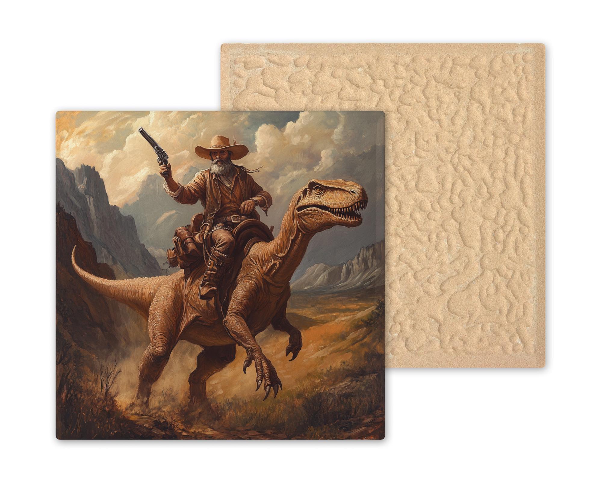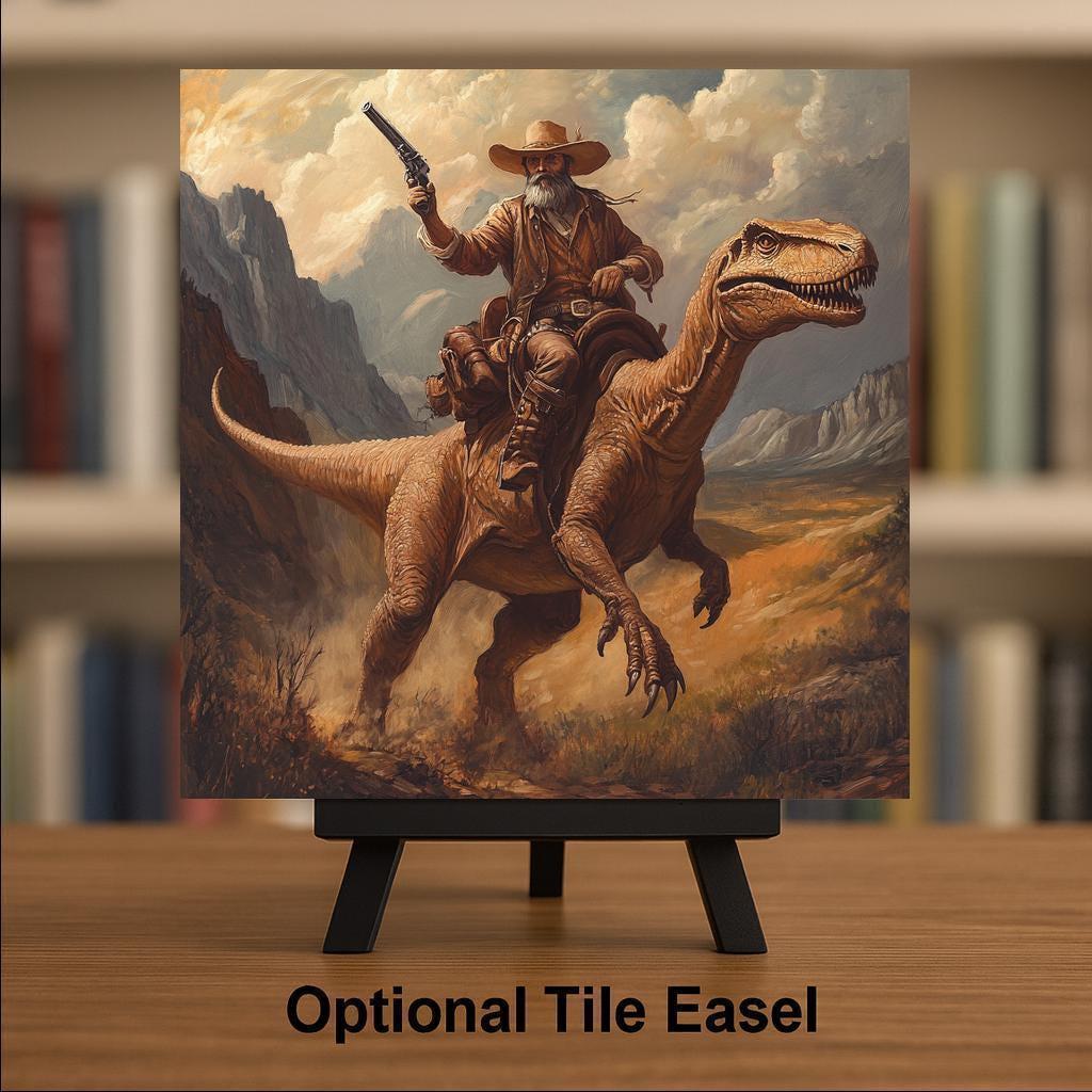 This tile makes an excellent gift for Western art fans, dinosaur collectors, sci-fi lovers, and anyone who appreciates imaginative and bold home decor. The adventurous composition brings humor and wild energy to themed rooms, offices, man caves, game rooms, and eclectic wall decor arrangements.