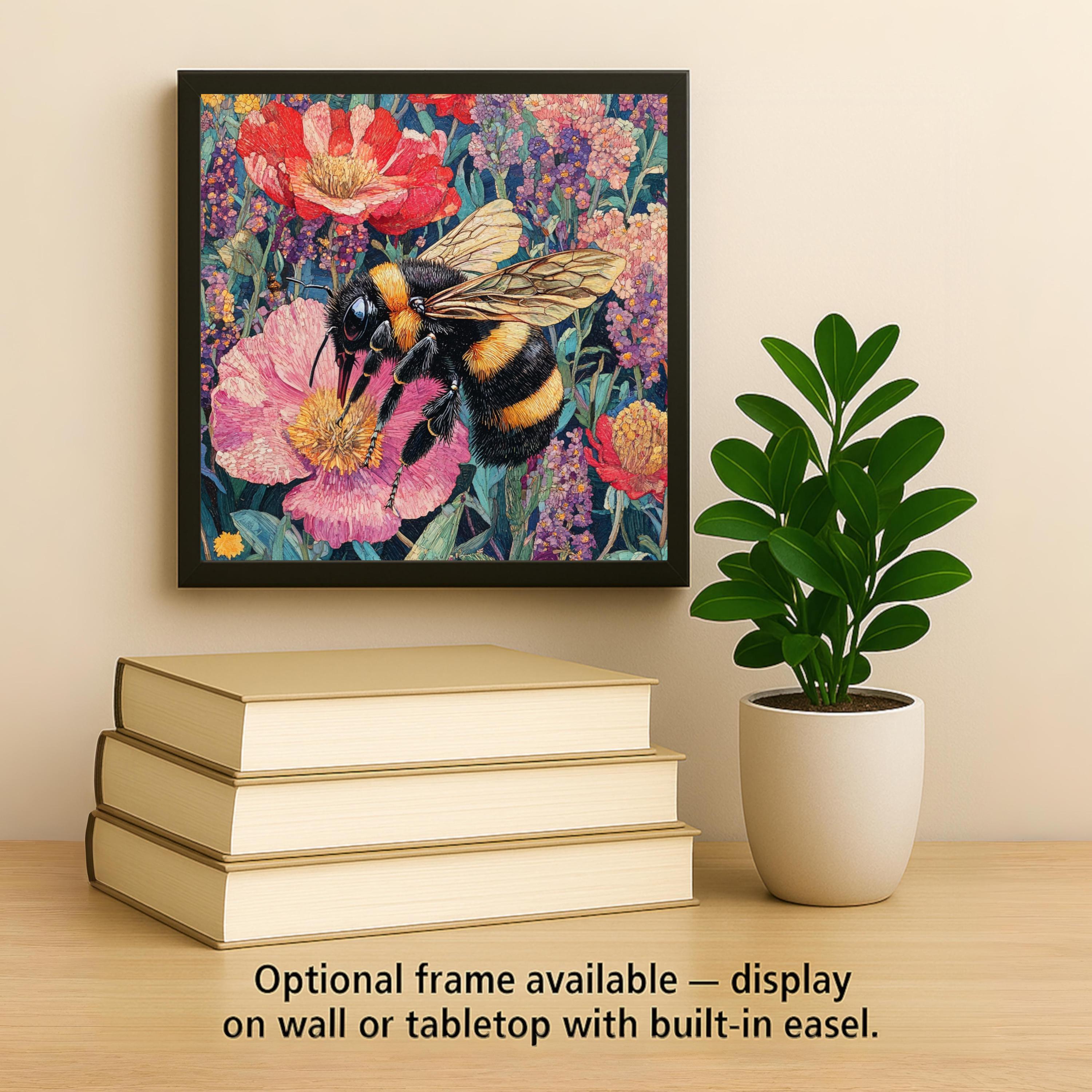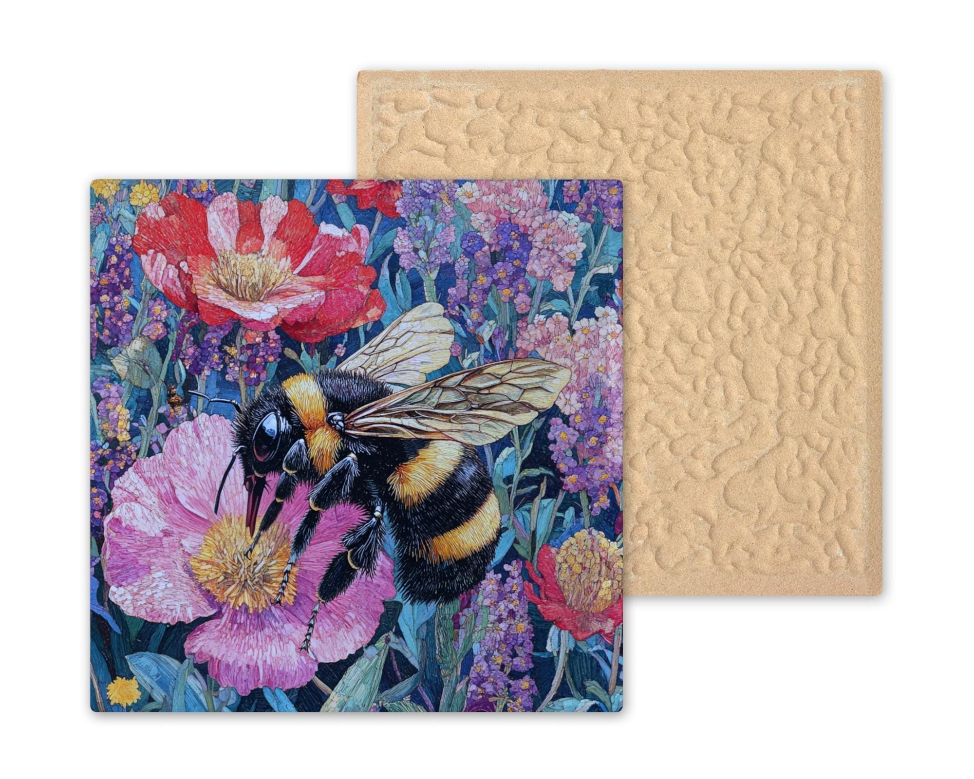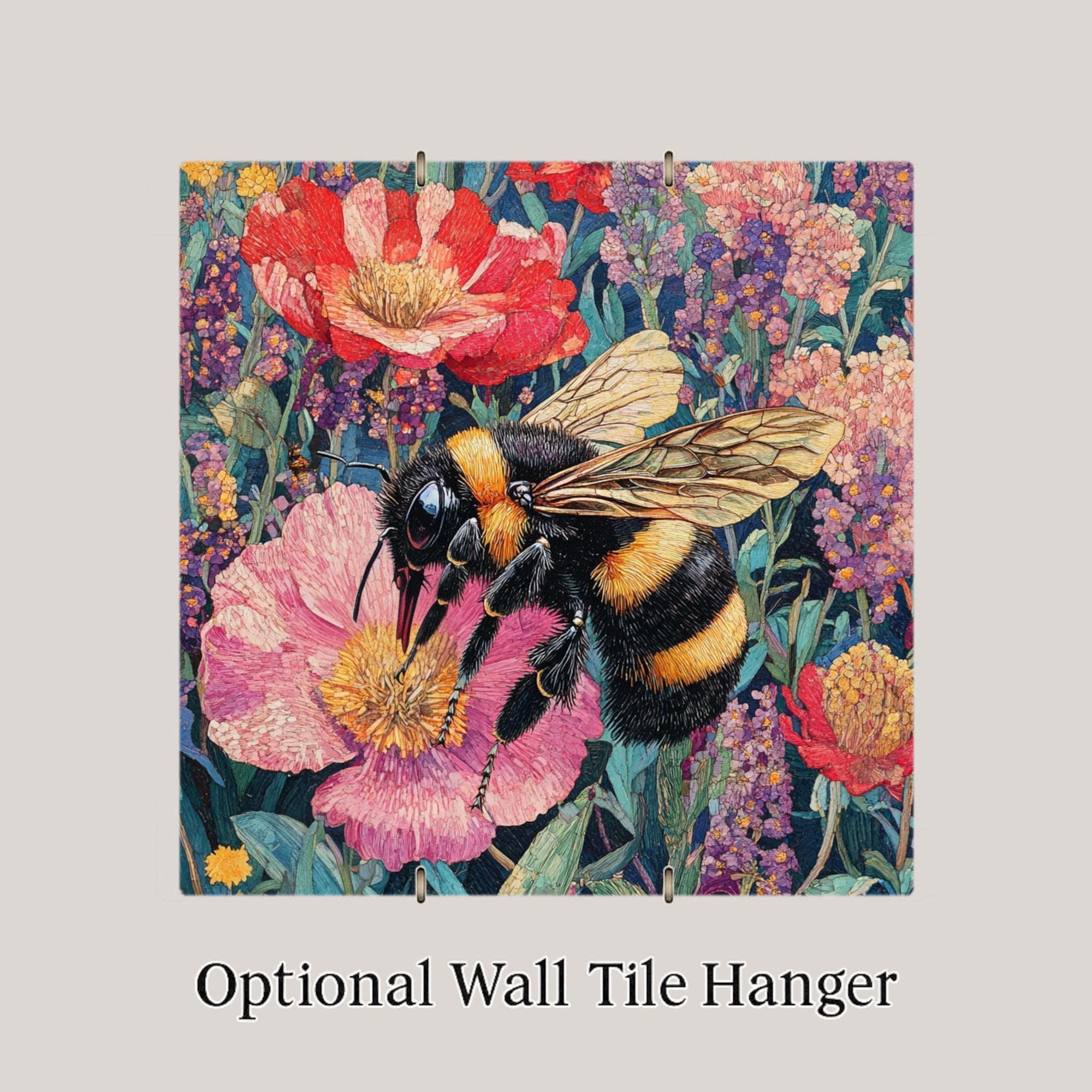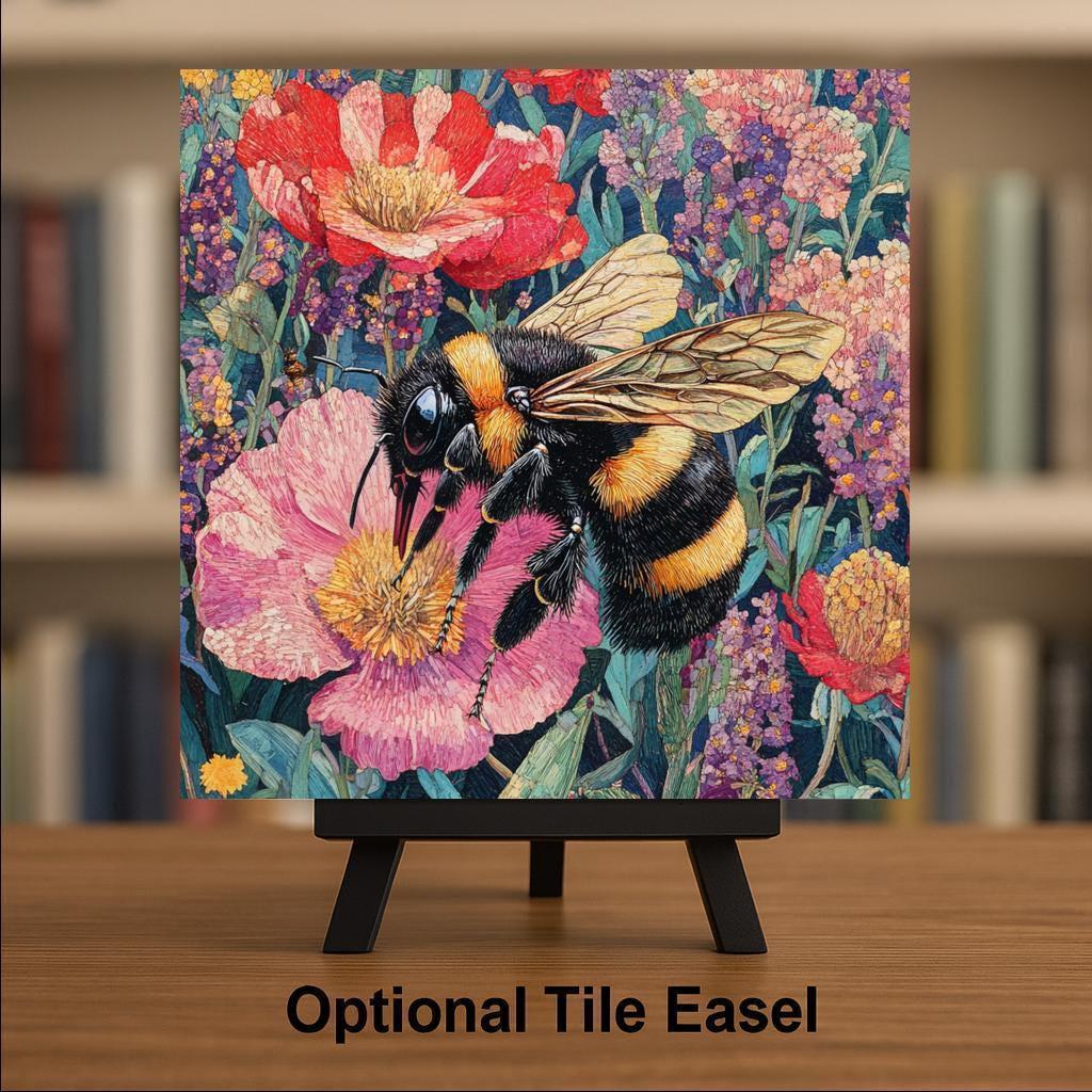 The bee’s wings are finely drawn with a golden shimmer, while the flower petals show texture and depth. The whole tile feels alive and joyful, like a piece of a summer meadow frozen in time. The floral palette includes blues, reds, purples, and soft greens — warm and lively without being too bright.