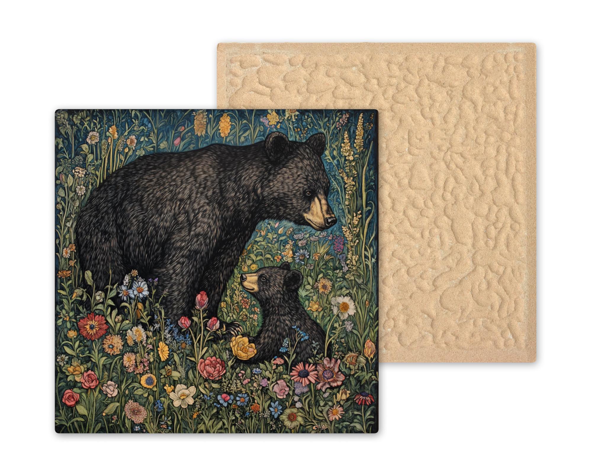 Bring the enchanting beauty of Art Nouveau and William Morris to your space with this woodland-inspired ceramic tile wall decor. Featuring a pair of black bear lovers in a vintage art style, this cute baby bear cub coaster doubles as a functional trivet. Add a touch of timeless charm to your home with this unique piece.
