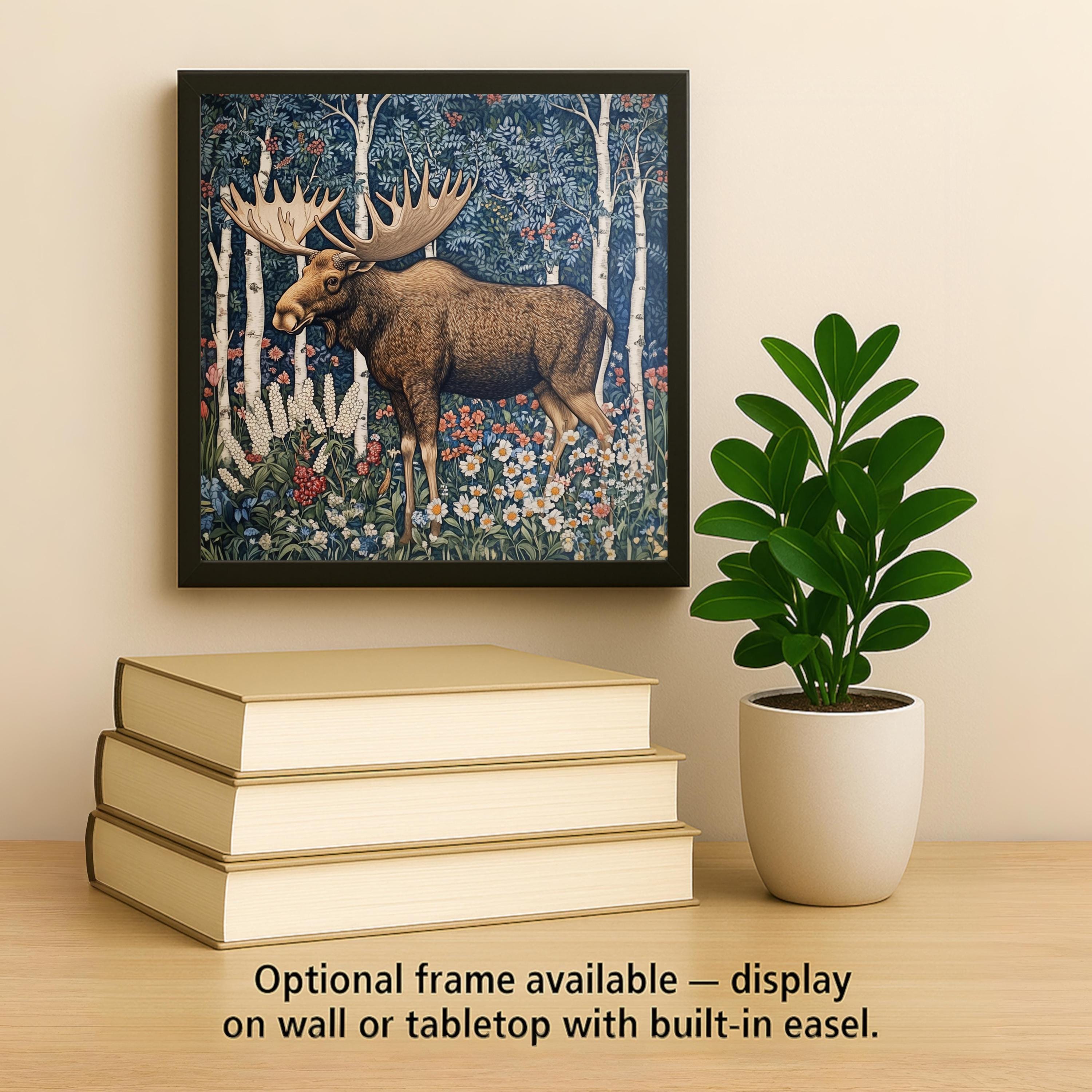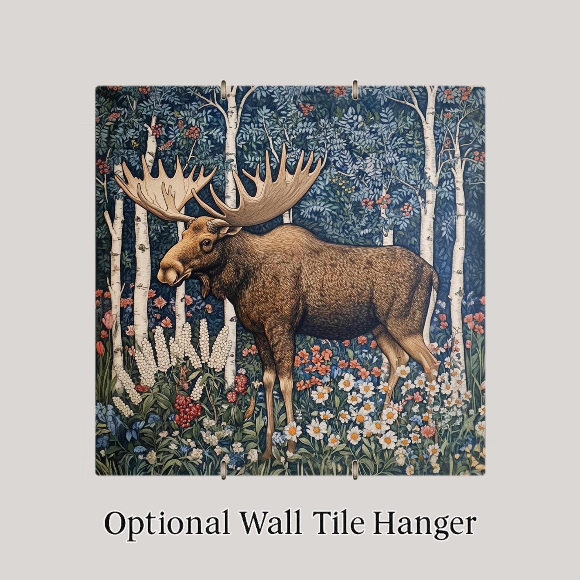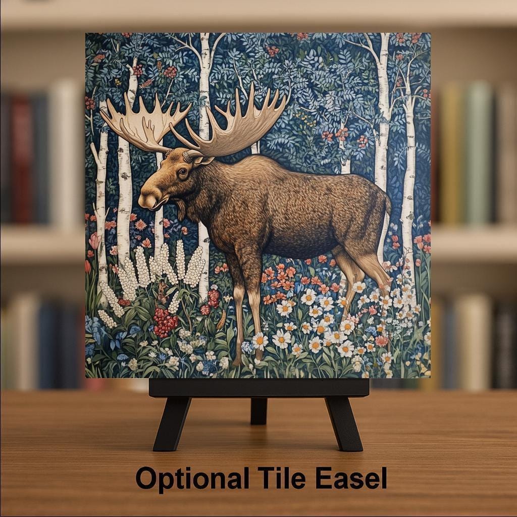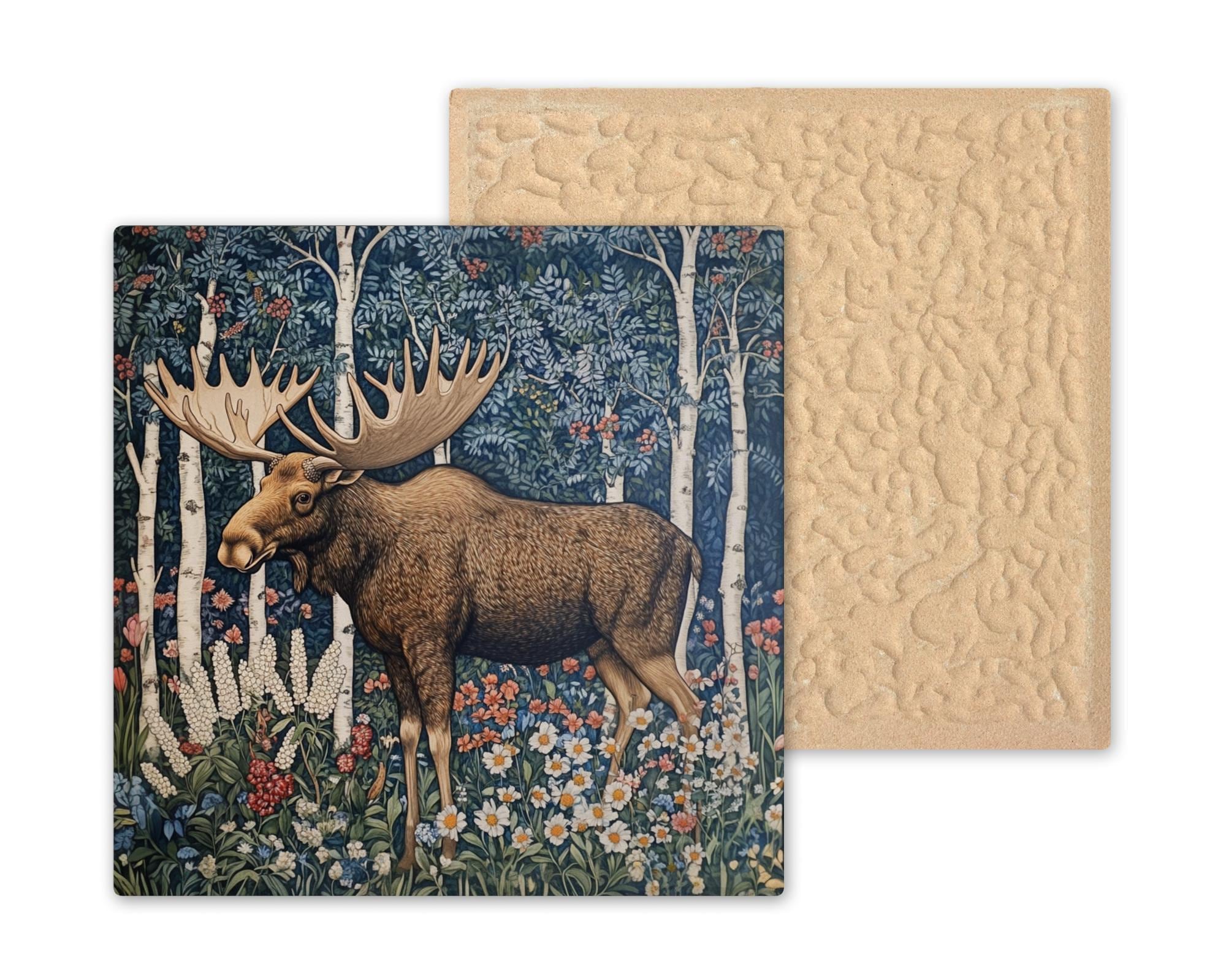 This ceramic tile features a powerful moose standing tall in a forest of birch trees and wildflowers. The style is inspired by the detailed patterns of William Morris, blending the beauty of the wilderness with the flowing lines of Art Nouveau design.