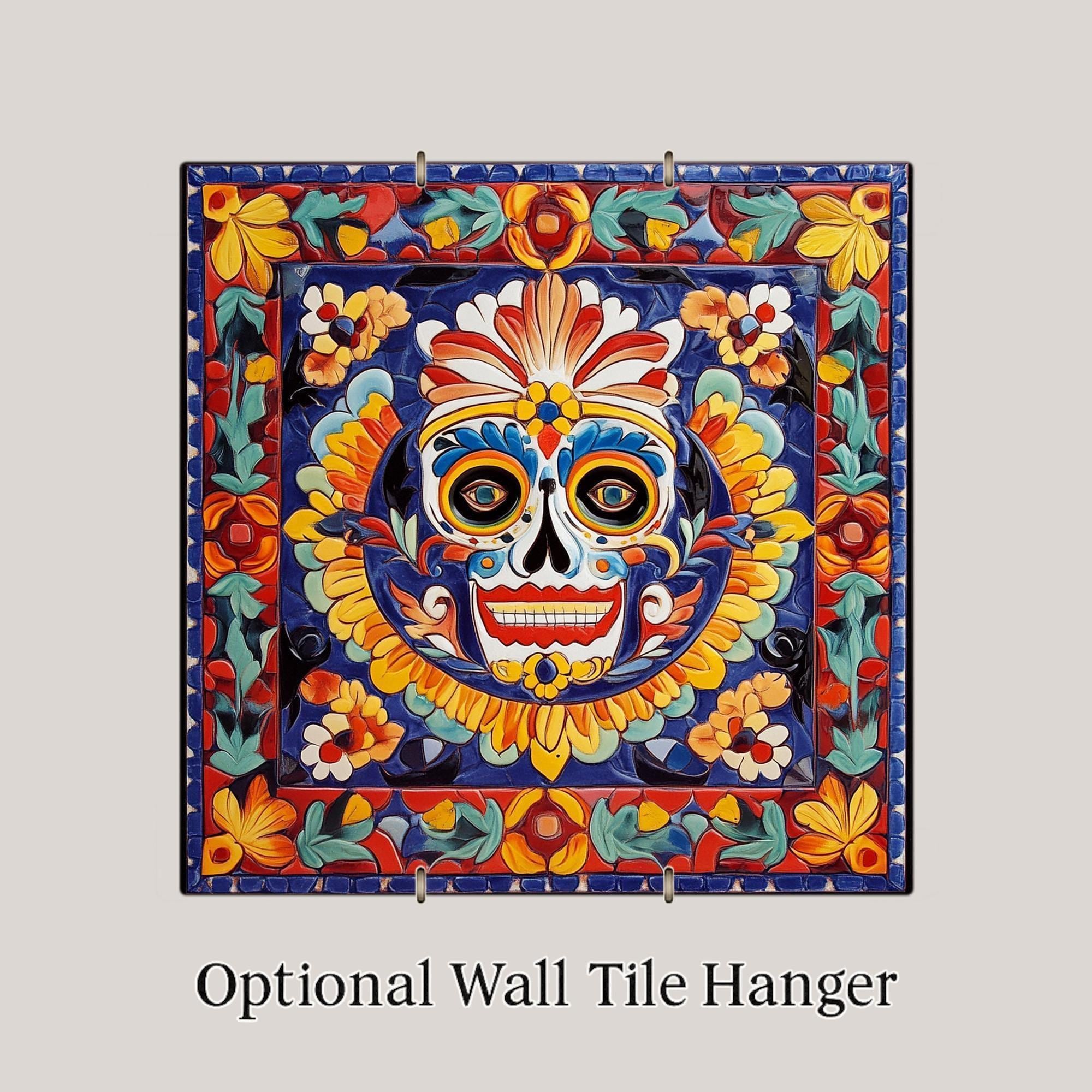 Celebrate Día de los Muertos in style with this Mexican Talavera sugar skull ceramic tile. This beautifully painted tile features a vibrant calavera design surrounded by a rainbow of florals, making it a striking addition to any room. The rich cobalt blue, crimson, and marigold hues are traditional to Talavera pottery, creating a folk-art masterpiece perfect for colorful homes.