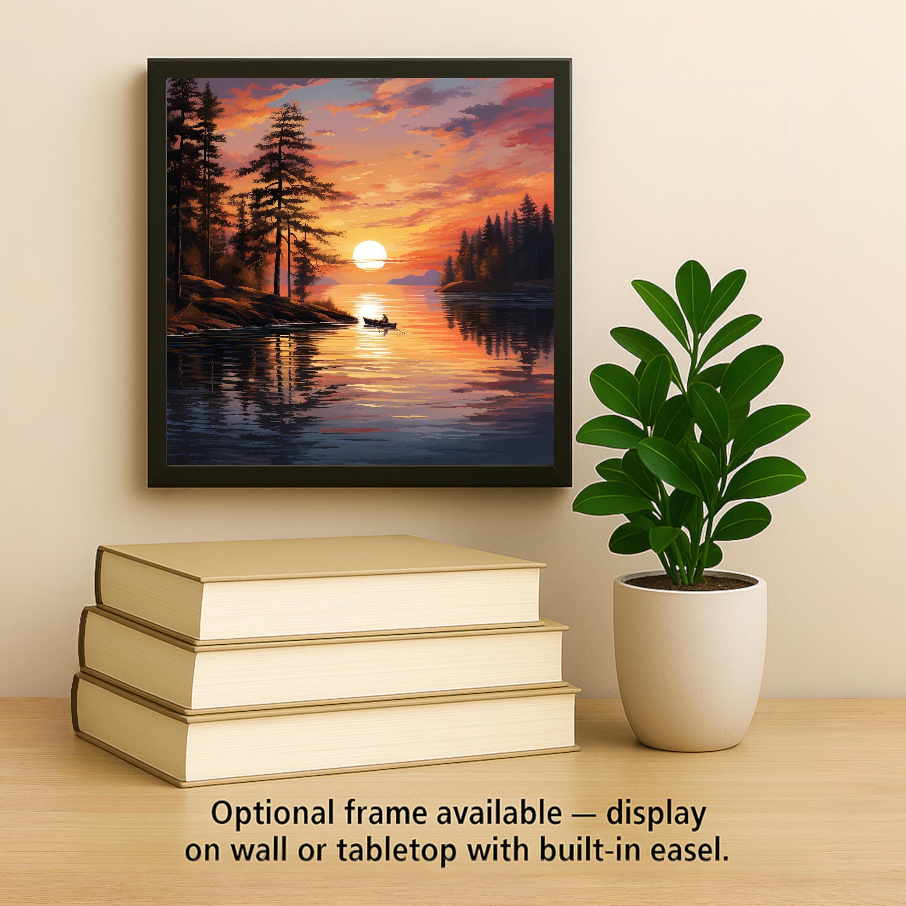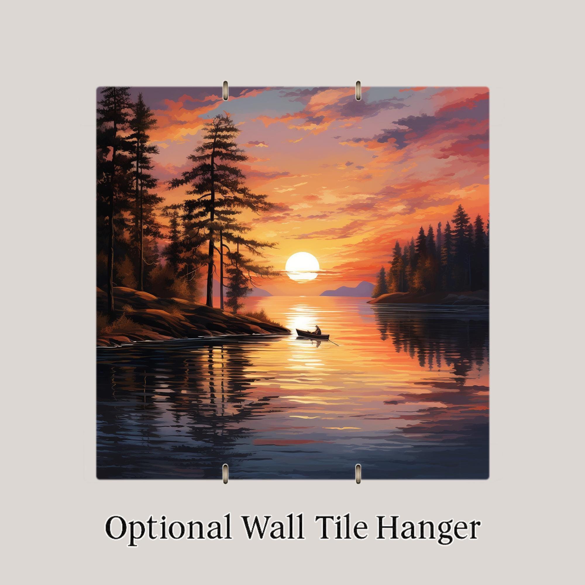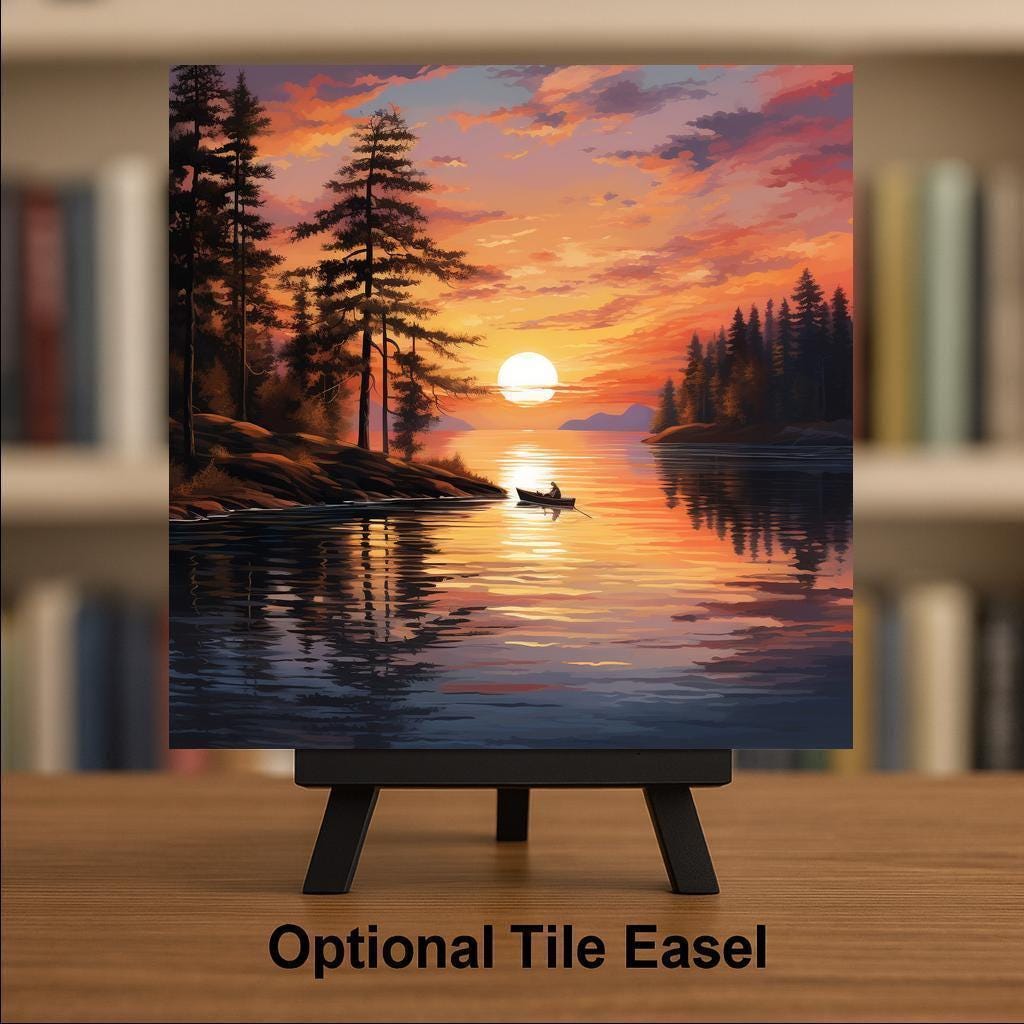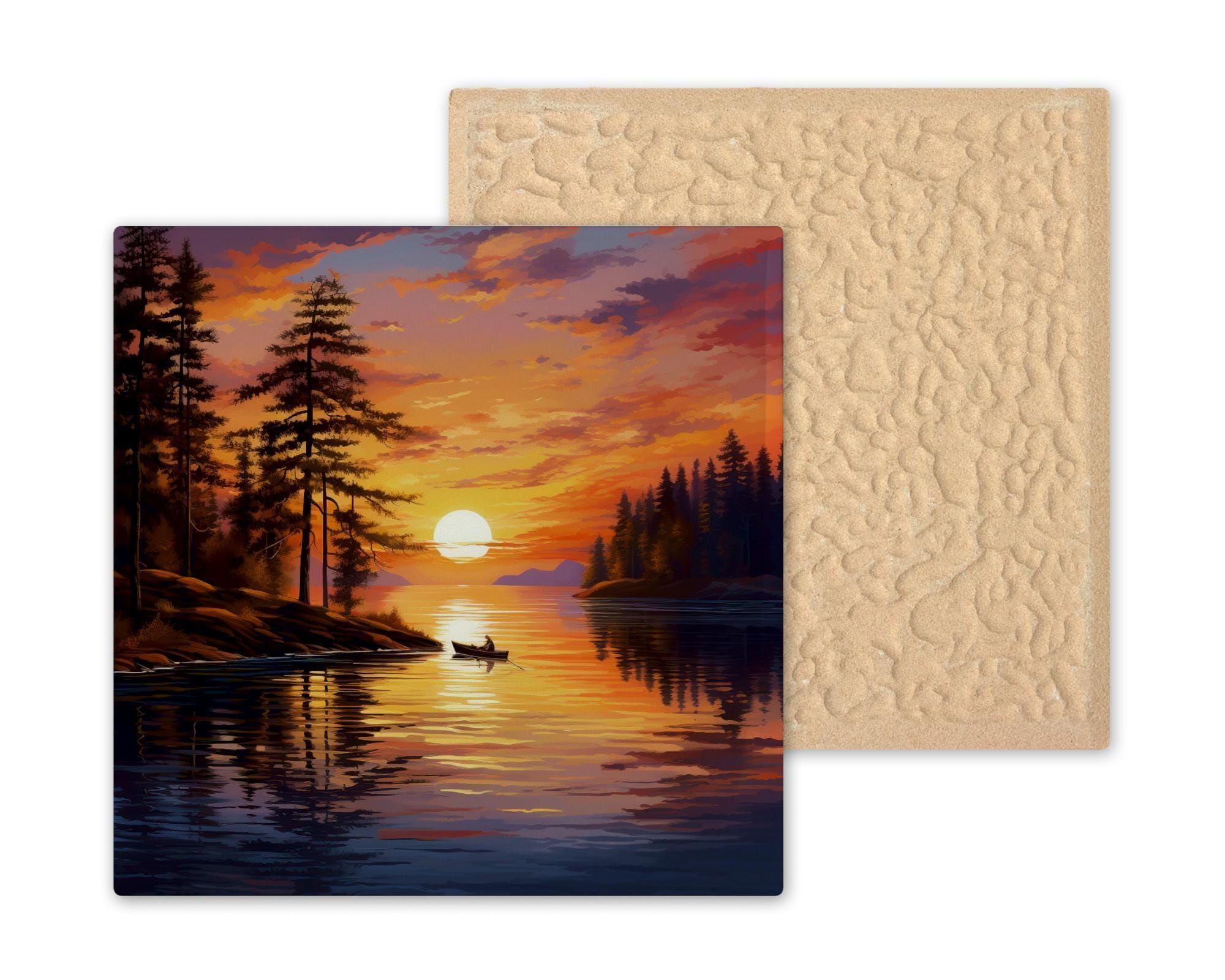 This serene ceramic tile captures the quiet magic of a sunset paddle on a forest lake. The glowing sun sits low on the horizon as a lone canoe floats through golden reflections. Tall trees frame the view, and rich colors sweep across the water — amber, orange, deep indigo, and hints of lavender in the sky. It’s peaceful, nostalgic, and full of natural charm.