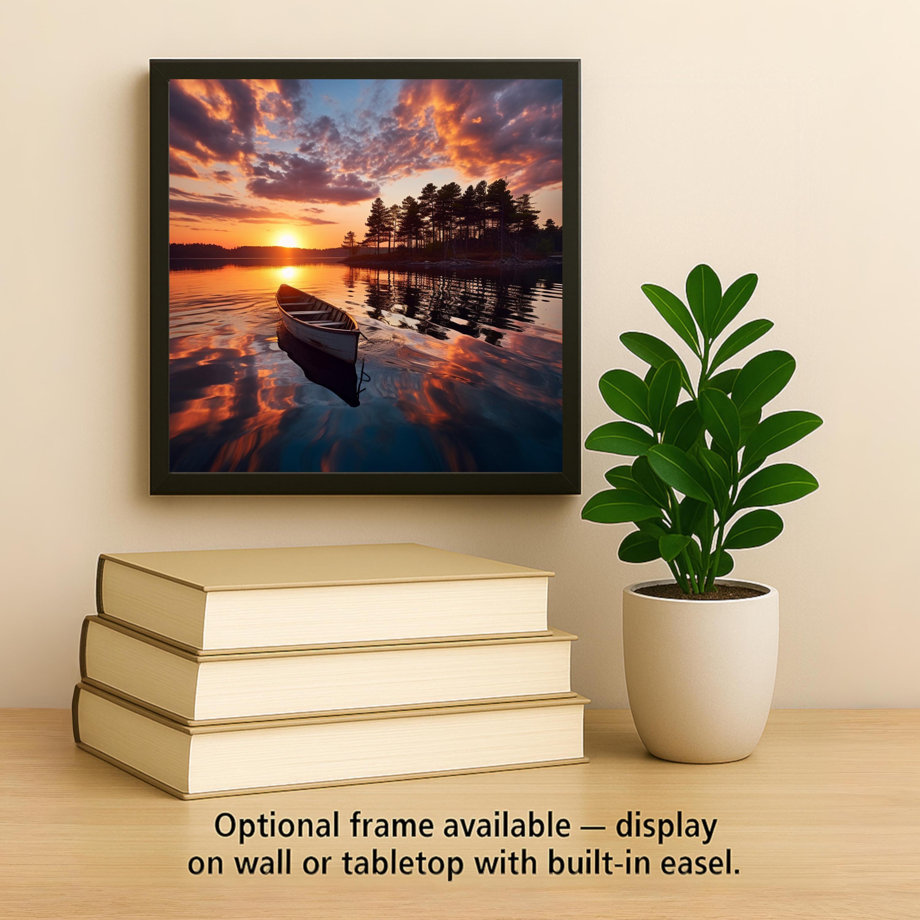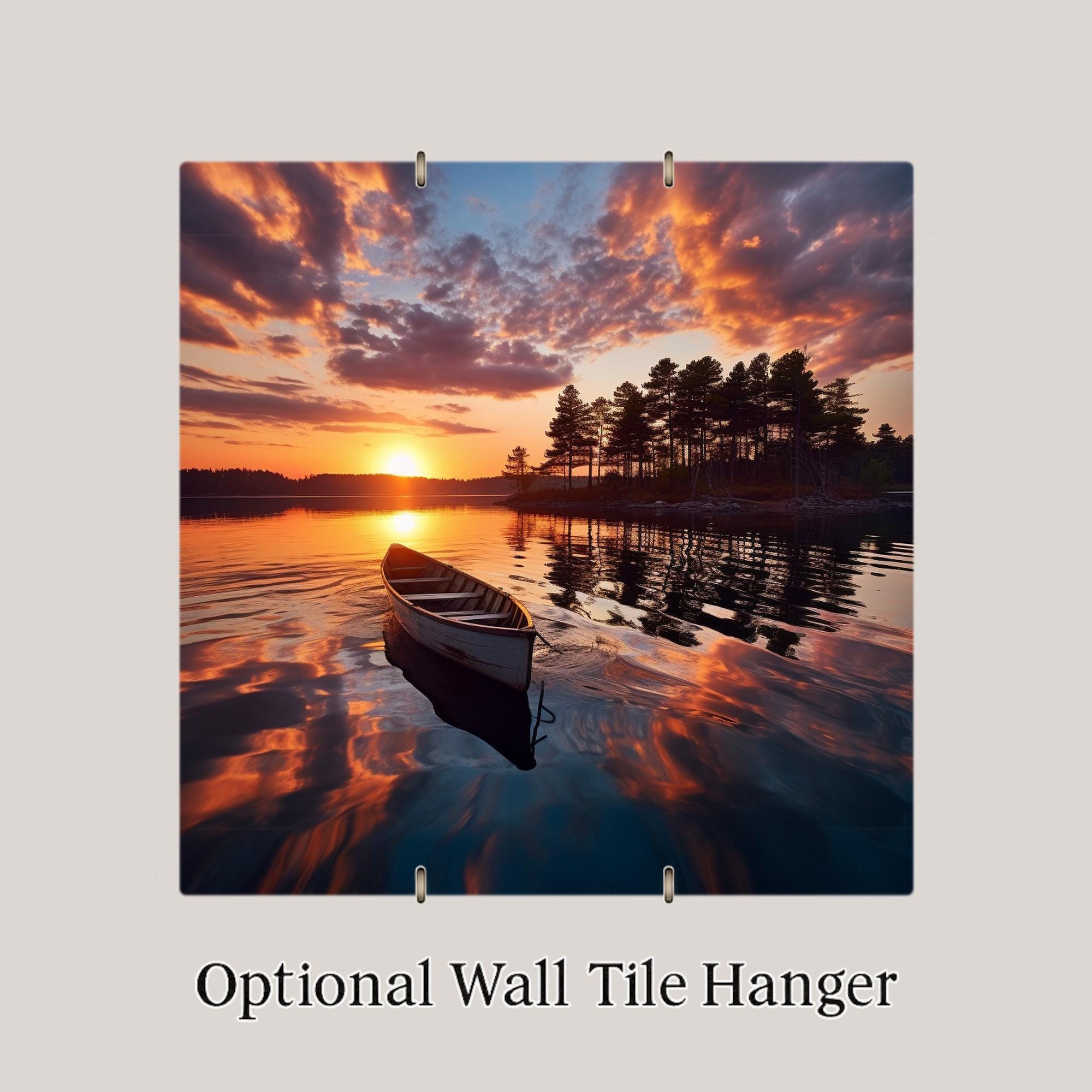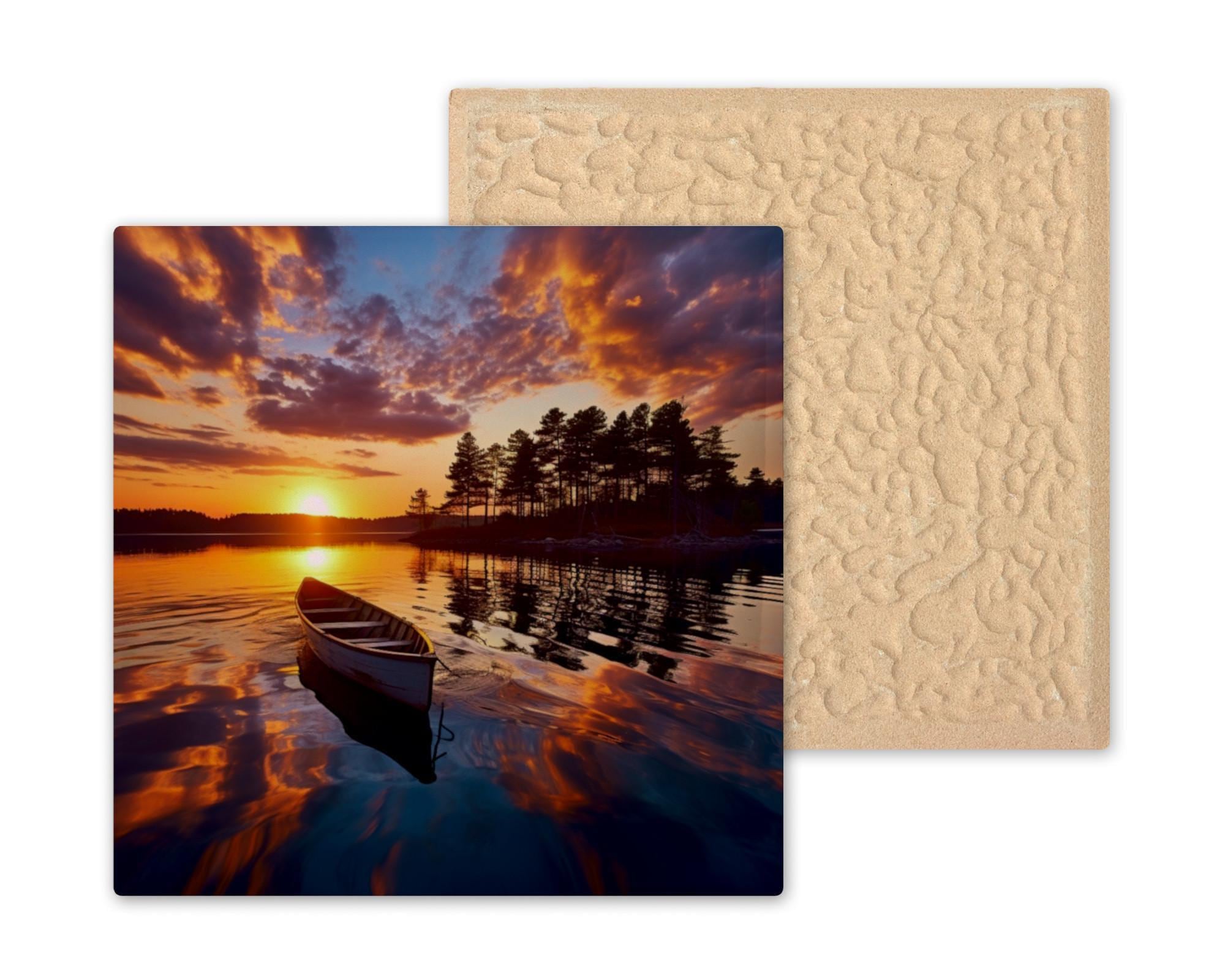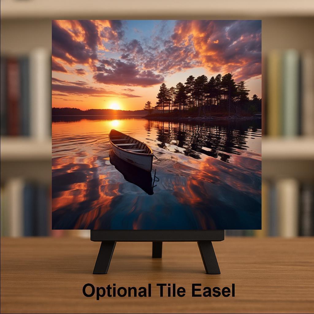 Bring the calm of a lakeside evening into your home with this ceramic tile featuring a serene canoe at sunset. The water reflects warm shades of orange, purple, and blue as the sun sets behind the trees. A lone canoe floats gently across the surface, creating a sense of quiet, reflection, and escape.