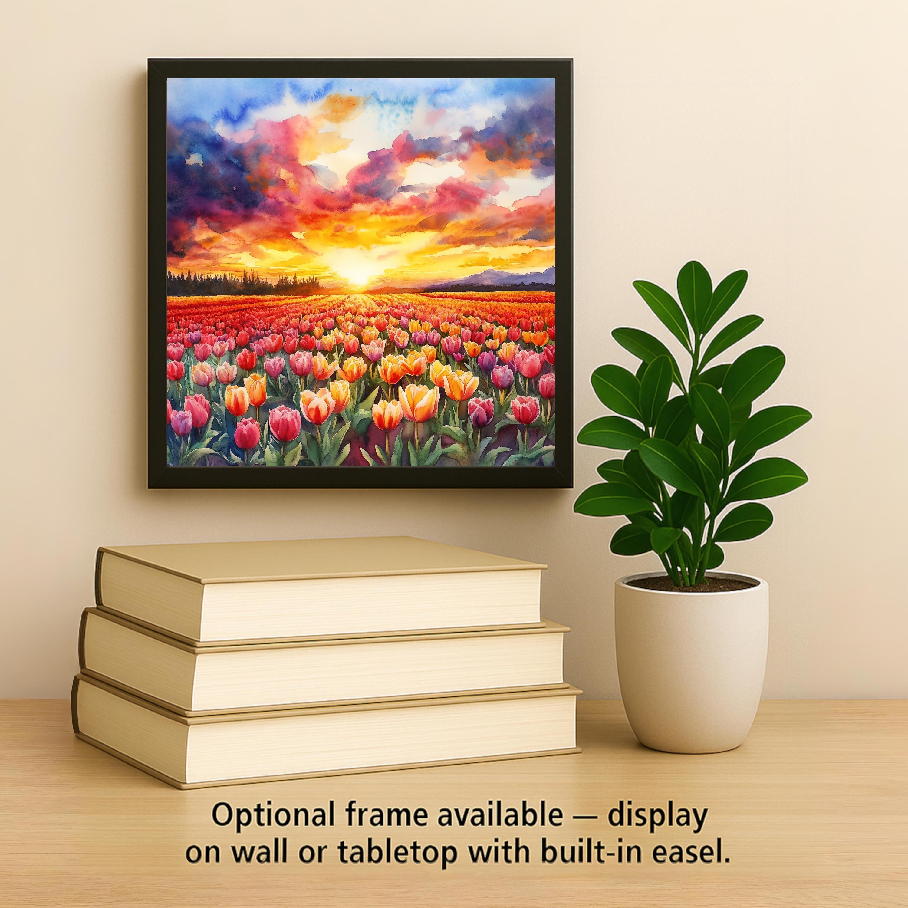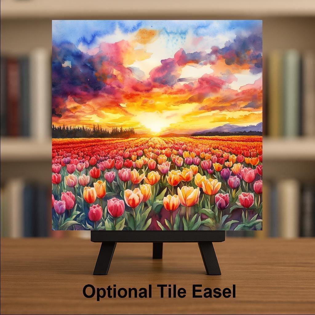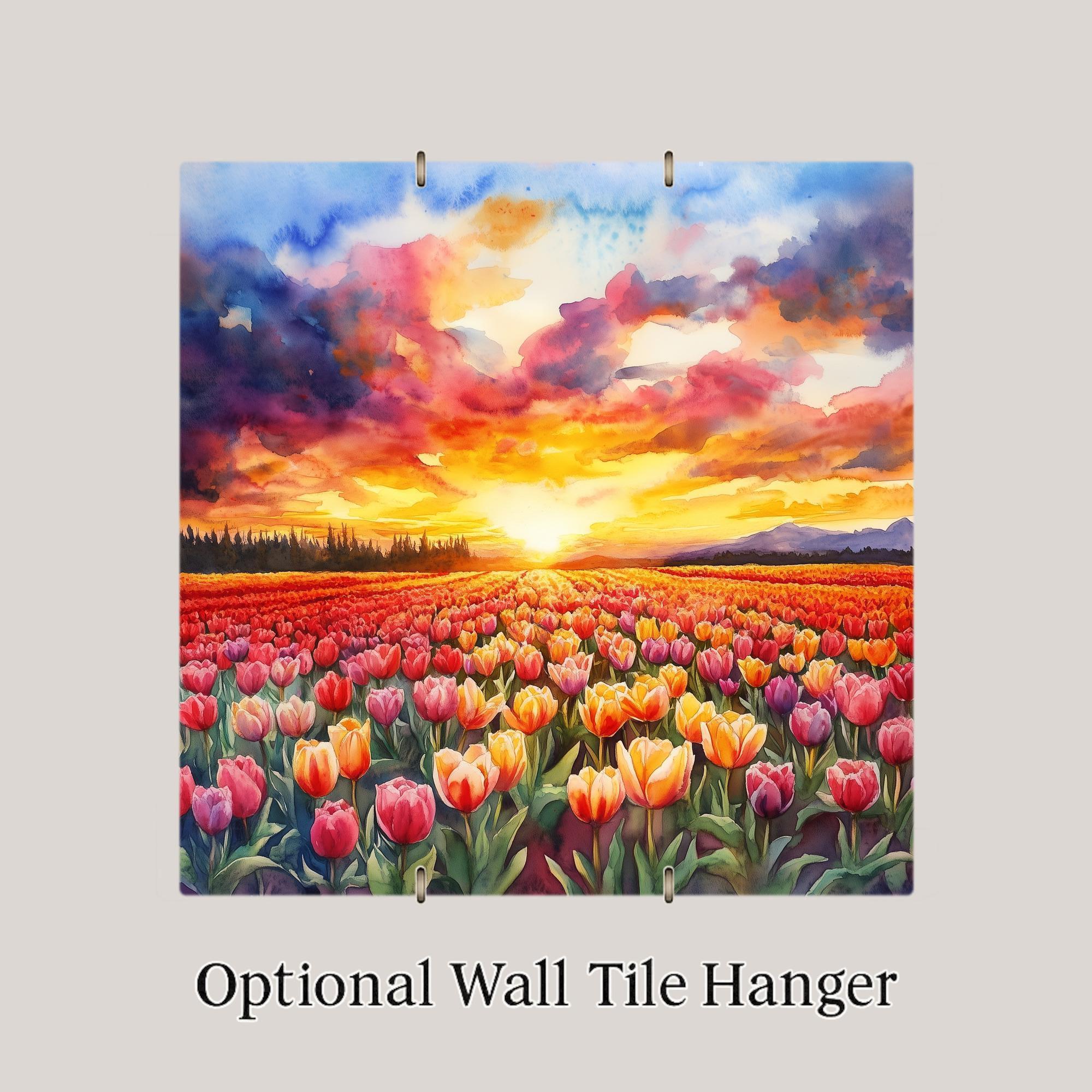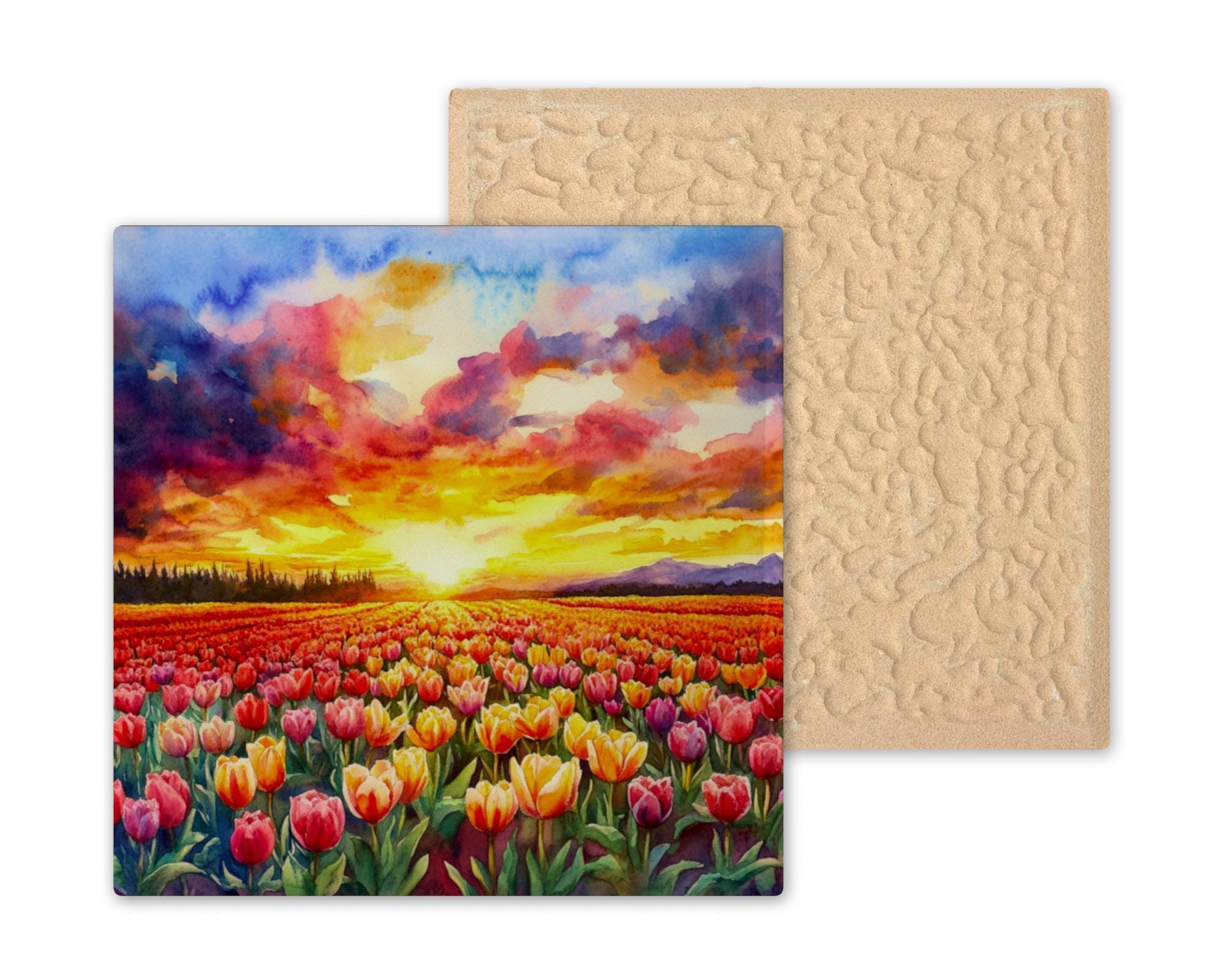 This ceramic tile brings the beauty of a spring tulip field to life in bright watercolor tones. Rows of tulips in red, pink, and golden yellow stretch across the ground, glowing under a warm orange and violet sunset. The sky is full of soft, swirling color, and the flowers below seem to stretch toward the fading light.
