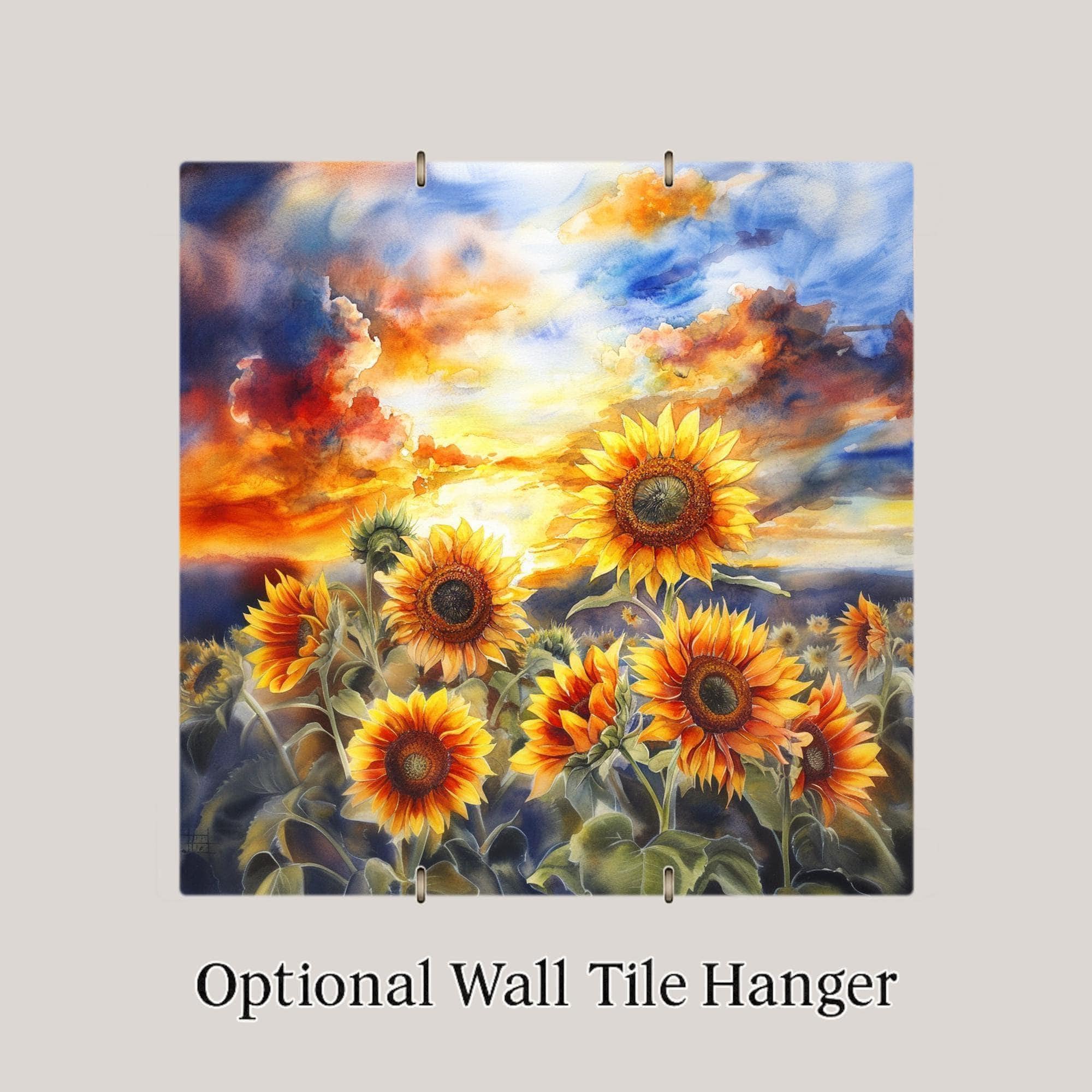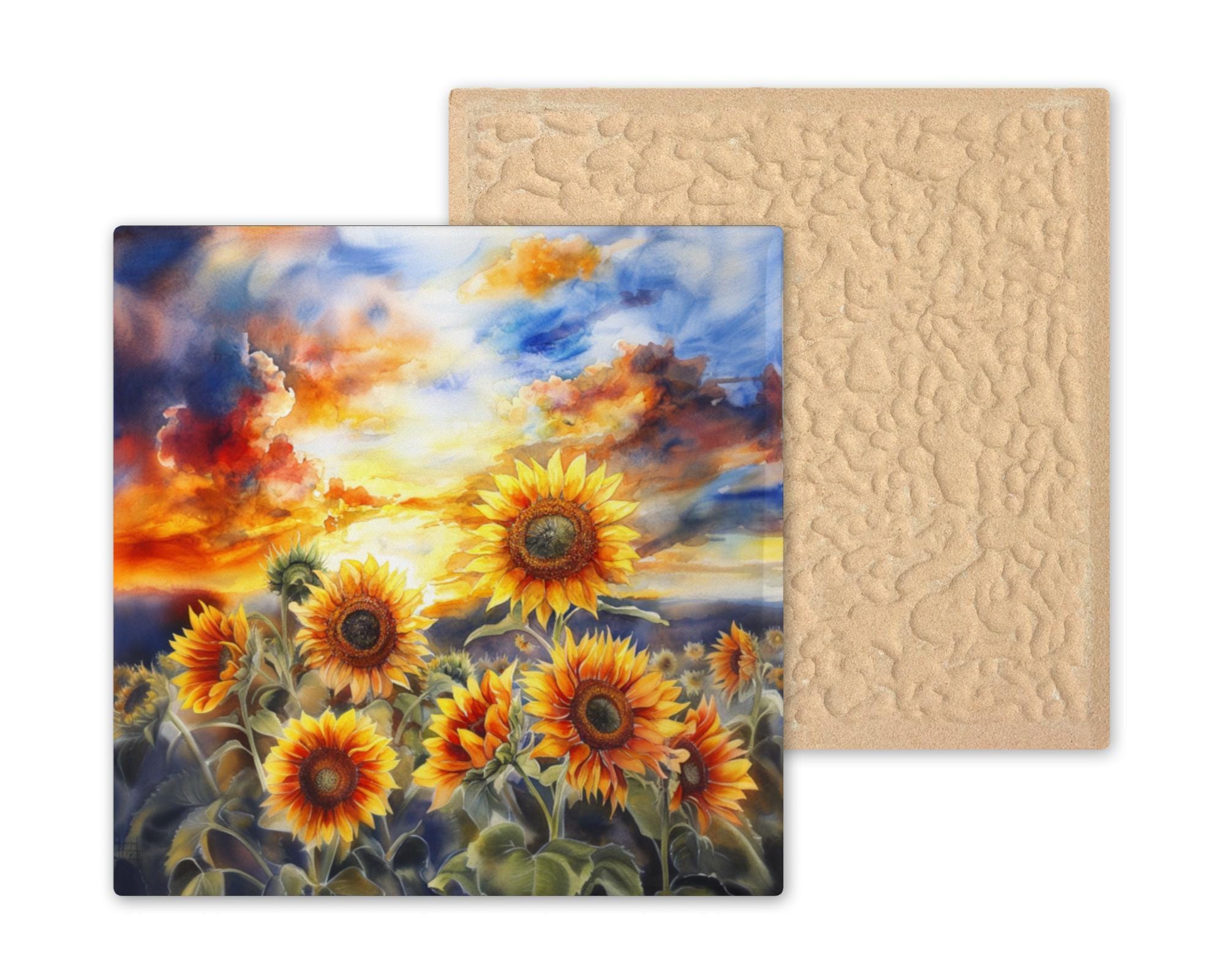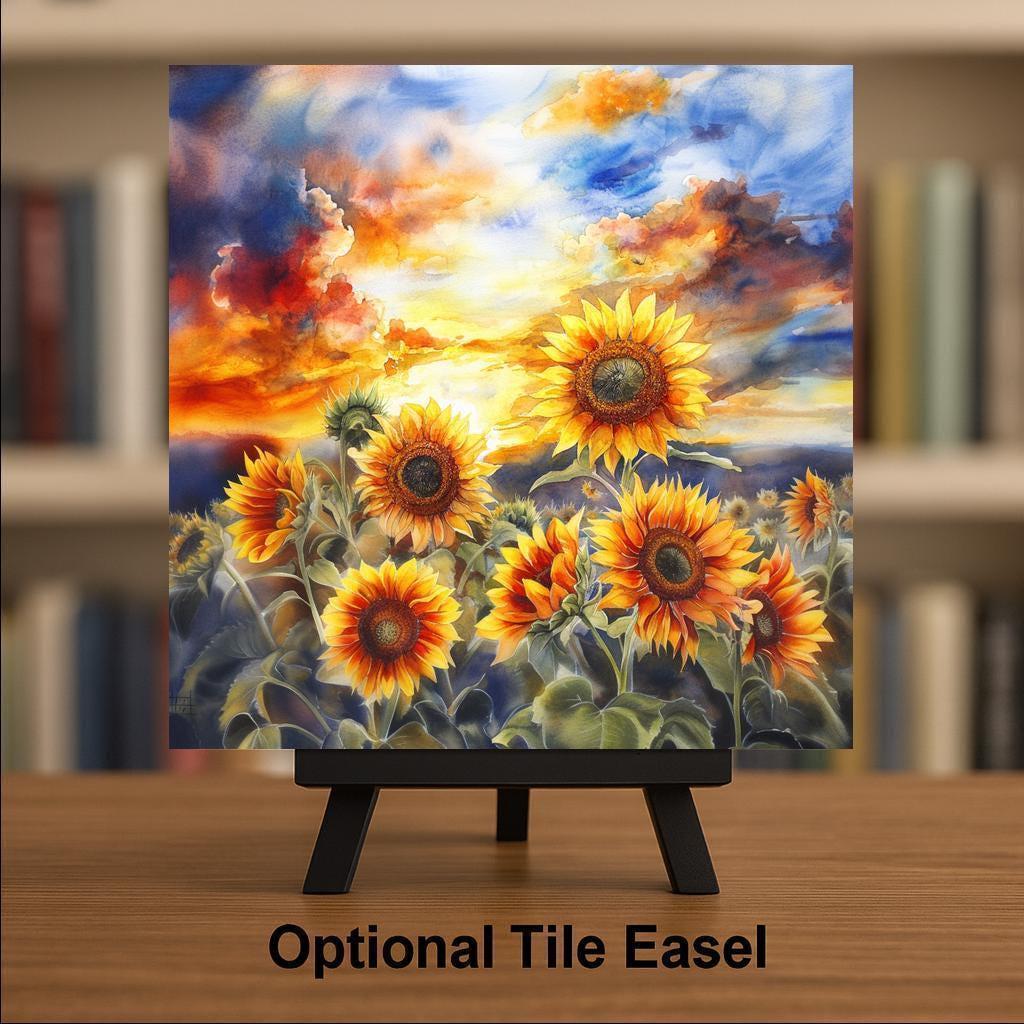 This ceramic tile features a field of sunflowers glowing in the light of a vivid watercolor sunset. The large blooms stretch across the foreground, with warm yellow petals and dark orange centers. The background sky is painted in flowing blends of orange, red, purple, and blue, giving the whole tile a soft, magical feeling.