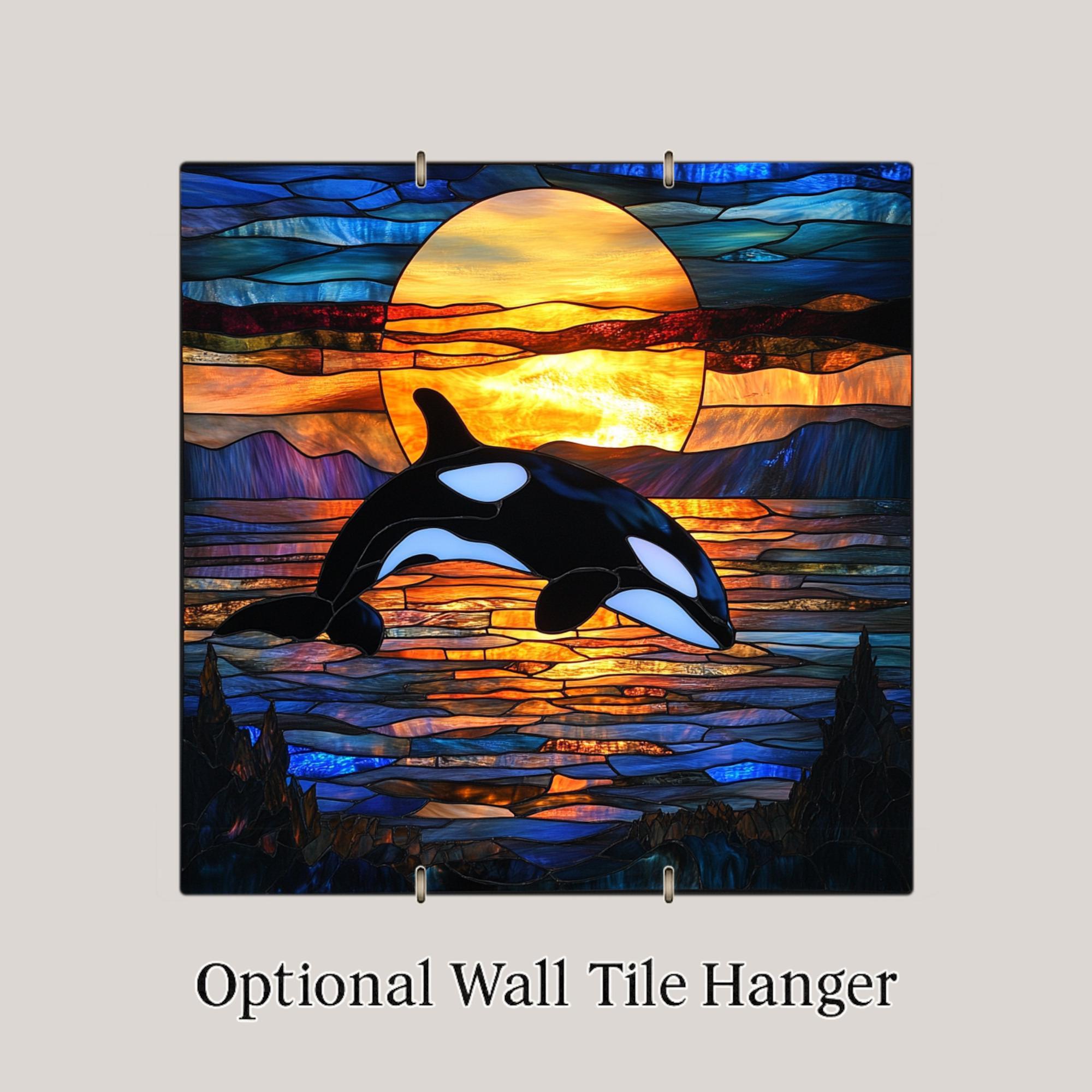Add a splash of color and movement to your space with this jumping orca tile — a perfect mix of stained glass charm and ocean-inspired style.