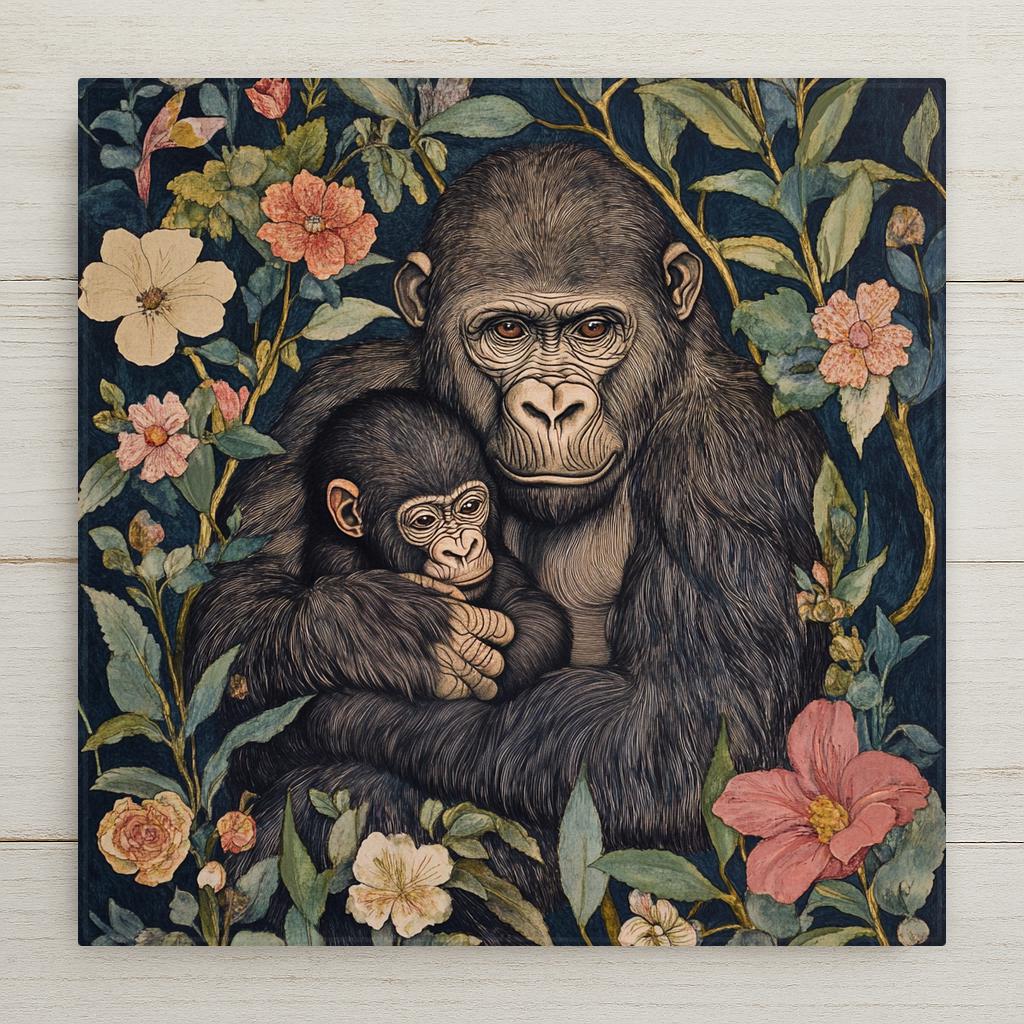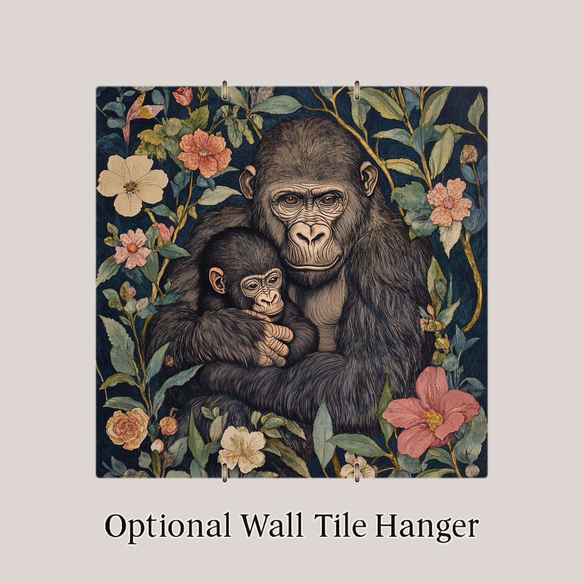 This beautiful ceramic tile shows a mother gorilla holding her baby in a loving embrace. They are surrounded by detailed flowers and leaves that look like they were taken straight from a storybook. The style is inspired by William Morris, with its natural curves and rich floral patterns.