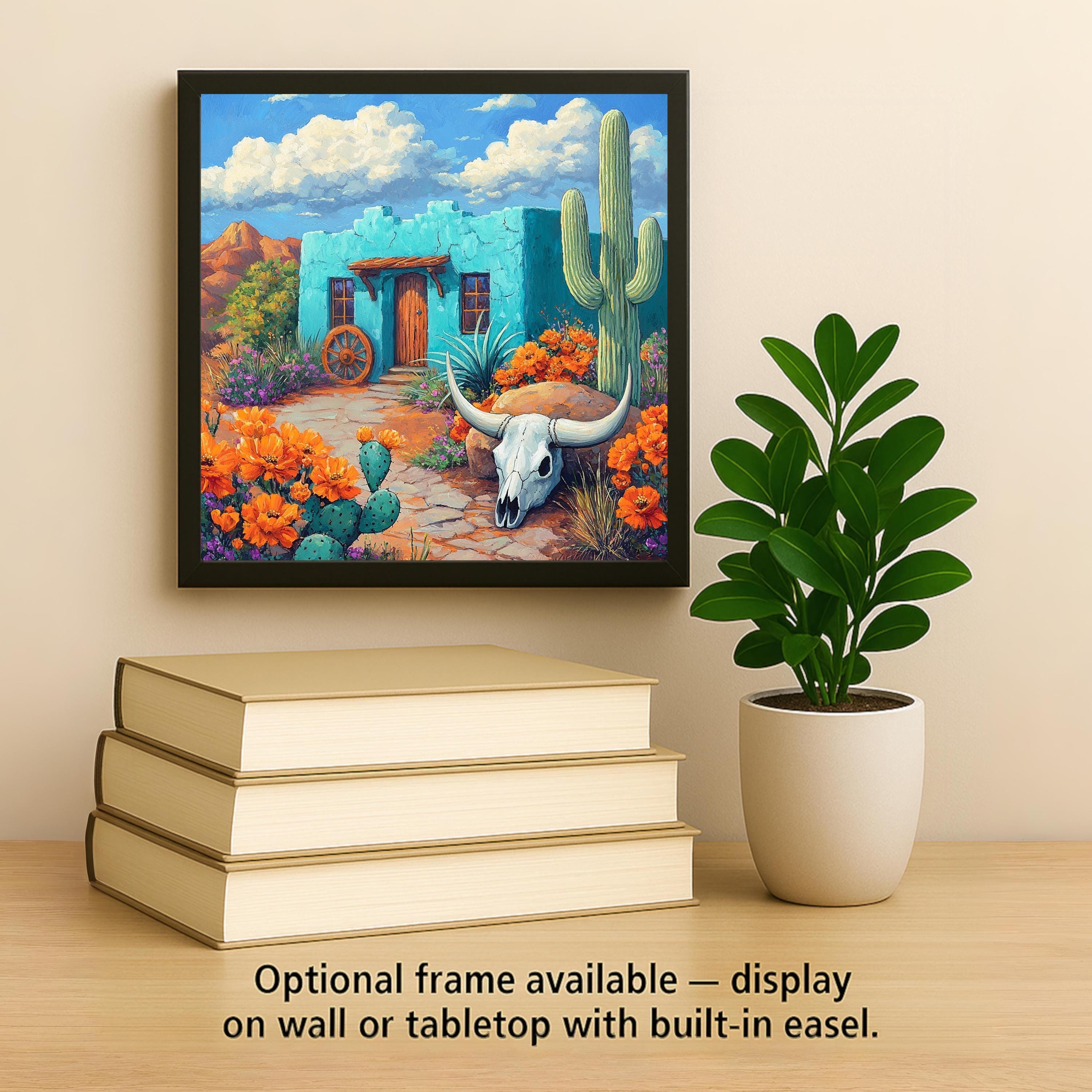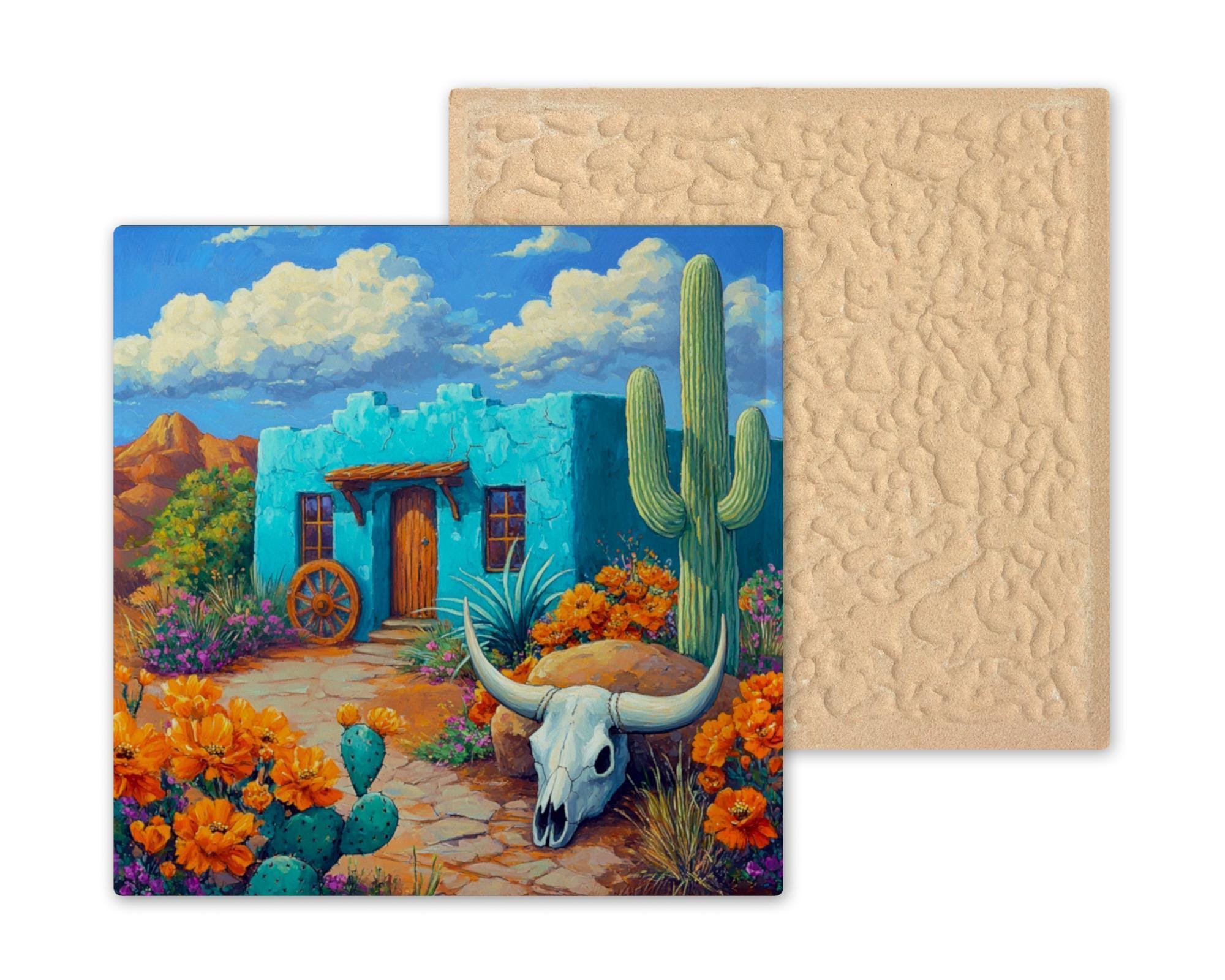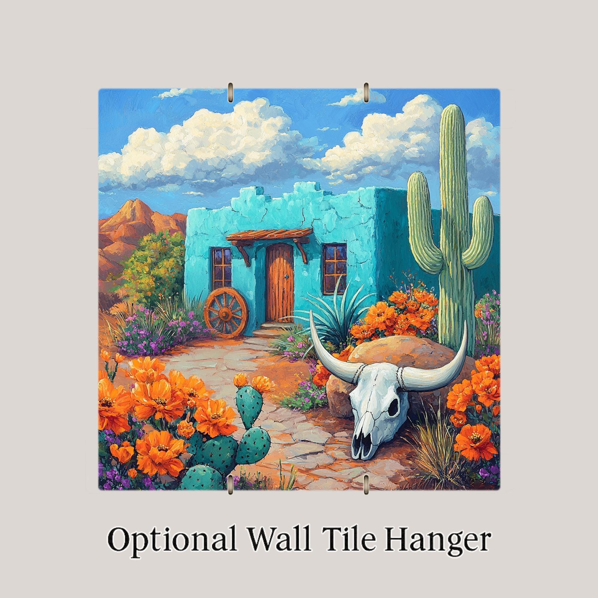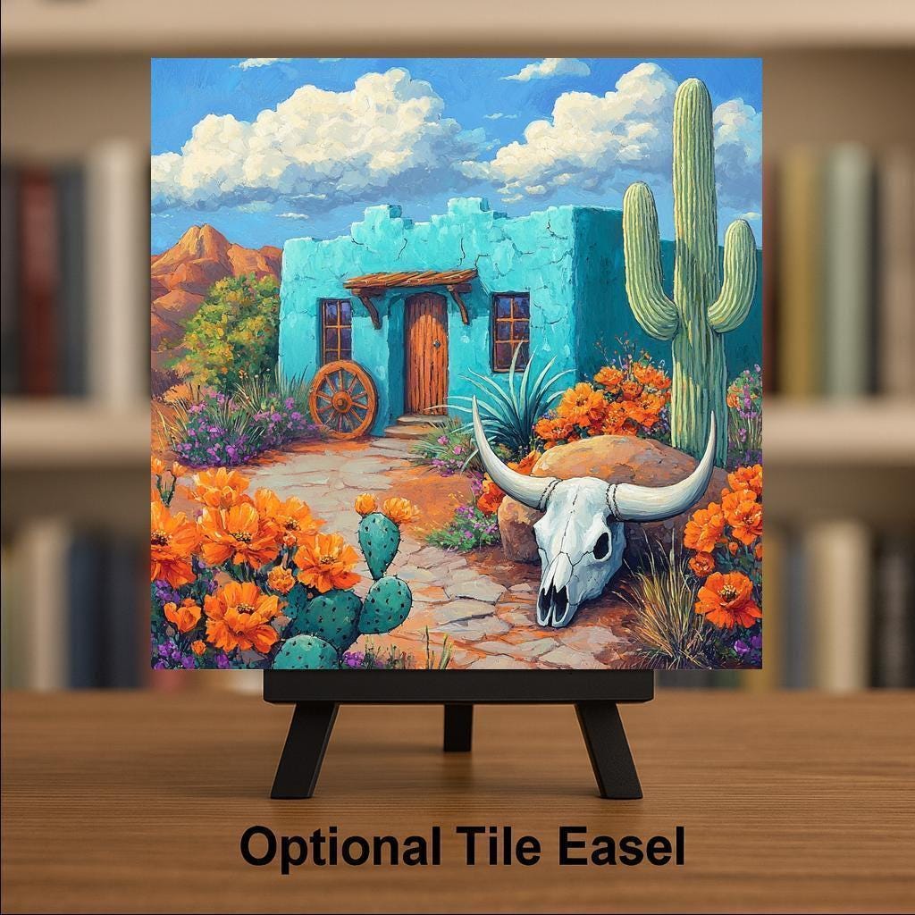 Celebrate desert life with this vibrant ceramic tile featuring a southwestern adobe house. The bright turquoise walls stand out against the orange flowers, golden earth tones, and deep blue skies. A longhorn skull rests near blooming cactus and desert brush, while tall saguaro cacti tower in the background. The entire scene feels warm, rustic, and full of life.
