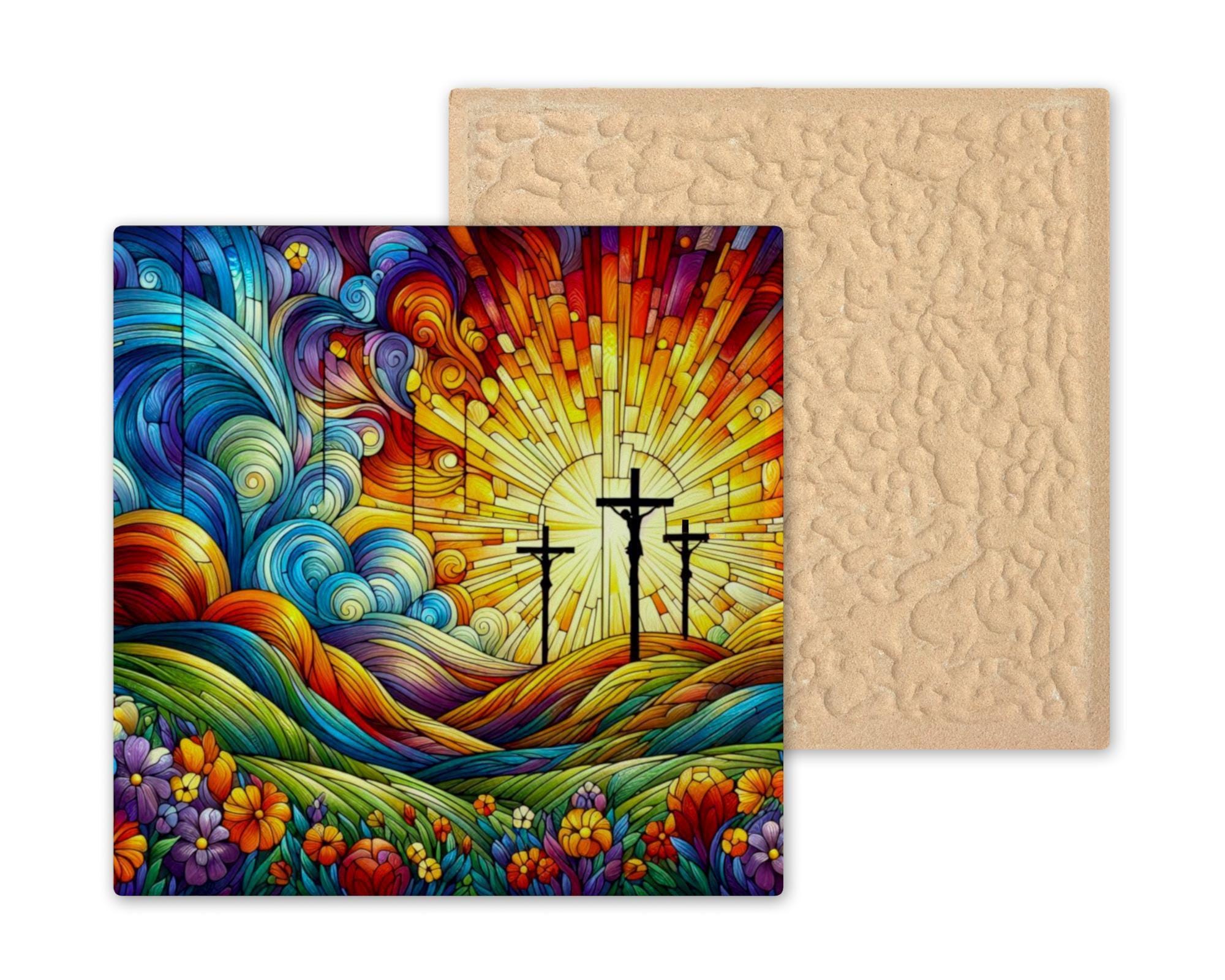 Infuse your space with vibrant faith using this stained glass-style ceramic tile depicting the three crosses on Calvary at sunrise. A radiant sun bursts from behind the central cross, casting golden rays across swirling skies and blooming fields. Inspired by traditional stained glass windows but modern in color and movement, this design is a powerful tribute to redemption, grace, and new beginnings.