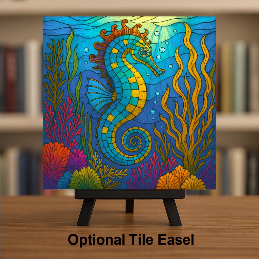 Customize your display with optional add-ons: a tile wall hanger for hanging, an easel tile stand for shelf display, or cork backing for resting safely on surfaces. This joyful seahorse brings a vibrant undersea fantasy to any room.