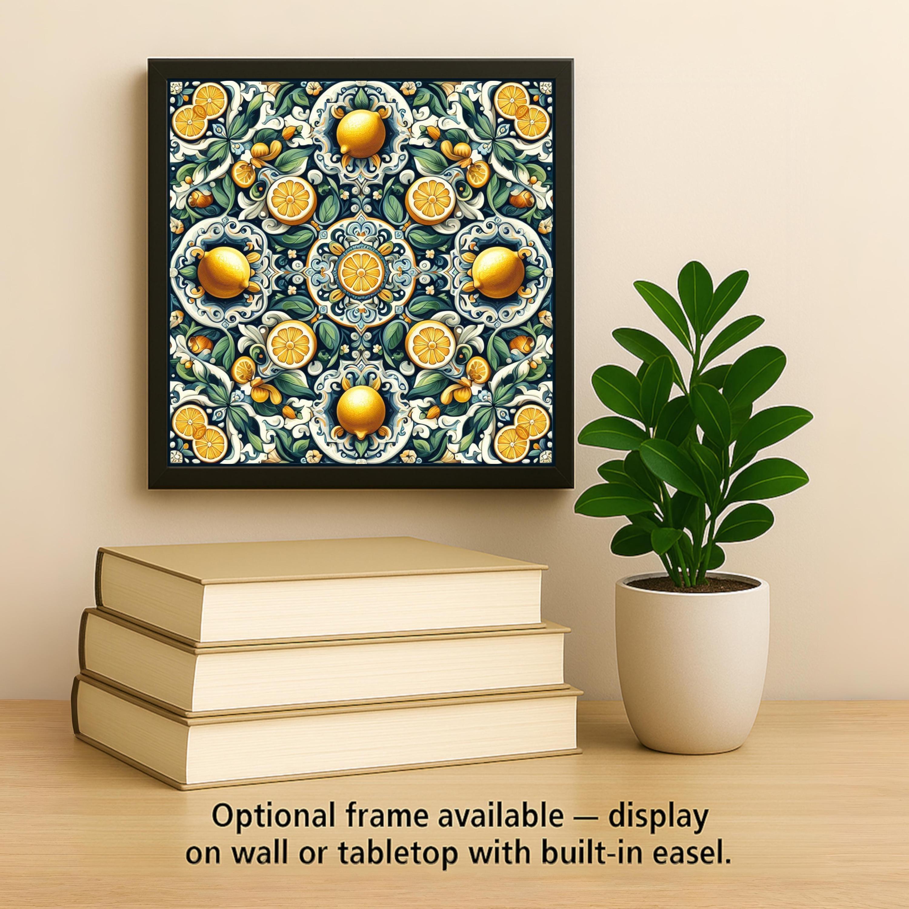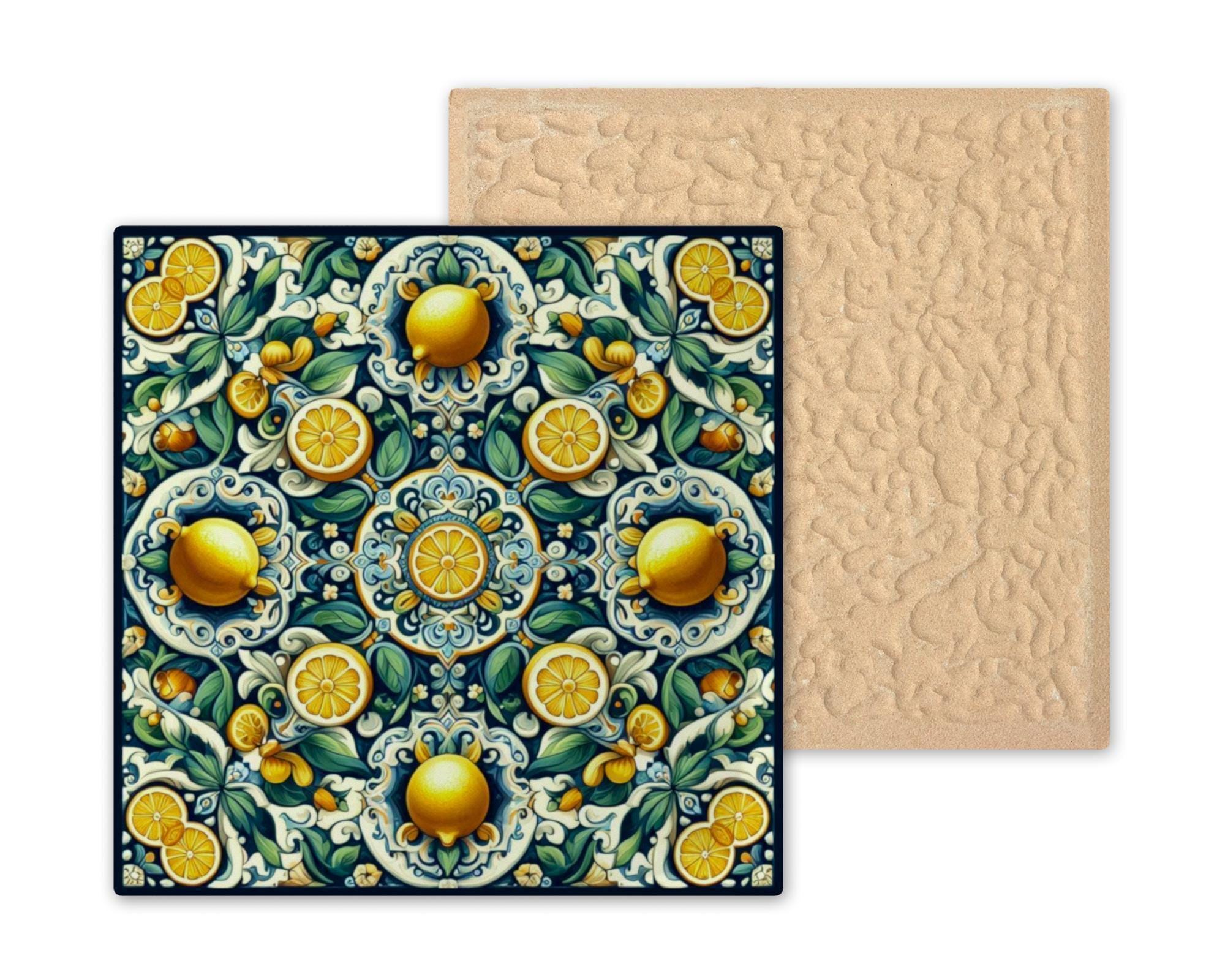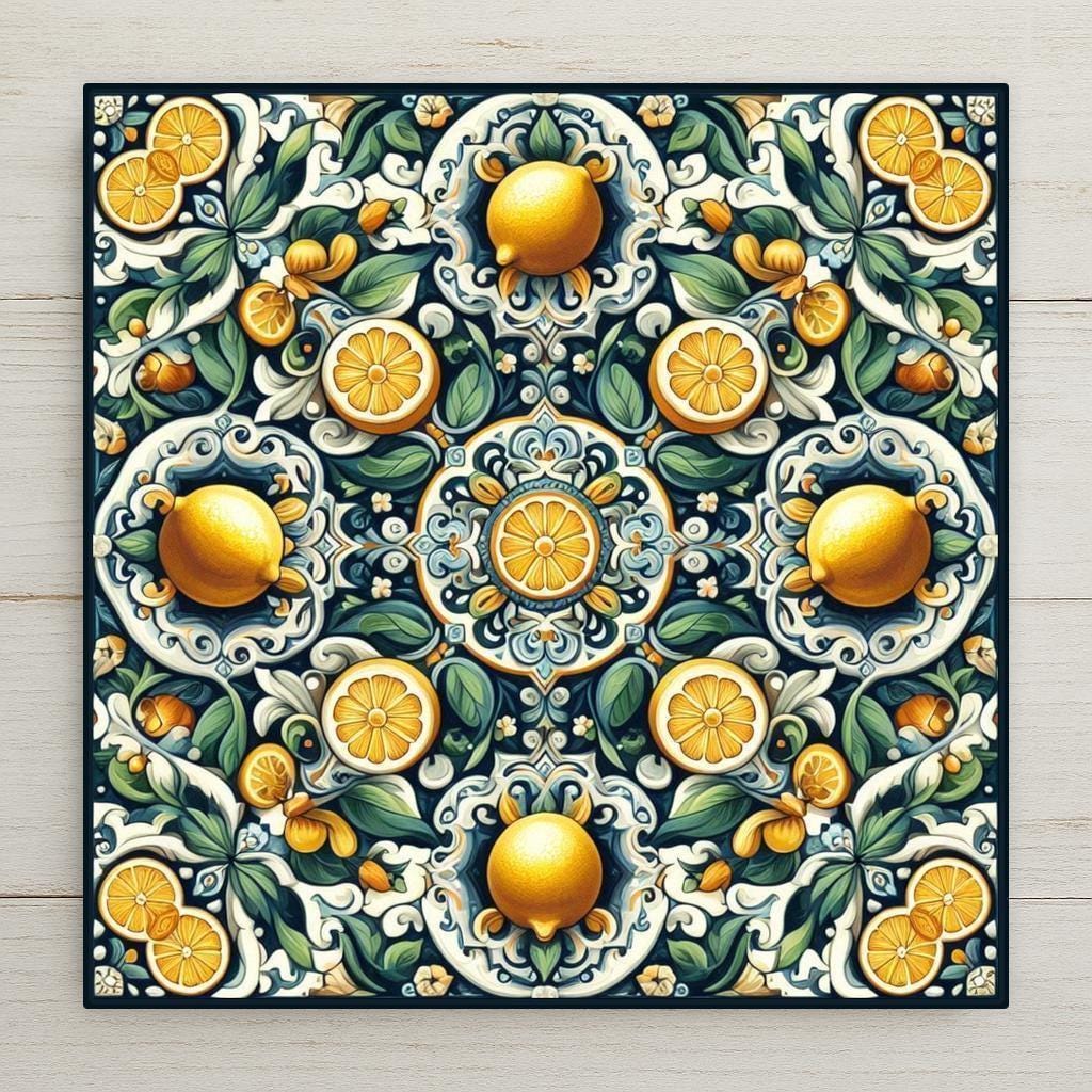 It's also display-ready—choose an optional tile wall hanger for vertical mounting, an easel tile stand for tabletop placement, or cork backing for trivet use. Whether you're a fan of Mediterranean design or simply love lemons, this tile adds zest and style wherever it’s displayed.