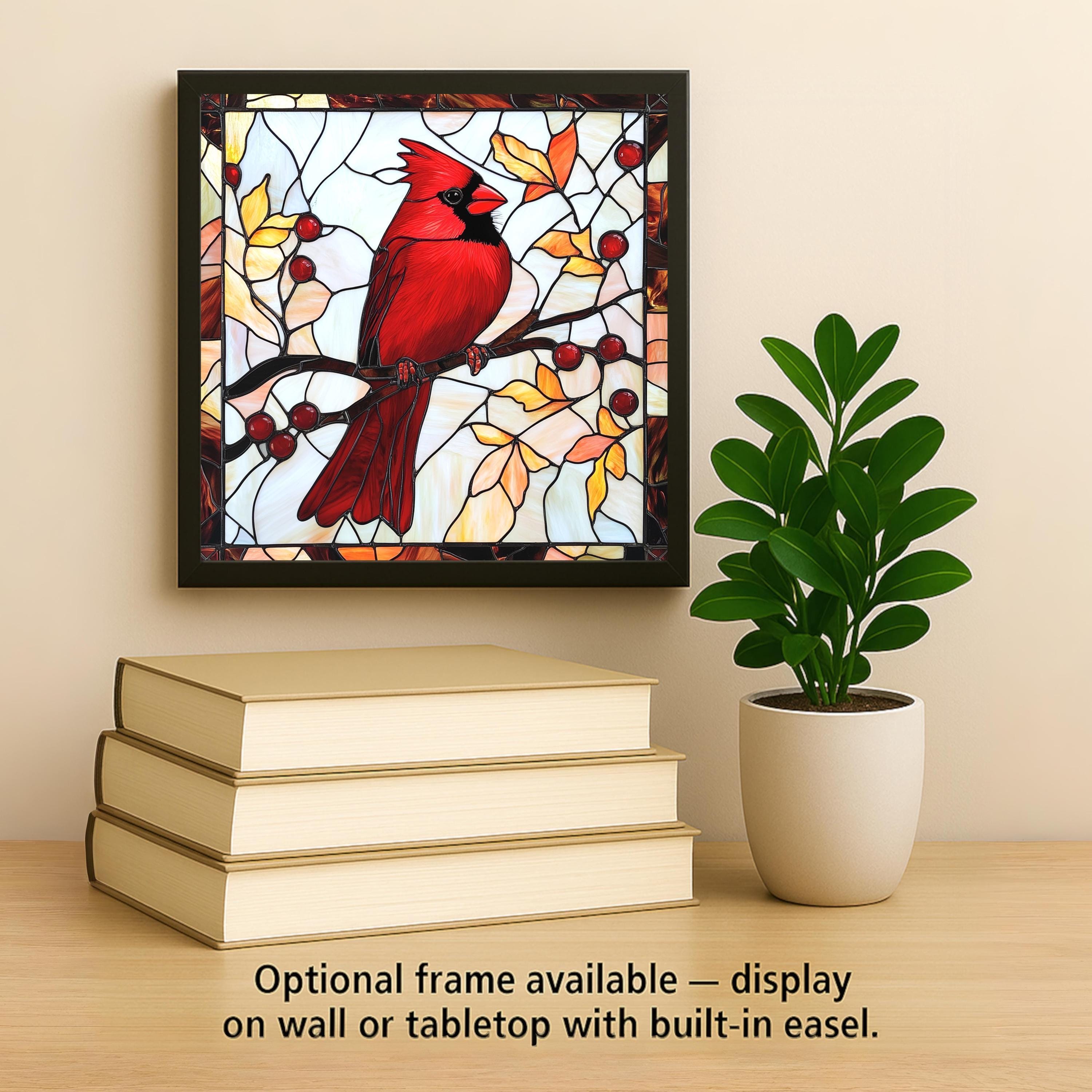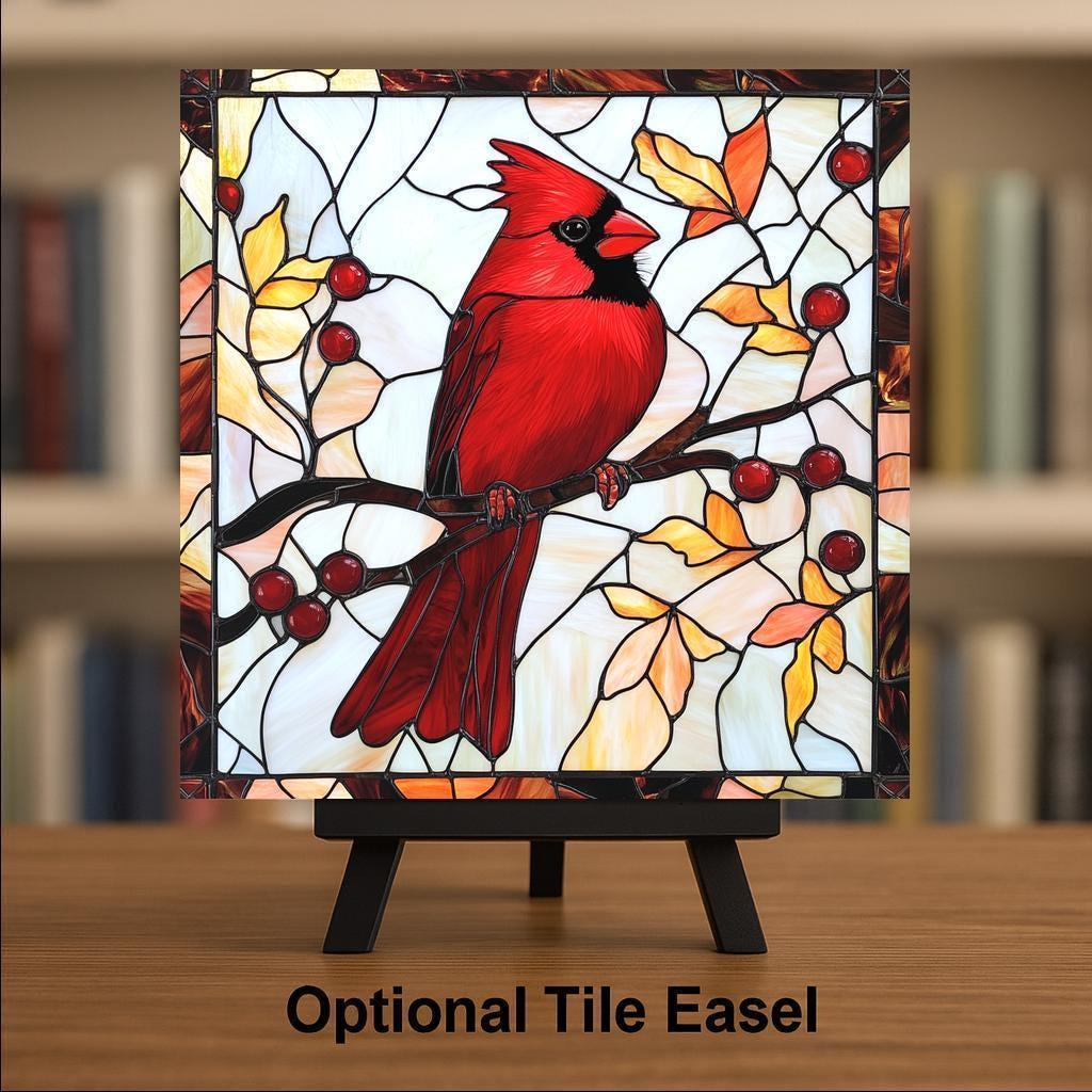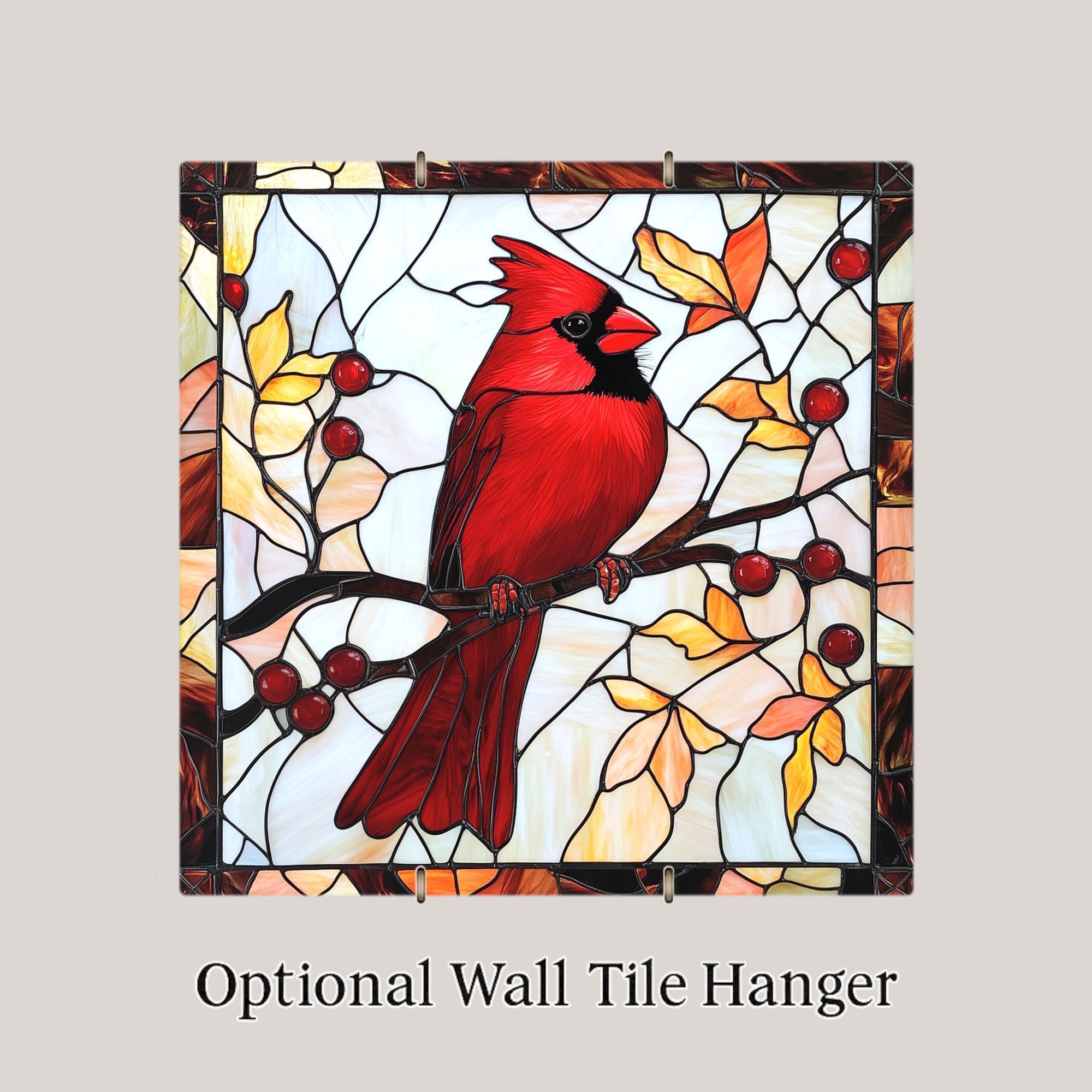 This handcrafted ceramic tile features a brilliant red cardinal in a stained glass-inspired design—an elegant and emotional tribute to nature and remembrance. Set against warm fall tones with detailed branches, berries, and leaves, the cardinal becomes a radiant focal point in any room.
