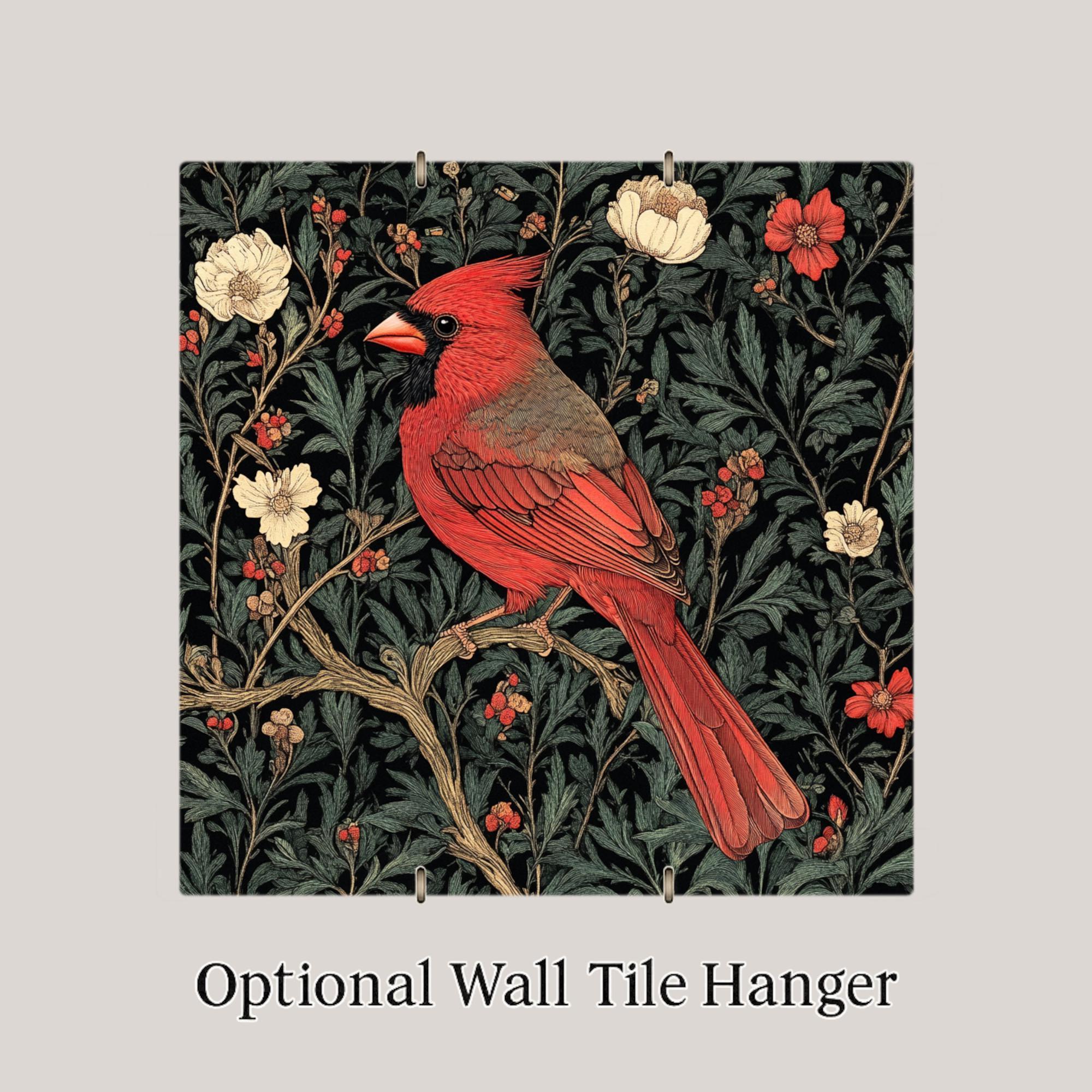 Add elegance to your space with this William Morris-inspired red cardinal ceramic tile. Featuring a vivid crimson cardinal set against a vintage woodland backdrop of detailed florals and foliage, this nature-themed wall art evokes classic charm and tranquility. The intricate botanical pattern draws from Victorian textile art and woodland illustration, making it a perfect addition to cottagecore, traditional, or rustic décor styles.