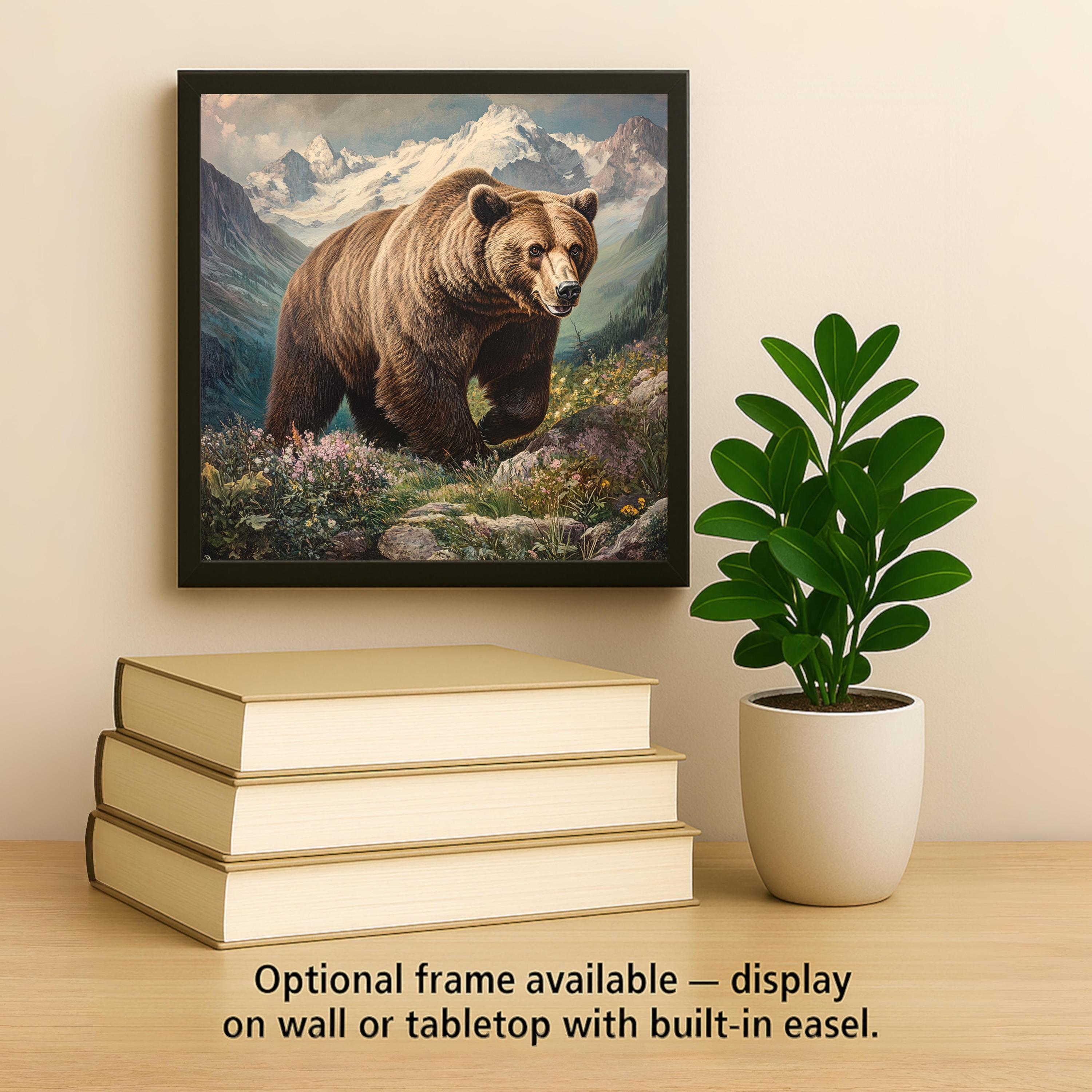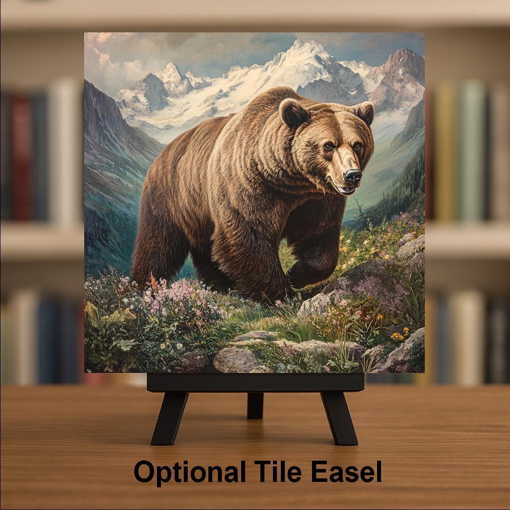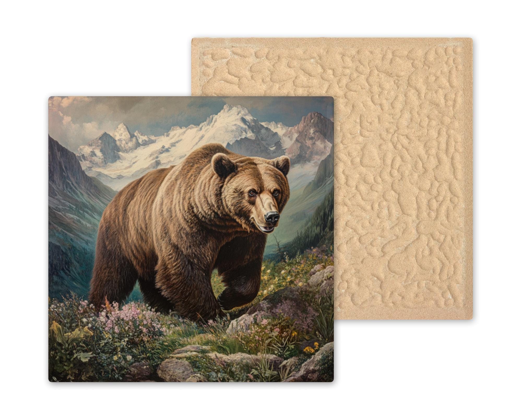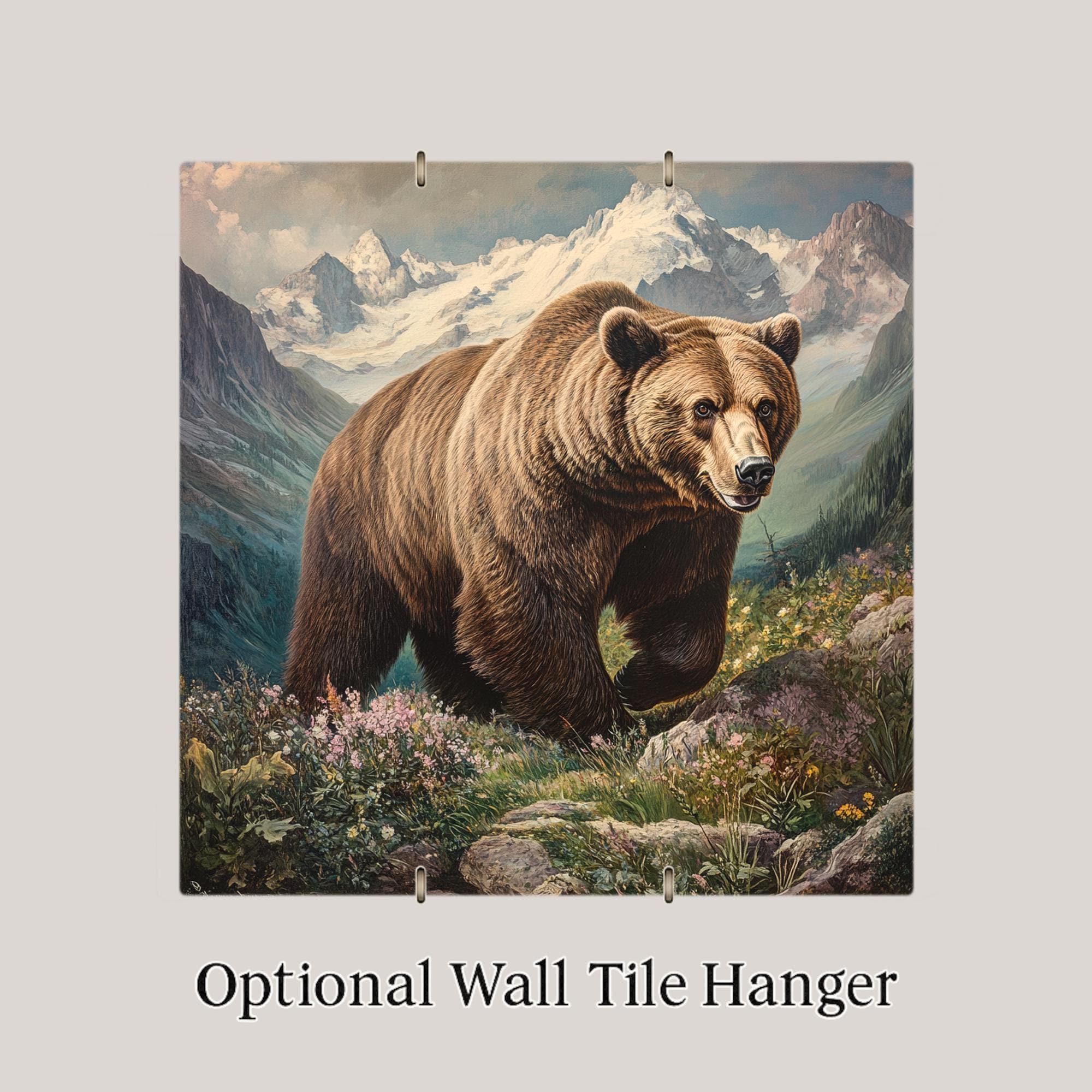 This handcrafted ceramic tile captures a breathtaking moment in nature—a grizzly bear roaming through a mountain valley. Inspired by classic wildlife illustrations, the detailed scene features towering alpine peaks, forested slopes, and native wildflowers, offering a bold tribute to America’s iconic wilderness.