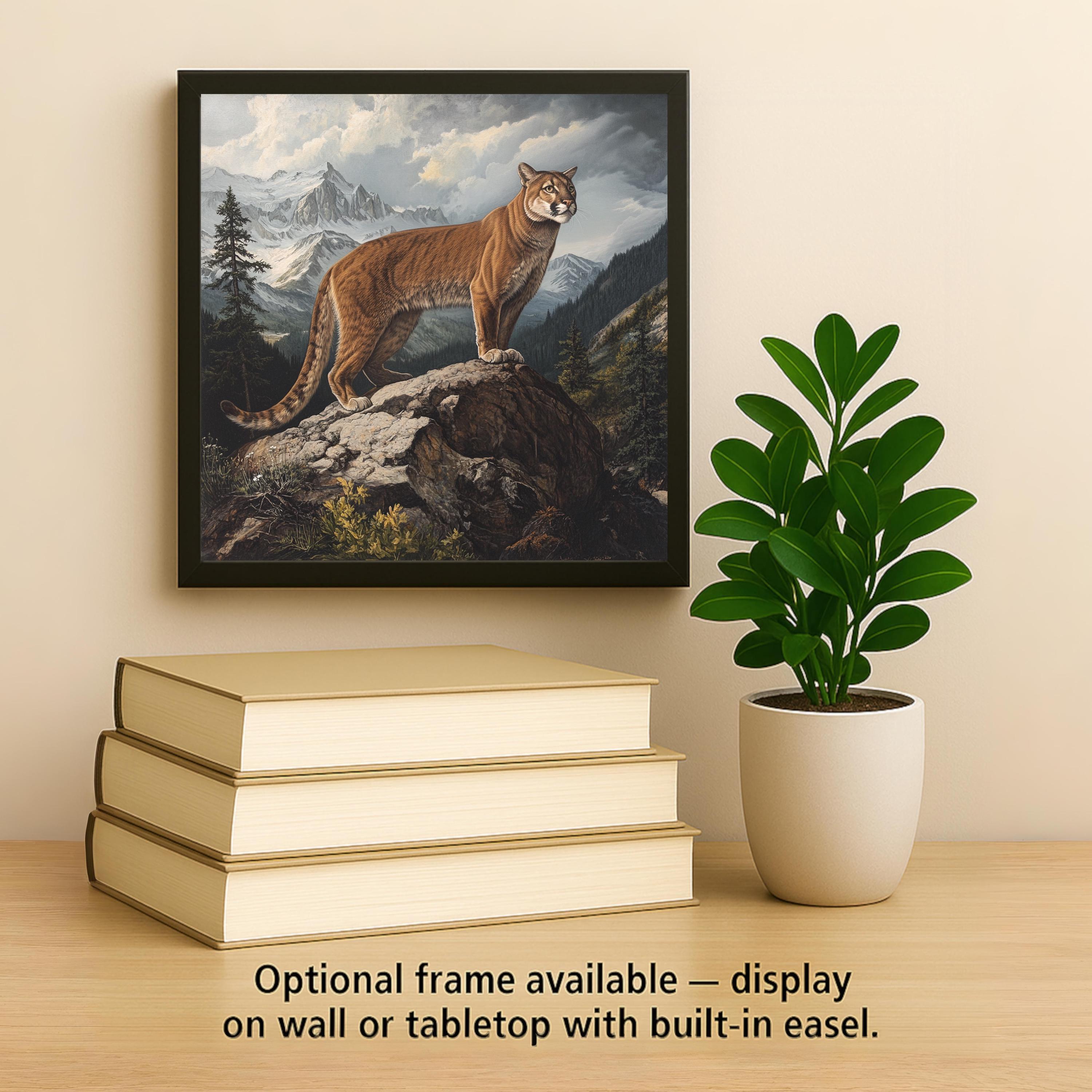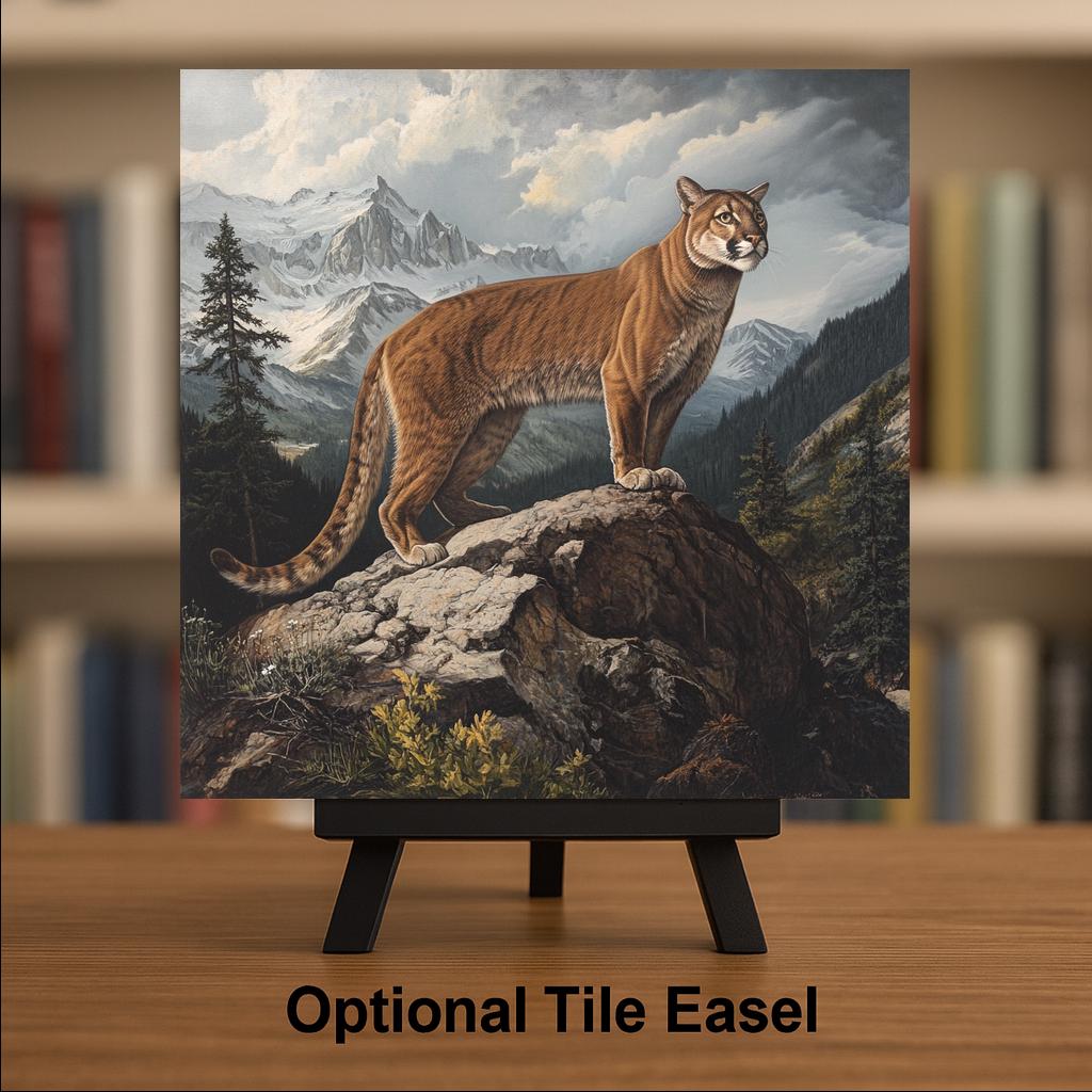 This mountain lion ceramic tile showcases a beautifully rendered cougar surveying its mountainous domain. Inspired by classic Audubon-style wildlife art, the piece combines realism and grandeur, with rocky textures, moody skies, and snowy peaks that add dramatic depth. The cougar’s poised stance exudes calm strength, making this tile a powerful focal point in lodge, ranch, or cabin décor.