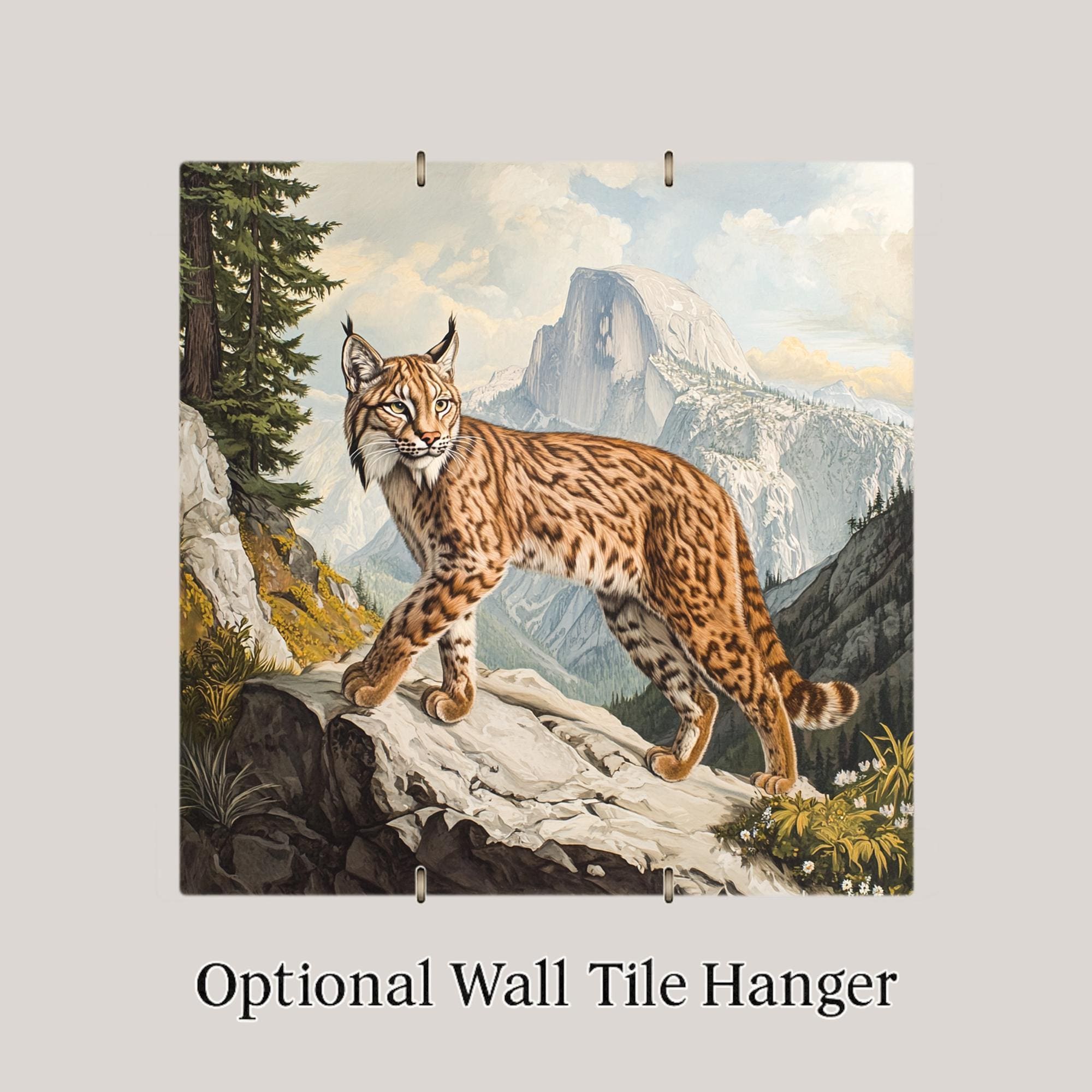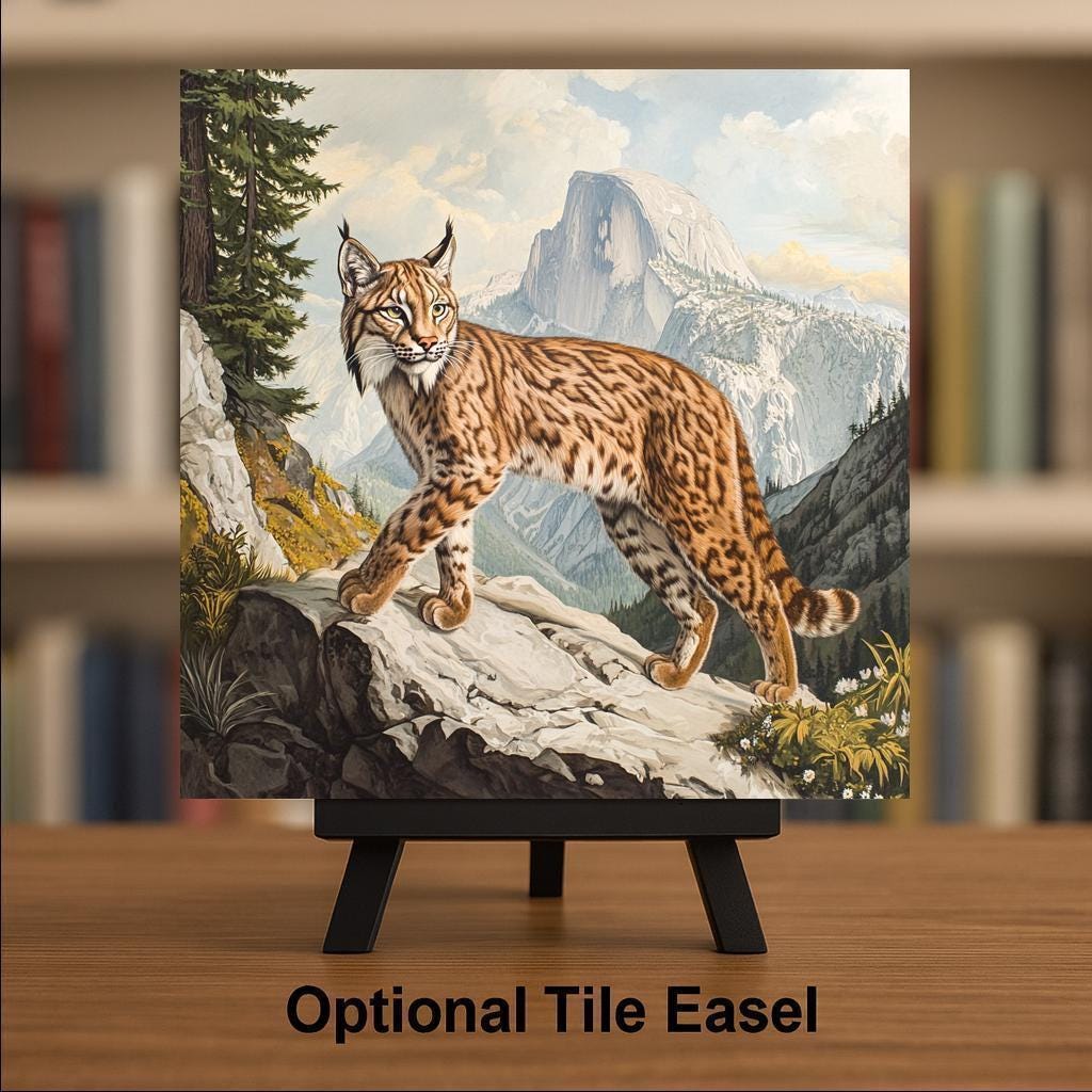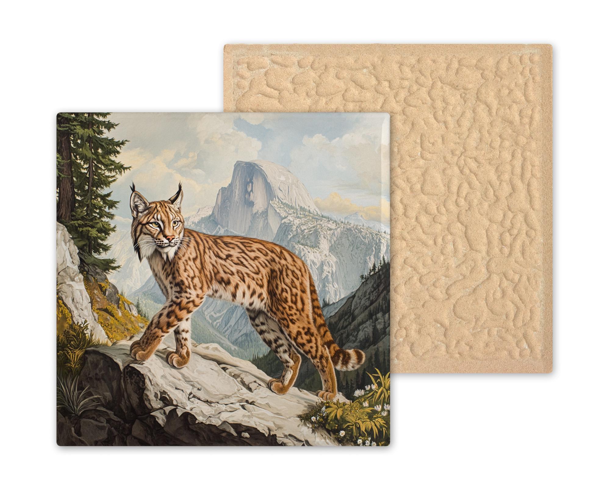 This lynx wildlife ceramic tile offers a vintage twist on classic nature art. Modeled after traditional Audubon-style illustrations, it features a sleek lynx pausing mid-step on a rocky overlook, with majestic mountain peaks rising in the background. Every detail—from the spotted coat to the pine trees—is finely illustrated to honor the beauty of the wild.