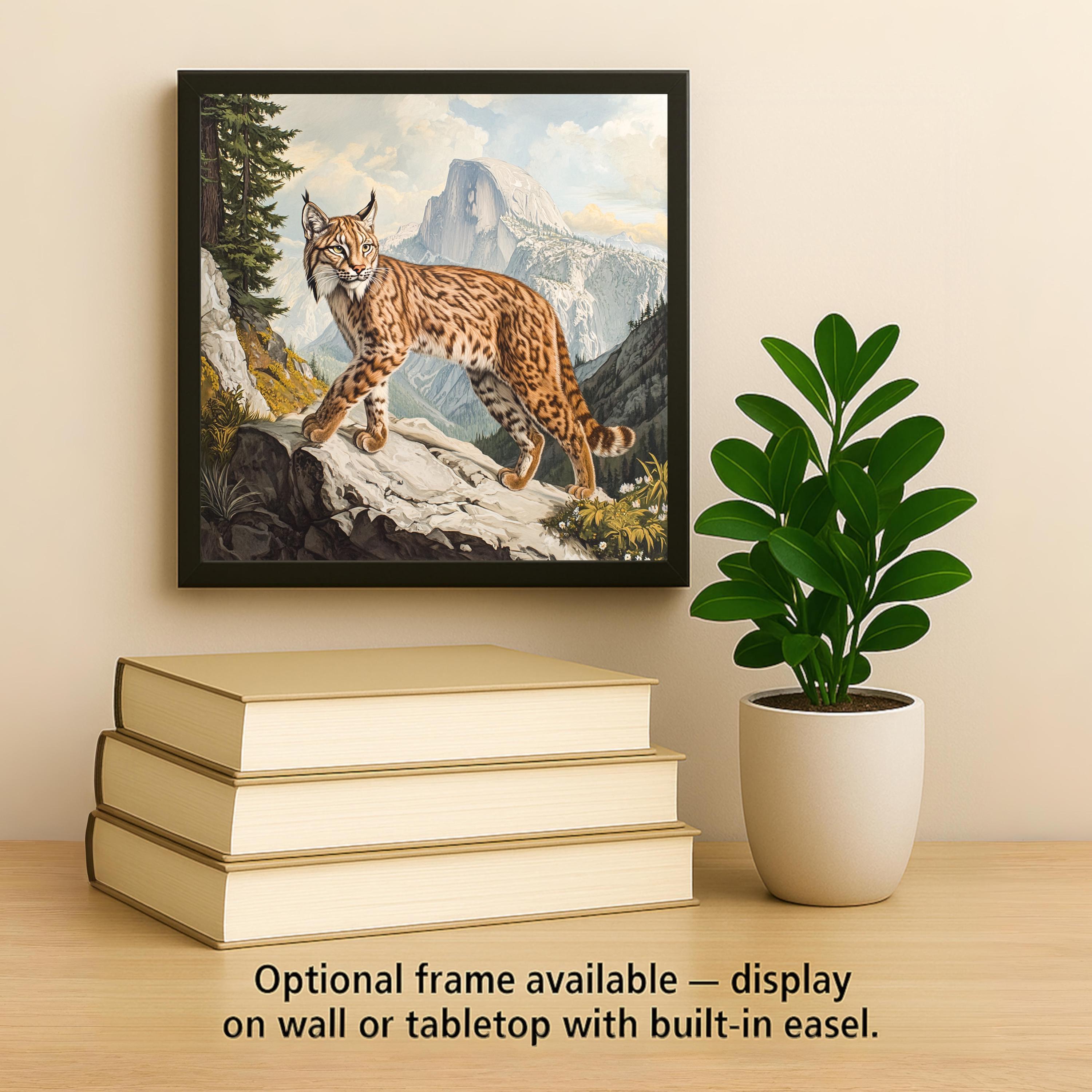 Optional display add-ons include a tile wall hanger for hanging vertically, an easel tile stand for upright shelf placement, or cork backing for flat surface safety. However you style it, this lynx tile brings a strong, graceful touch of the natural world into your home.