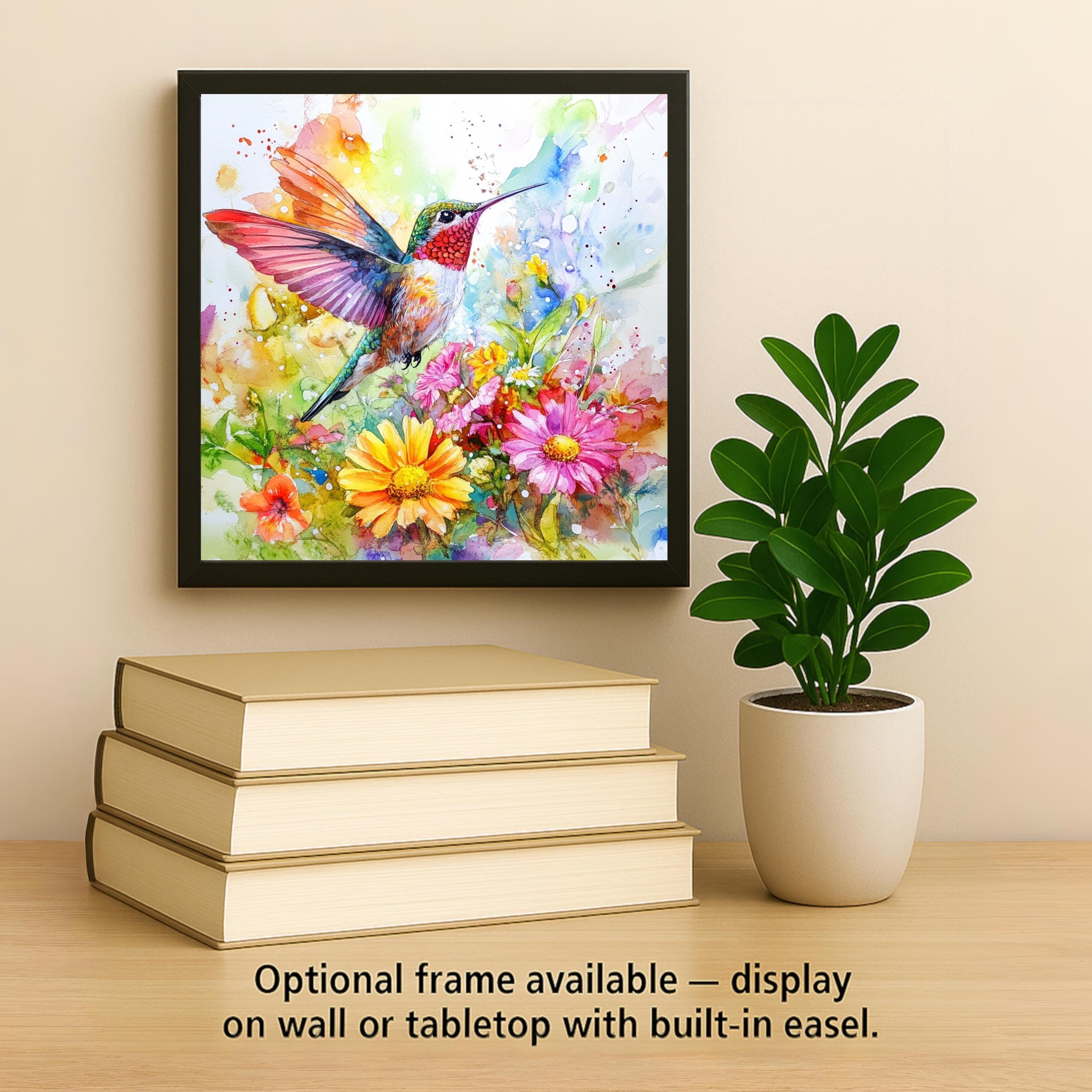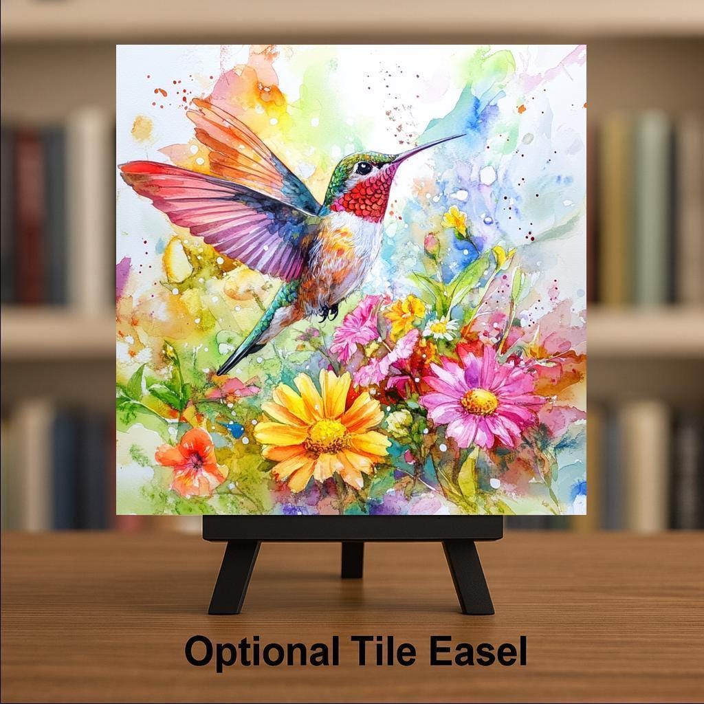 Optional display accessories include a tile wall hanger for vertical art, an easel tile stand for shelf or tabletop display, and cork backing to protect your surfaces. However you style it, this ceramic tile brings the hummingbird’s magic into everyday life.