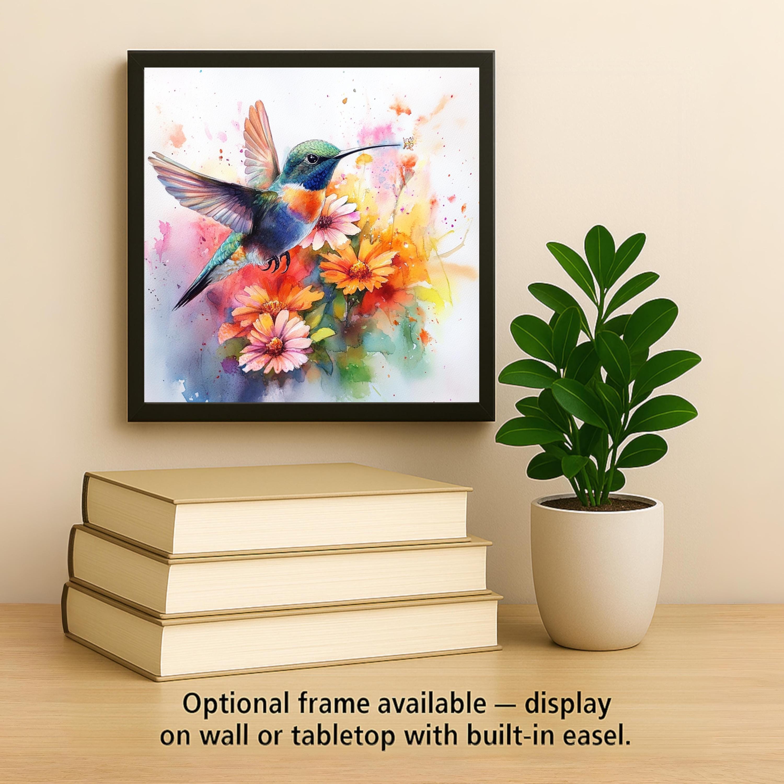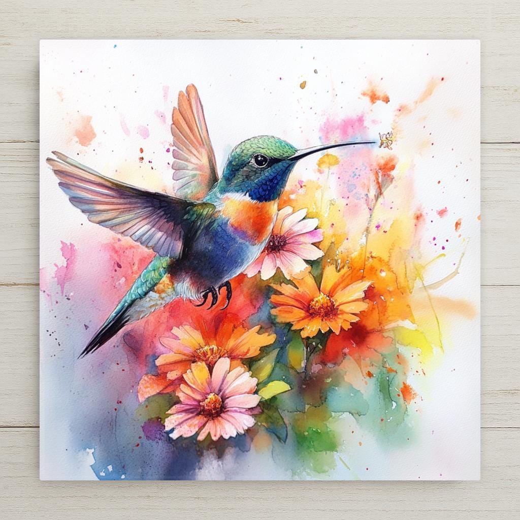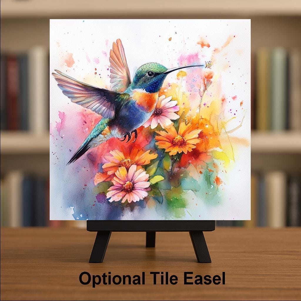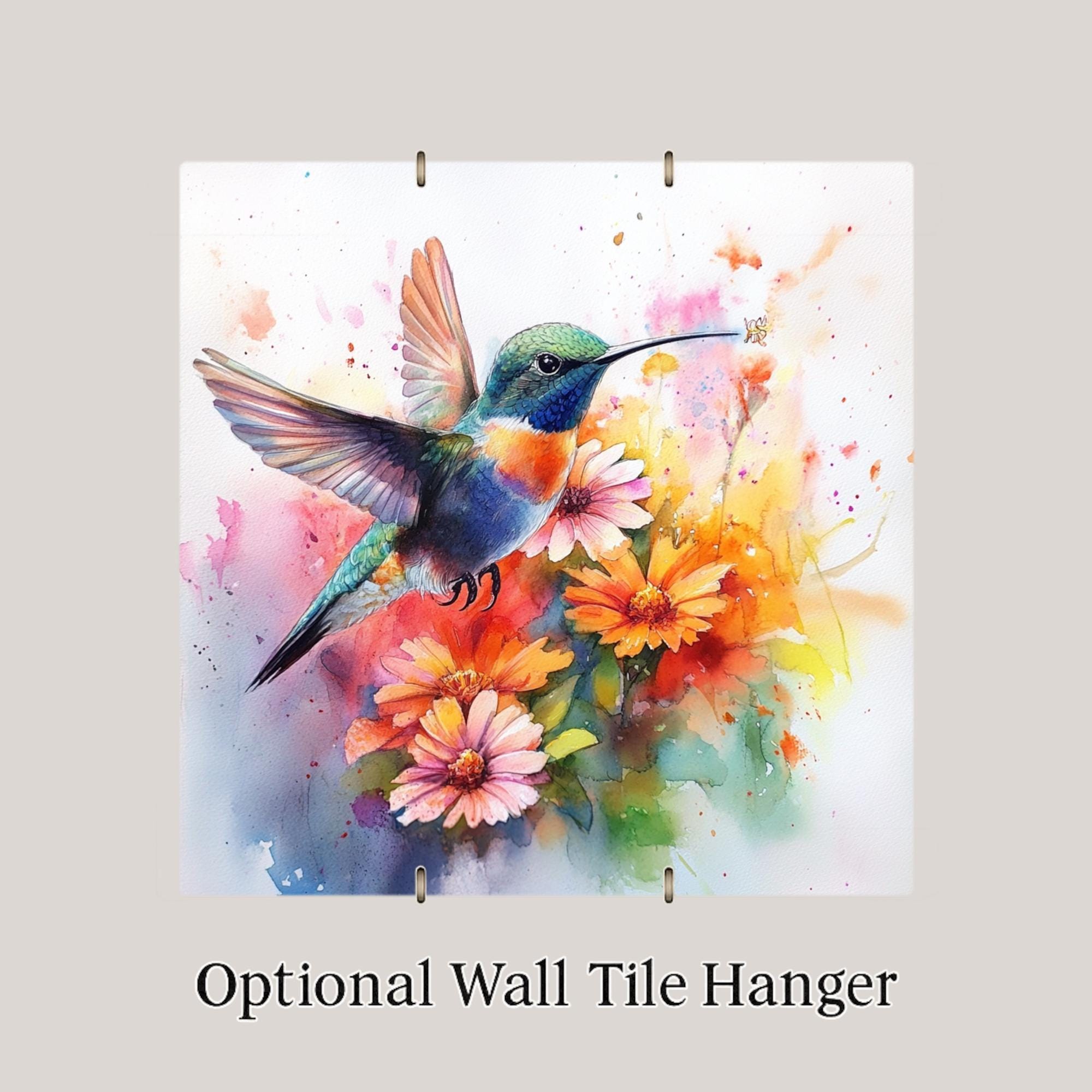 Celebrate the beauty of nature with this watercolor-style hummingbird ceramic tile. A dazzling hummingbird hovers among colorful daisies and wildflowers, captured in bright, expressive brushstrokes. The watercolor effect brings fluid motion to the image, while the glossy ceramic tile enhances the vibrancy and contrast of the design.