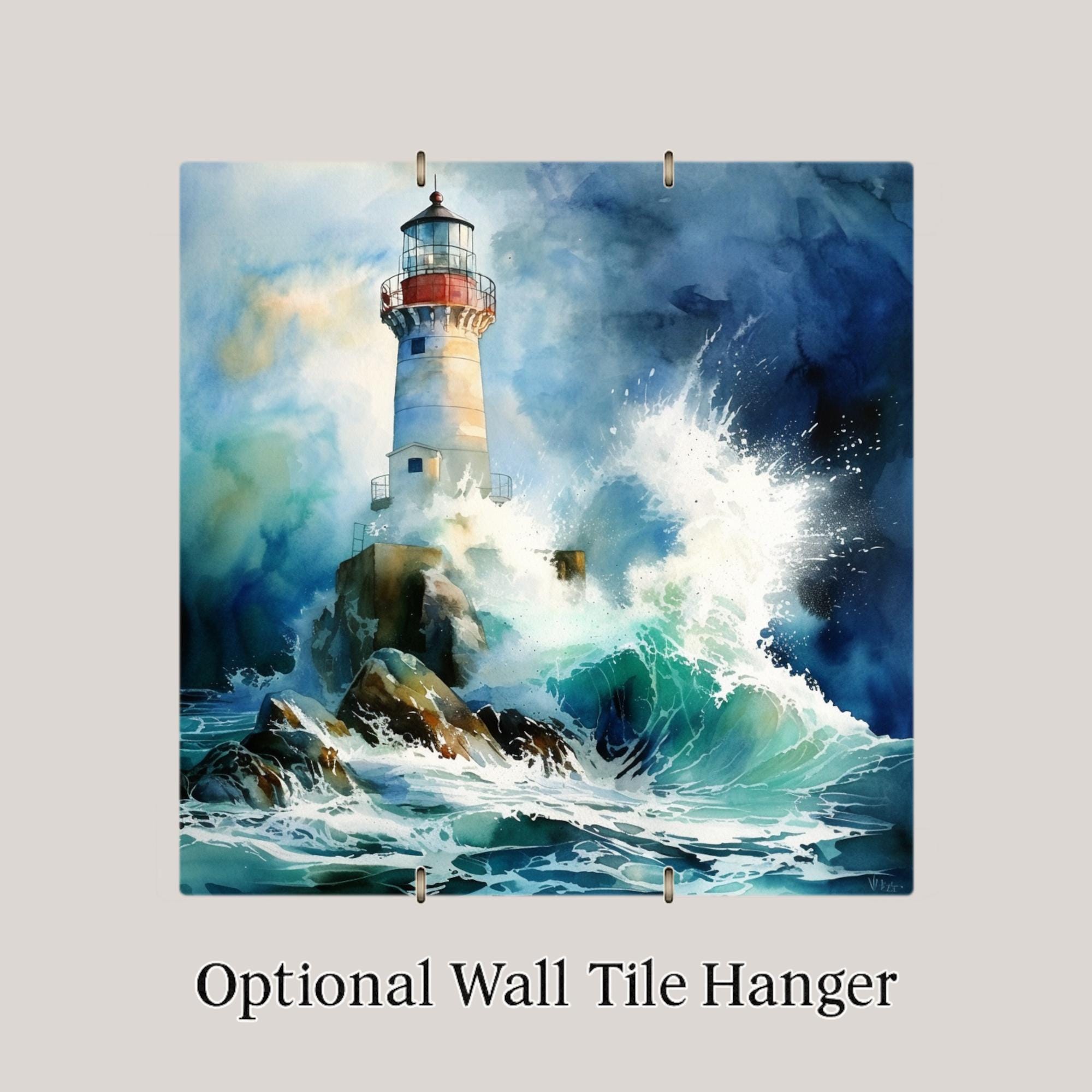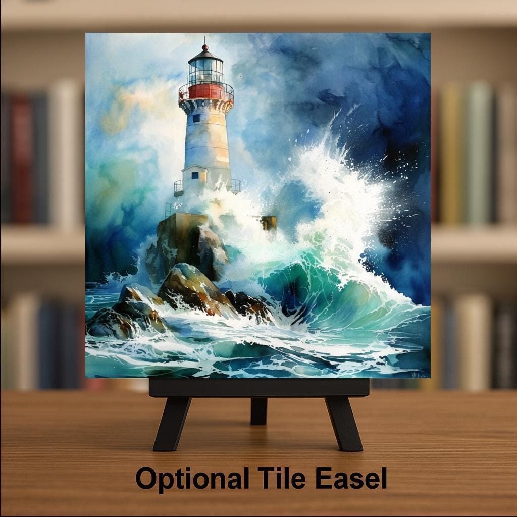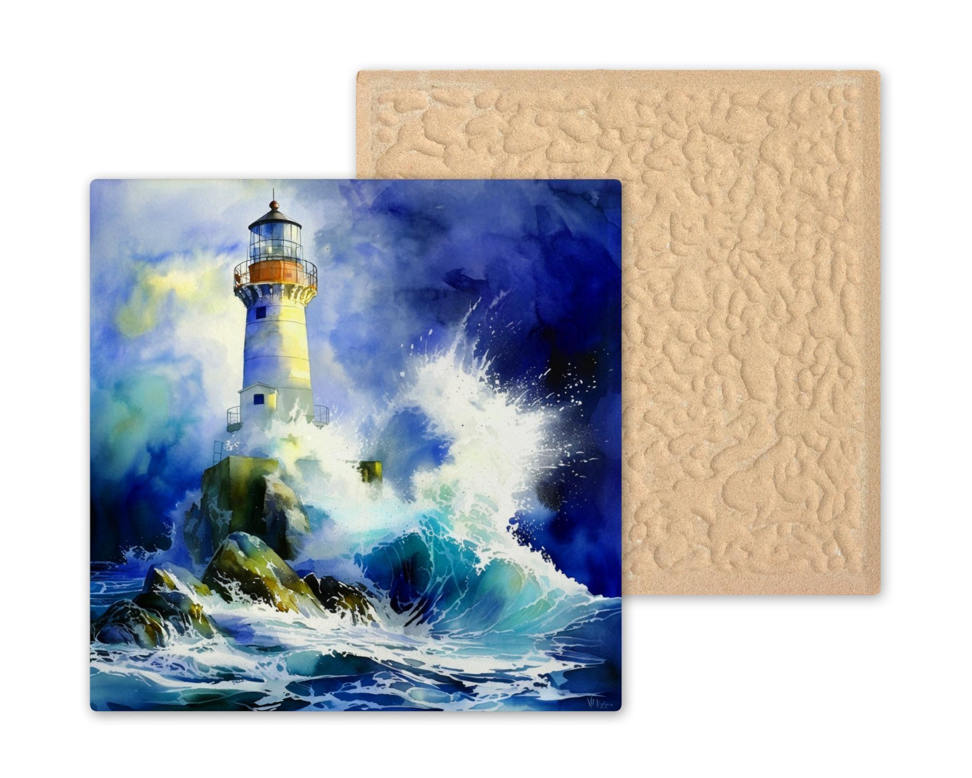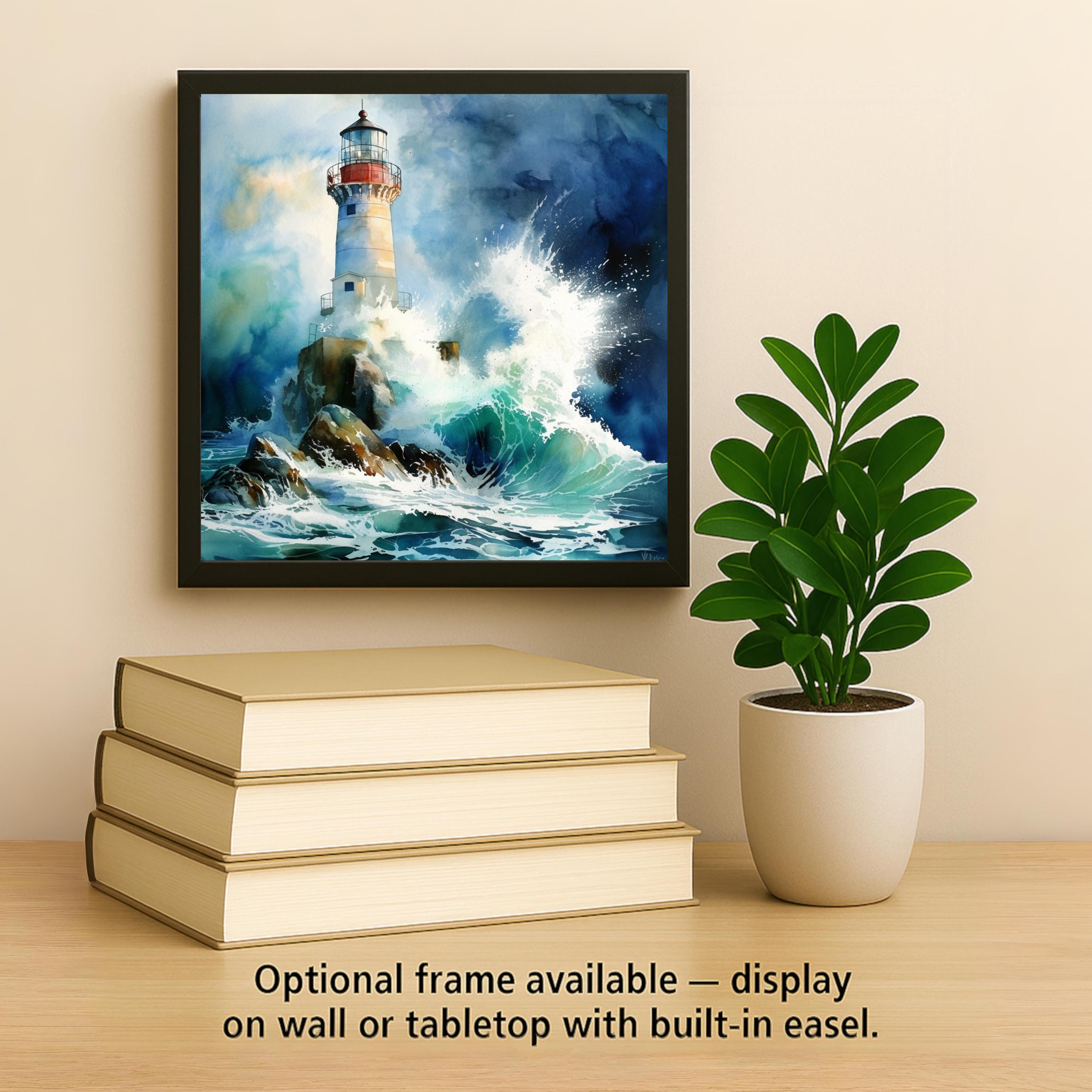 This piece celebrates the enduring image of the lighthouse — steady against the storm, grounded against the surge of the sea. The crashing wave brings motion and light, while the bright tower anchors the composition.