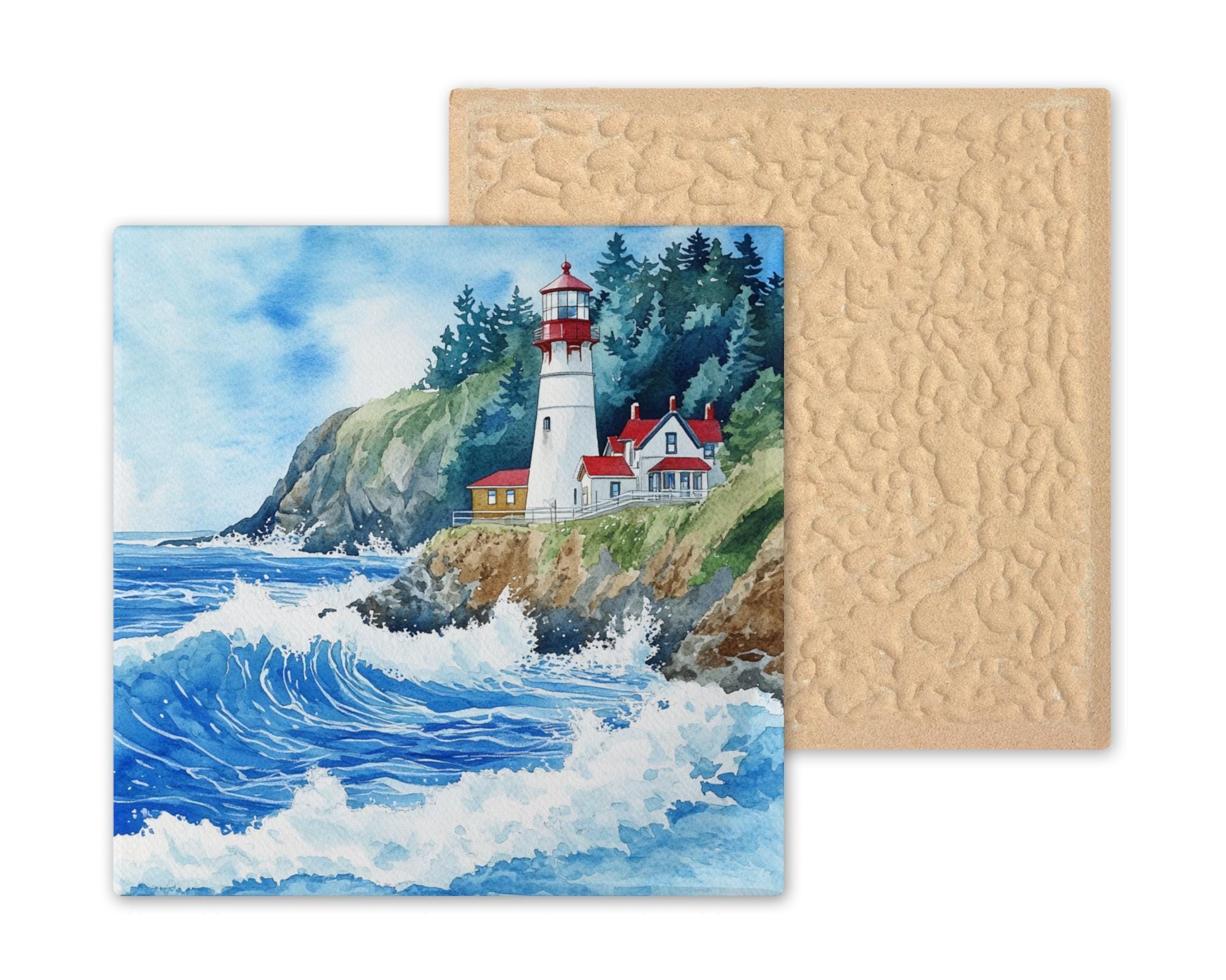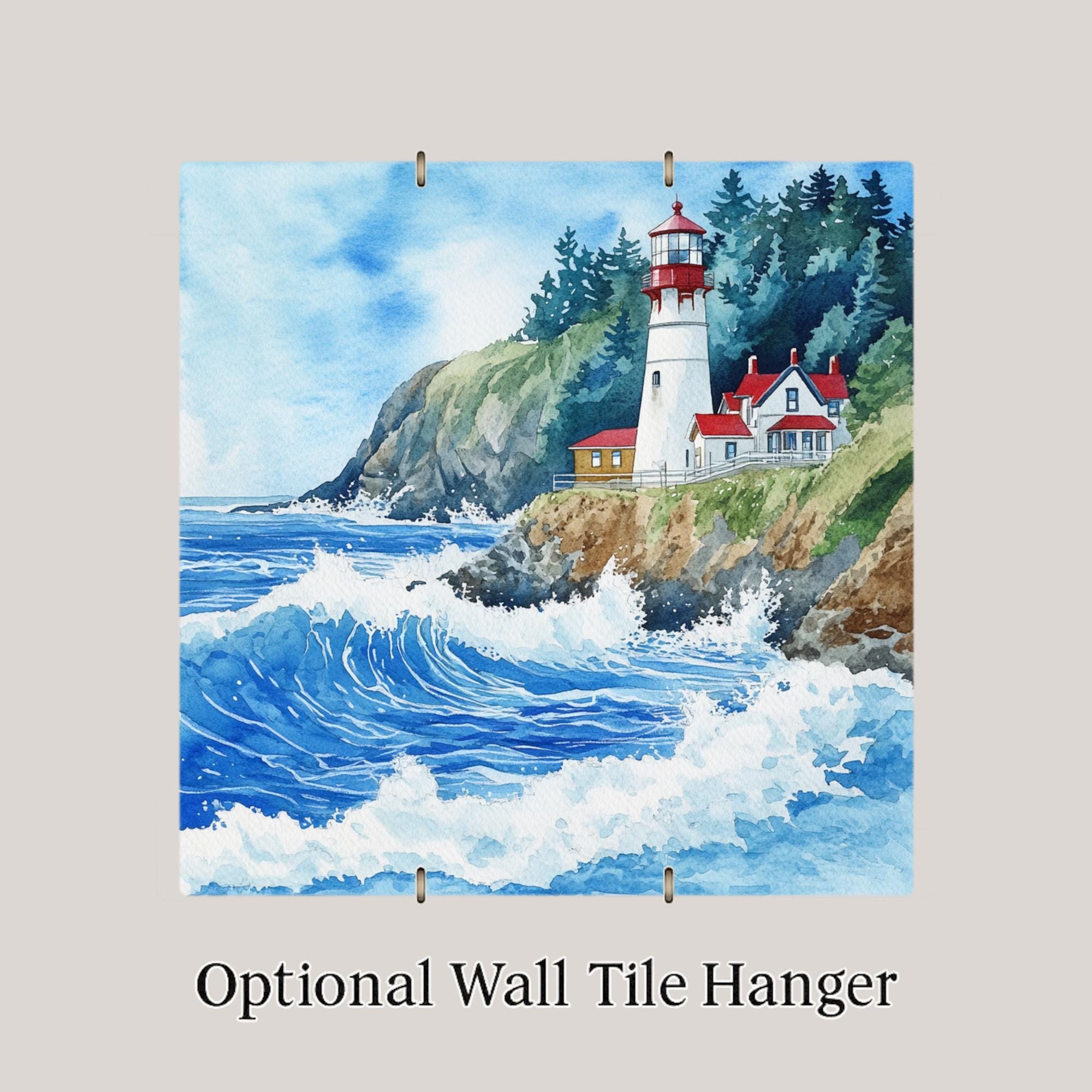 Bring the beauty of Oregon's coast into your home with this Heceta Head Lighthouse ceramic tile. This watercolor-style scene captures the iconic red-roofed lighthouse perched above crashing waves, surrounded by evergreens and rocky cliffs. Whether you're decorating a coastal kitchen, cottage entryway, or nautical-themed bathroom, this tile brings peaceful seaside charm to your space.