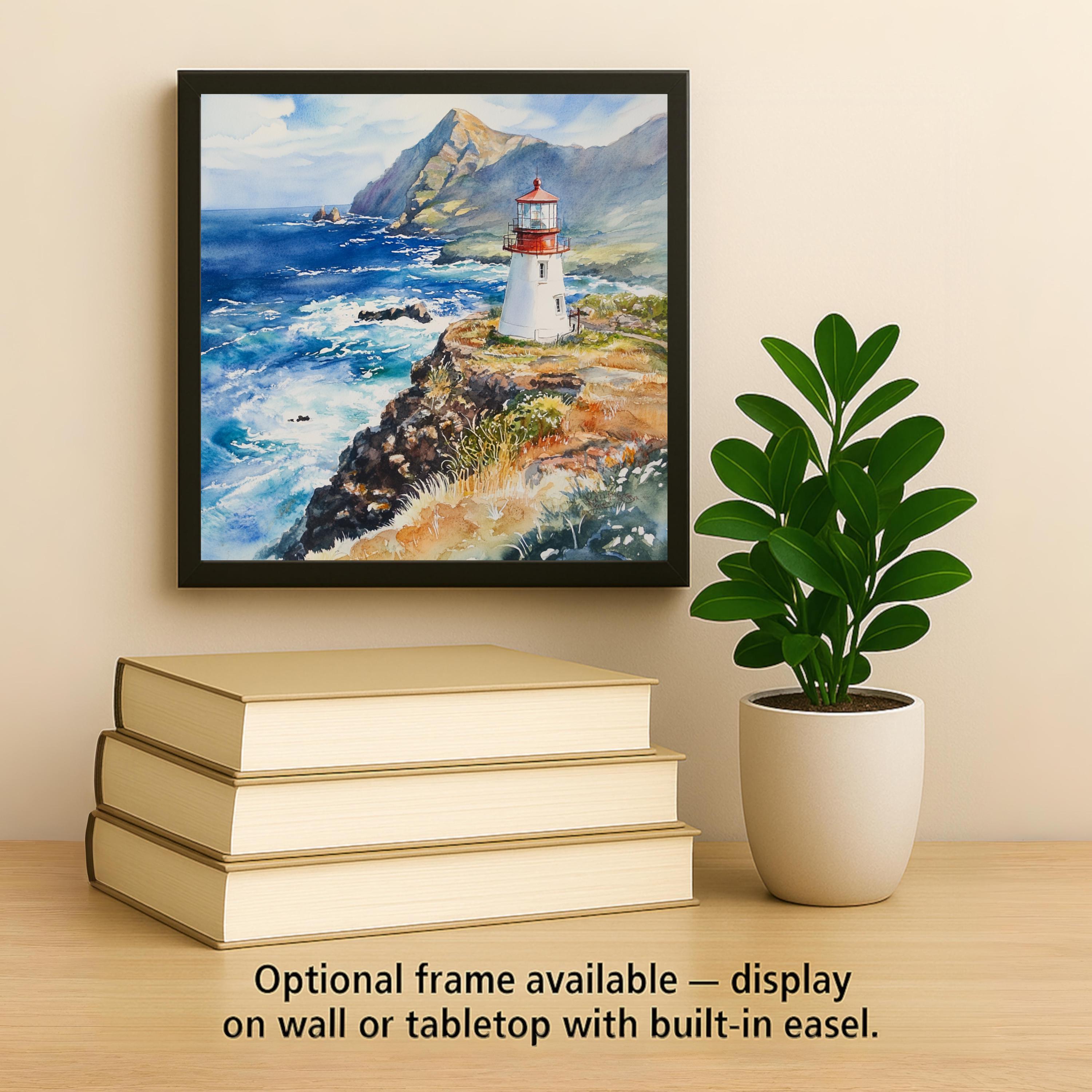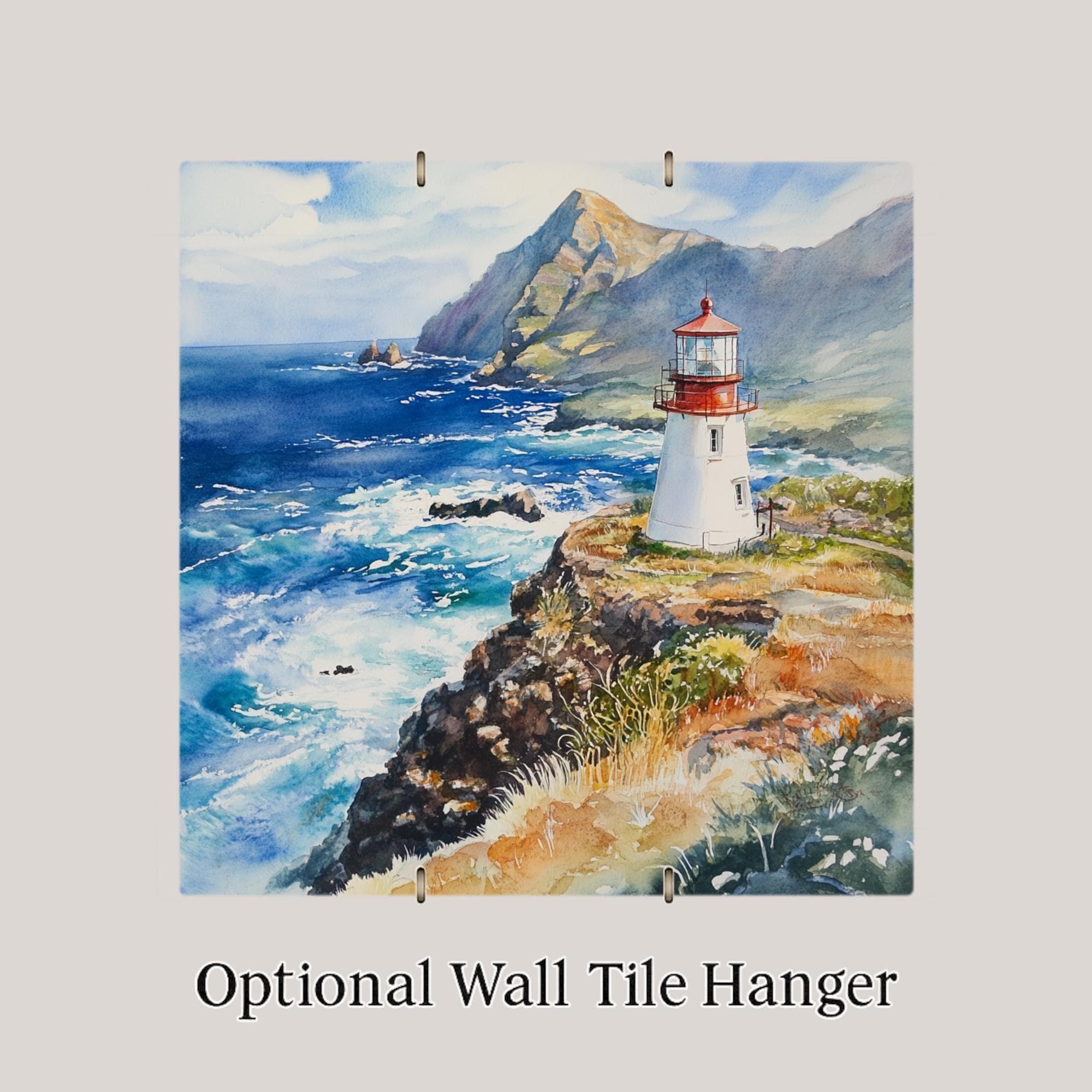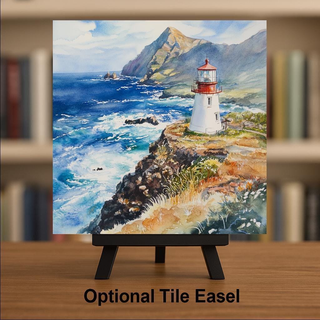 Optional display accessories include a tile wall hanger, easel tile stand, or cork backing, giving you flexible options for styling. Whether you live by the coast or love nautical decor, this Makapu’u lighthouse tile is a calming and colorful way to bring the islands home.