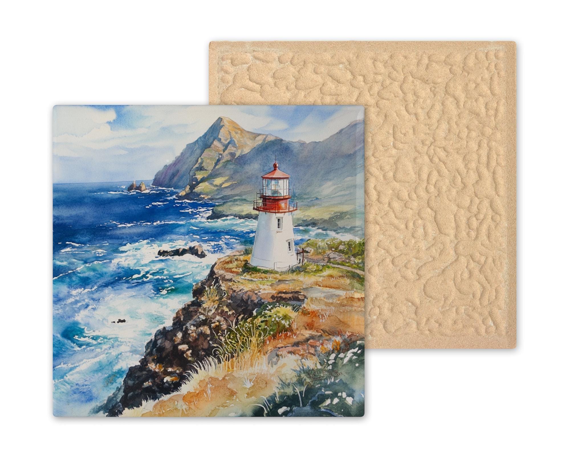 This Hawaiian lighthouse ceramic tile captures the natural beauty and tranquility of Makapu'u Point in soft, flowing watercolor. Set on a rocky cliff overlooking brilliant turquoise waves, the white lighthouse with its red cap is a timeless symbol of guidance and peace. The sweeping view of ocean and mountains makes this tile a peaceful, painterly addition to beachy decor.