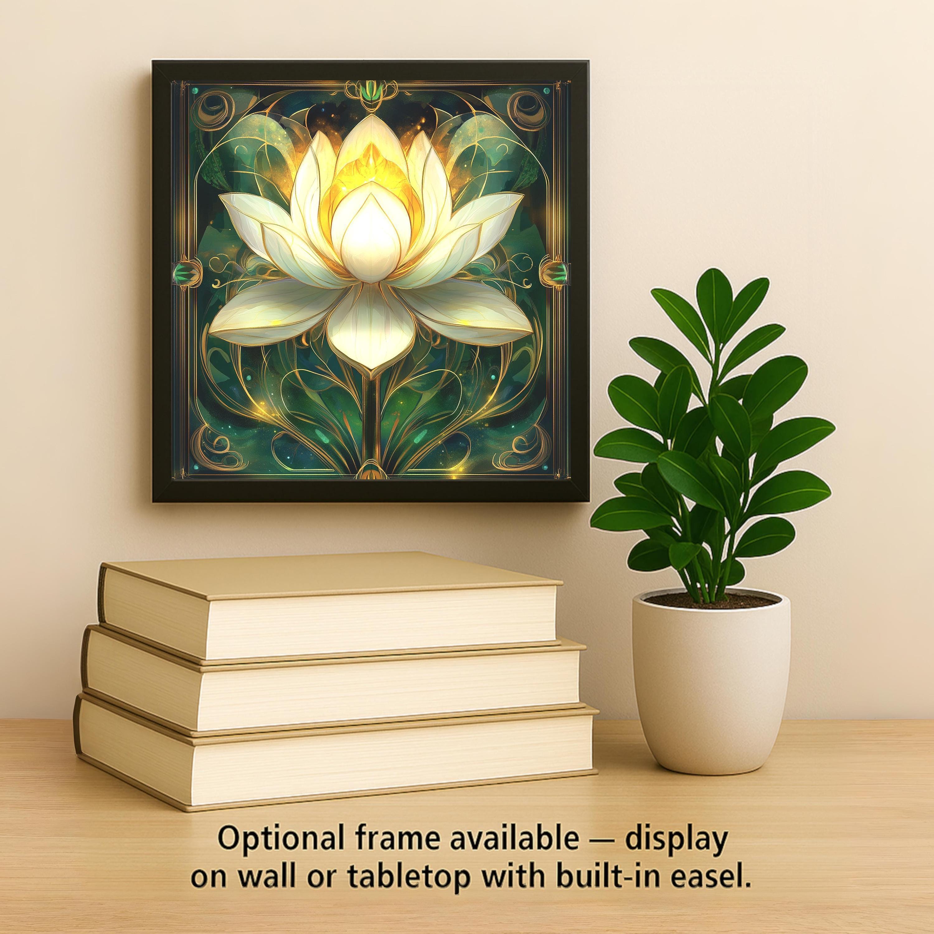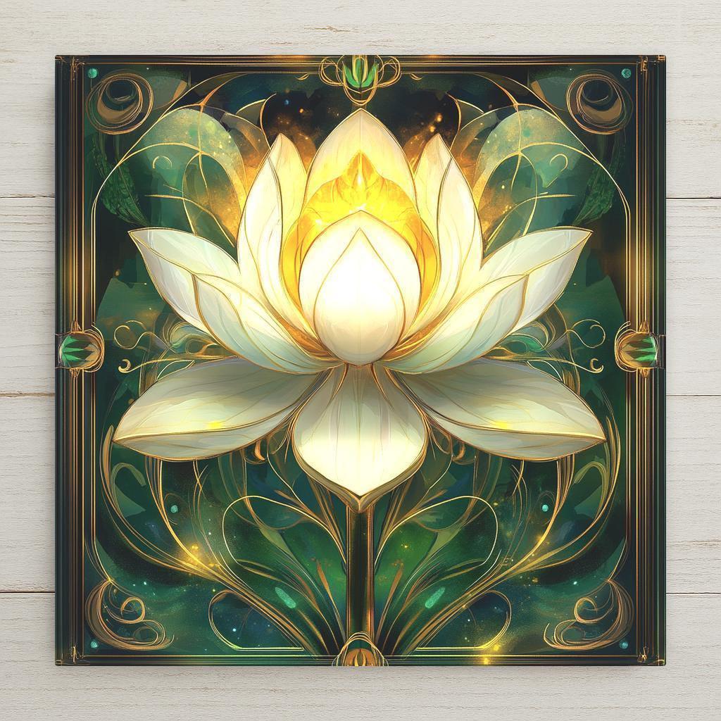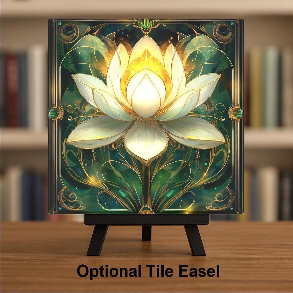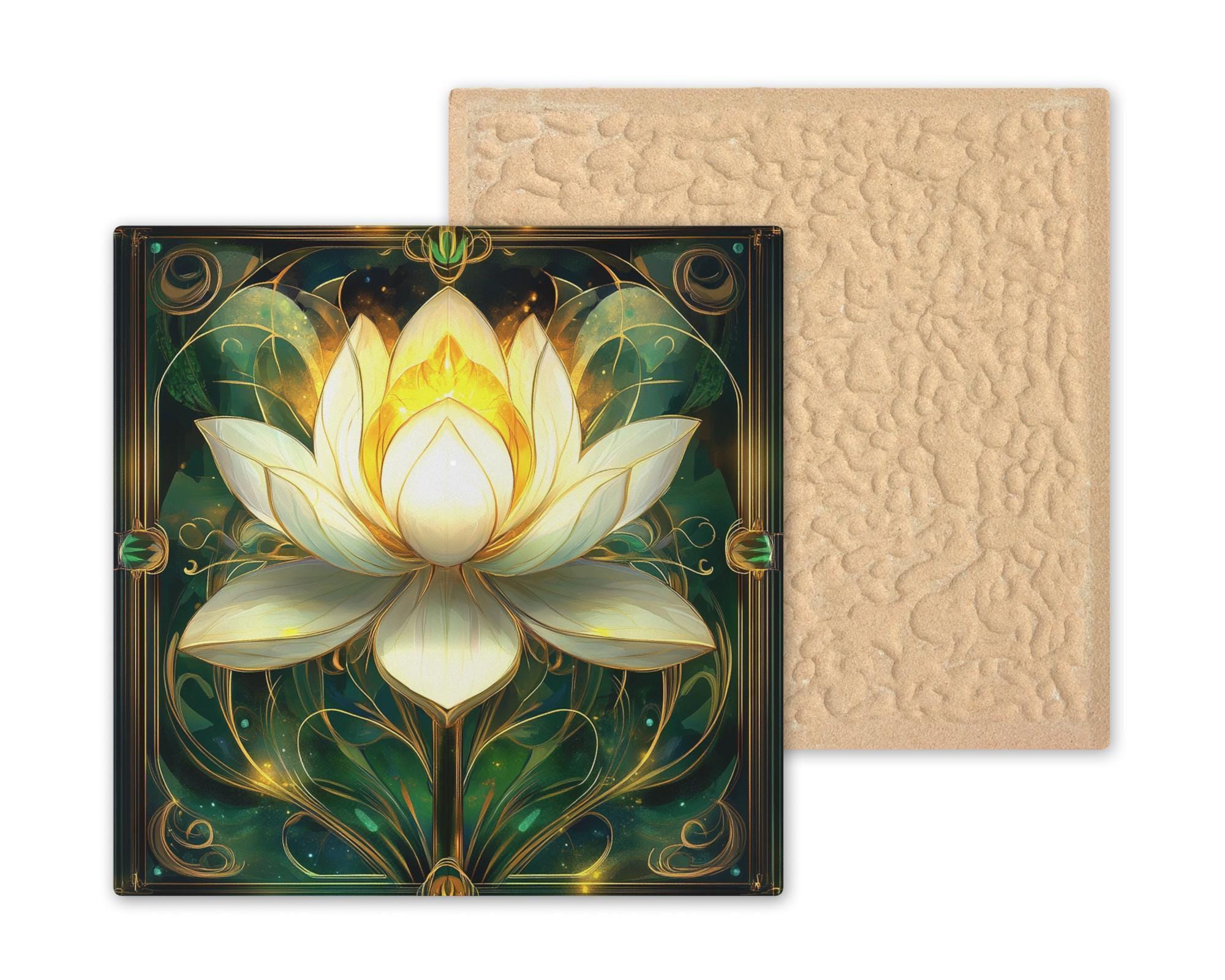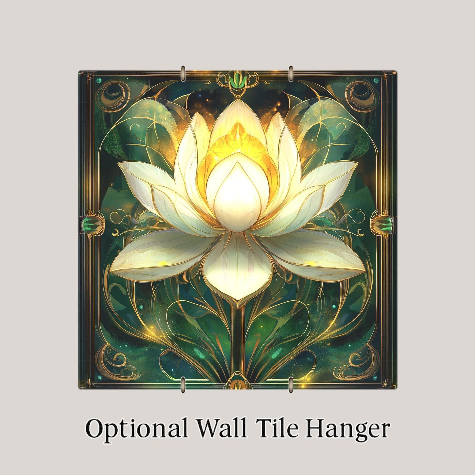 This luminous lotus flower tile glows with spiritual energy and peaceful elegance. Inspired by Art Nouveau design, the white and golden lotus is framed with ornate vines and radiant detailing. Set against a rich green background, the bloom seems to float in a space of stillness and renewal—perfect for creating a sacred atmosphere at home.
