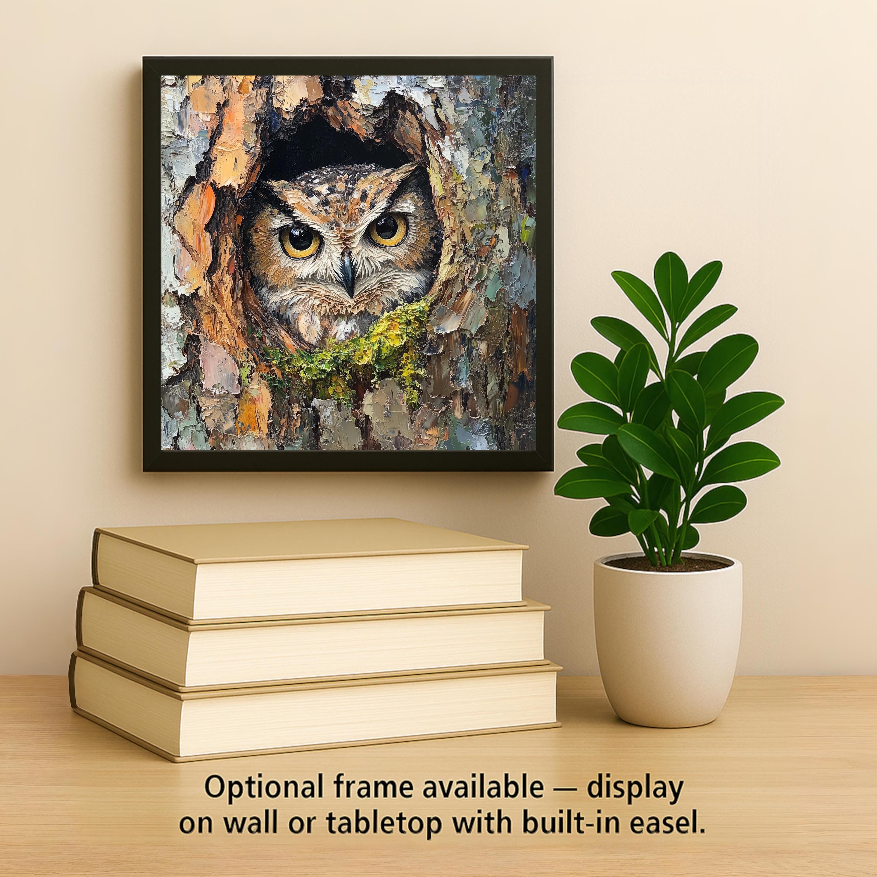 This barred owl ceramic tile art brings nature's wisdom and stillness to life in stunning detail. A lone owl peers from the hollow of a moss-covered tree, its golden eyes sharp and steady. The richly textured bark and realistic feather detail make this wildlife scene feel almost three-dimensional.