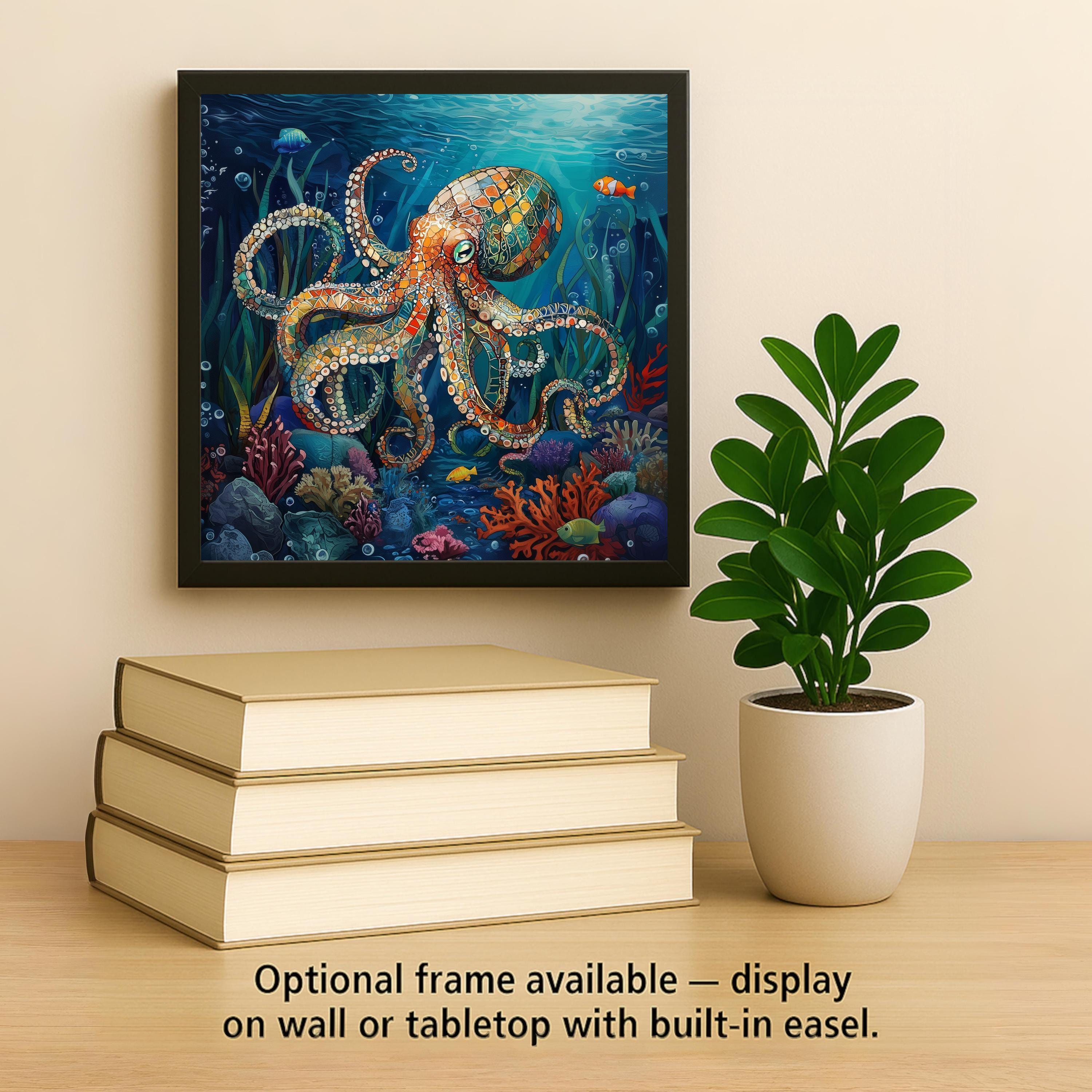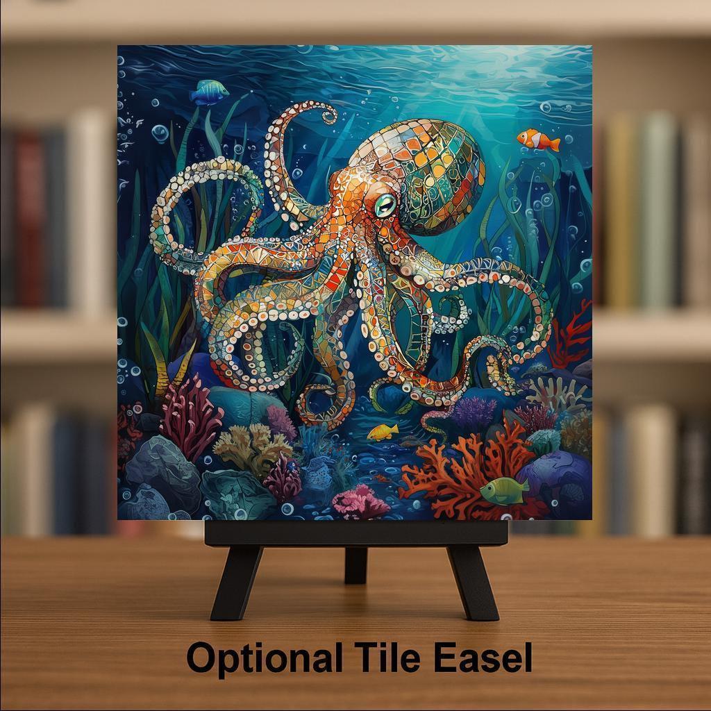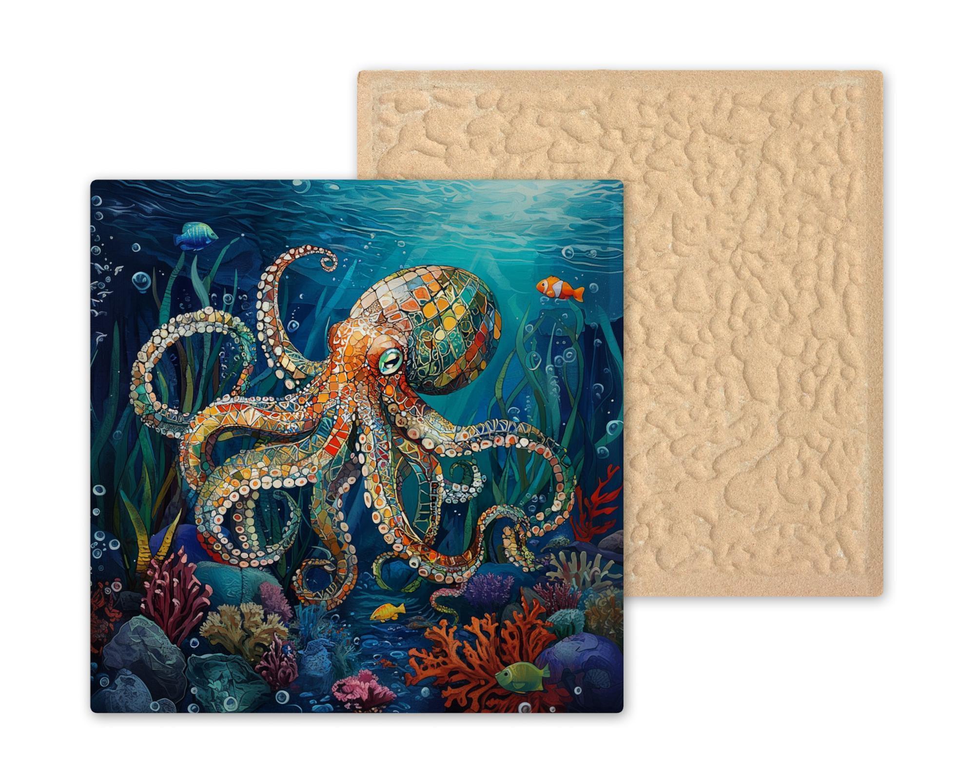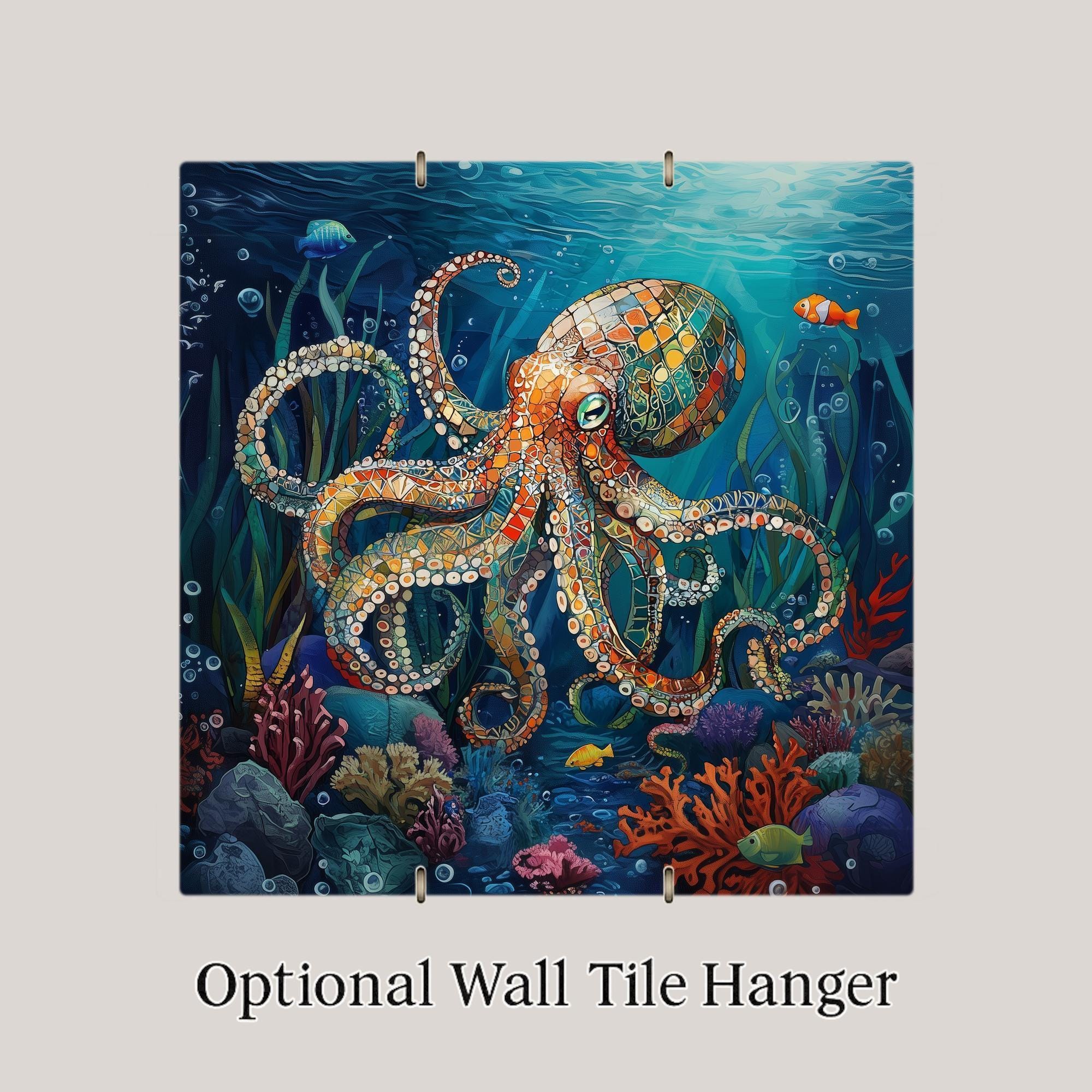 This handcrafted ceramic tile features a dazzling octopus with mosaic-style patterns, surrounded by vibrant coral, seaweed, and tropical fish. Rendered in brilliant blues, coppers, and greens, the octopus appears to shimmer and shift with ocean light, creating a whimsical yet elegant feel. Ideal for nautical-themed homes, beach cottages, or bathrooms needing a splash of sea life, this tile blends coastal charm with refined Art Deco flair. Made with high-quality ceramic and a glossy finish for durability and vibrancy, it's perfect for wall display, tile mosaics, or even a statement coaster. A great gift for ocean lovers, marine enthusiasts, and coastal interior fans who appreciate unique and artistic decor inspired by the sea.