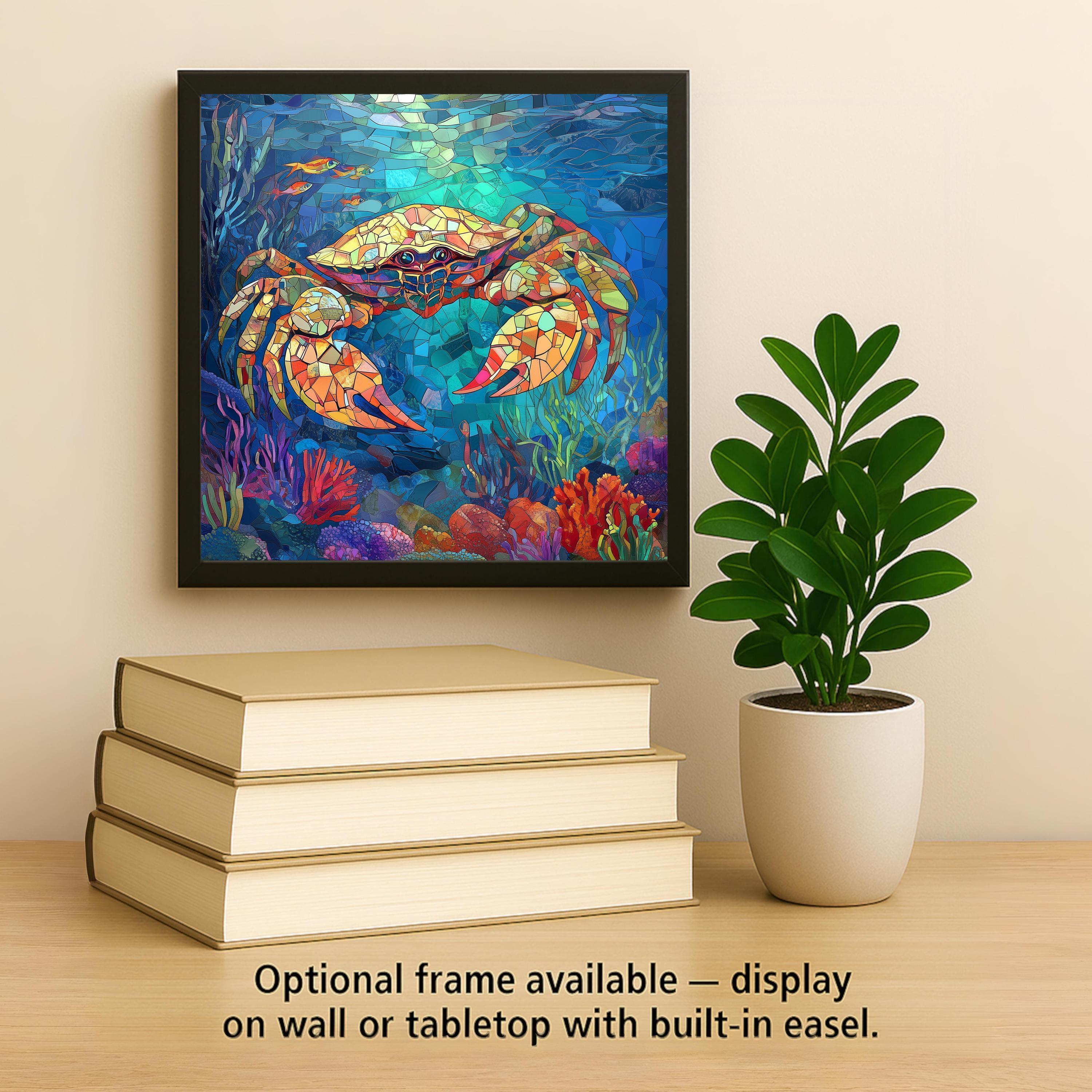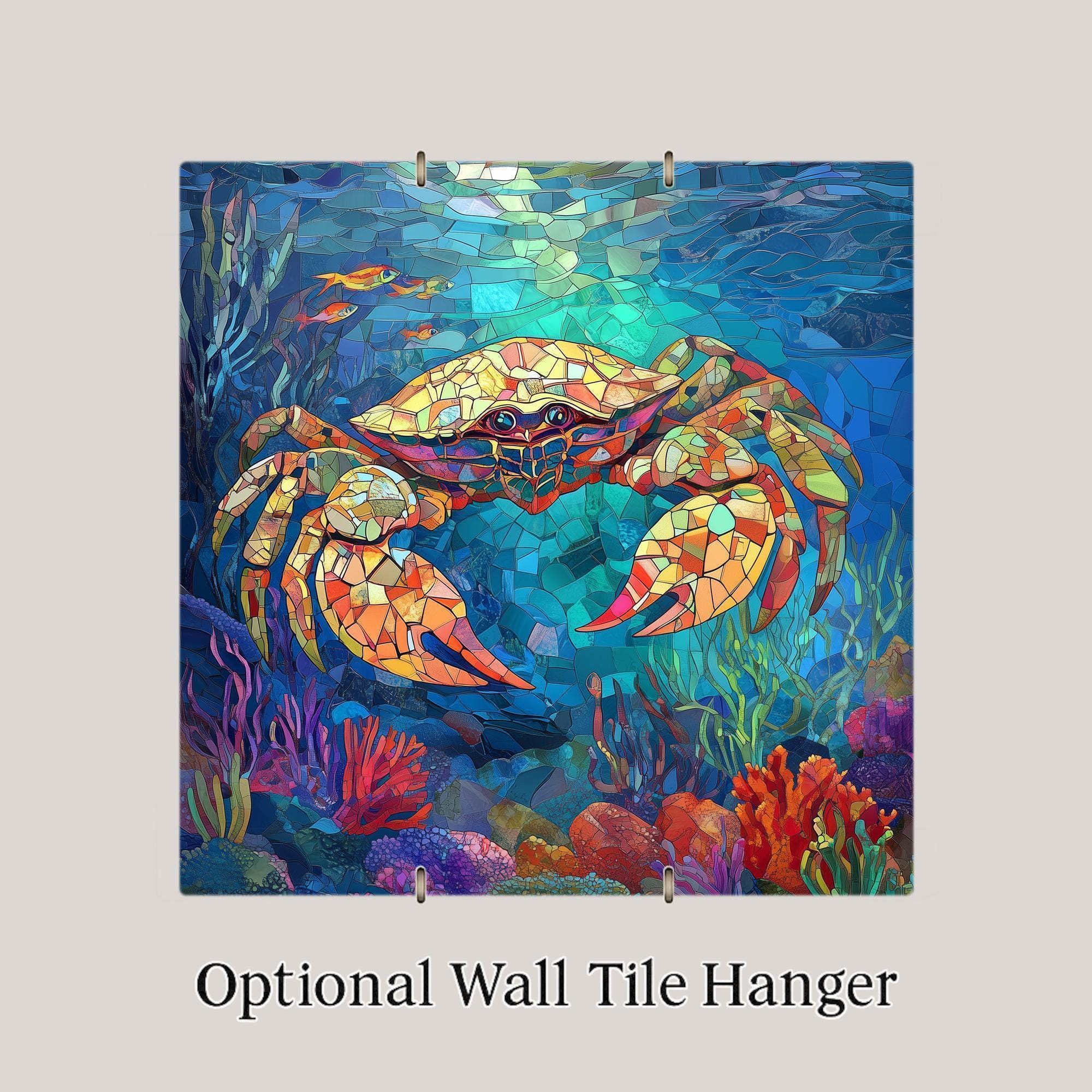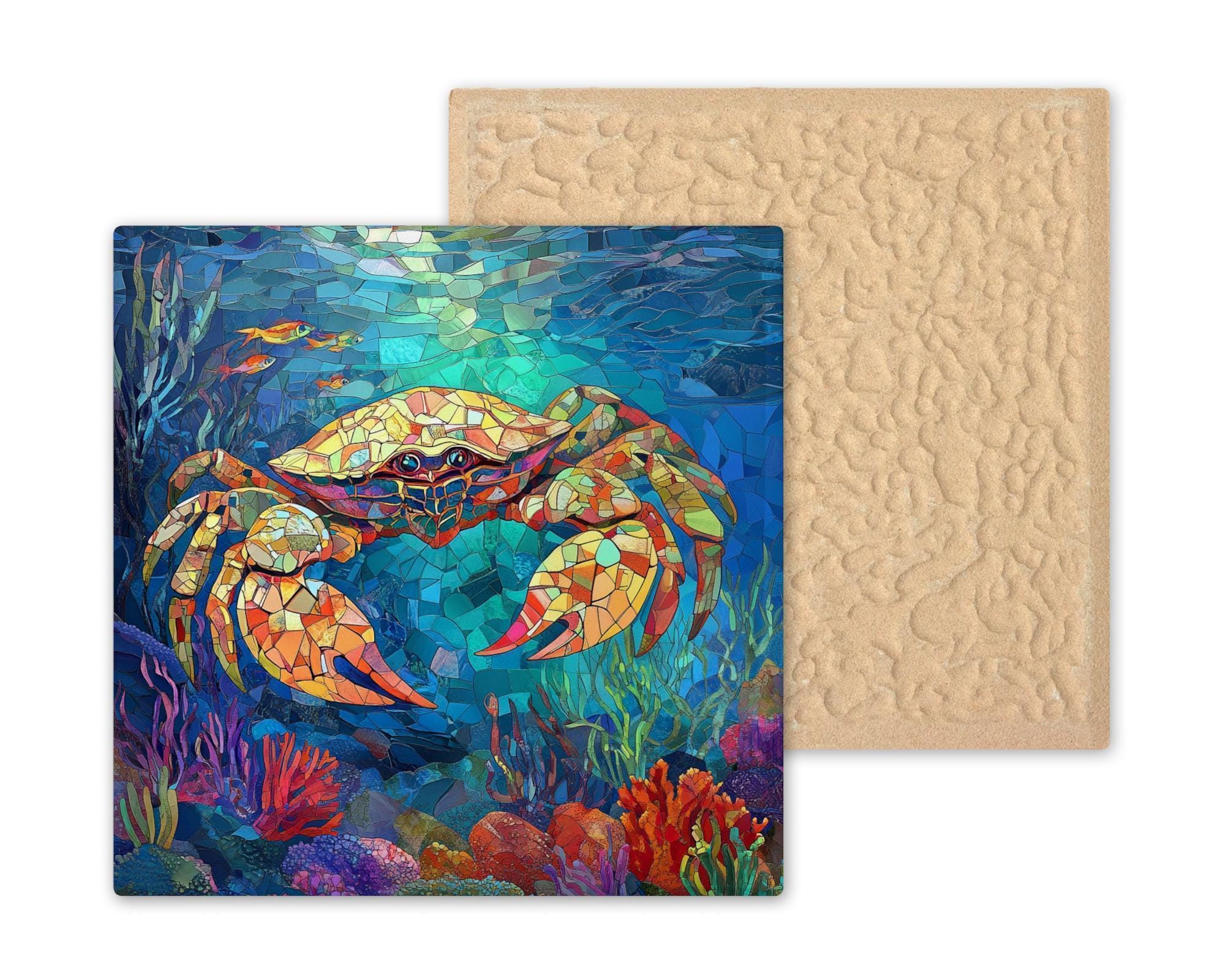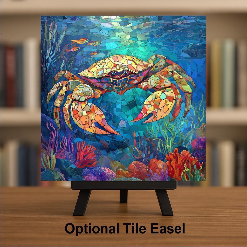Infuse your home with coastal color and ocean vibes with this handcrafted ceramic crab tile featuring a stained-glass-inspired mosaic design. Bursting with brilliant blues, fiery oranges, and rich marine hues, this vibrant crab swims through a reef-like world of coral, kelp, and sea creatures. The detailed glass-look patterning gives it the feel of hand-cut mosaic art, offering a unique focal point for your beach-themed décor.