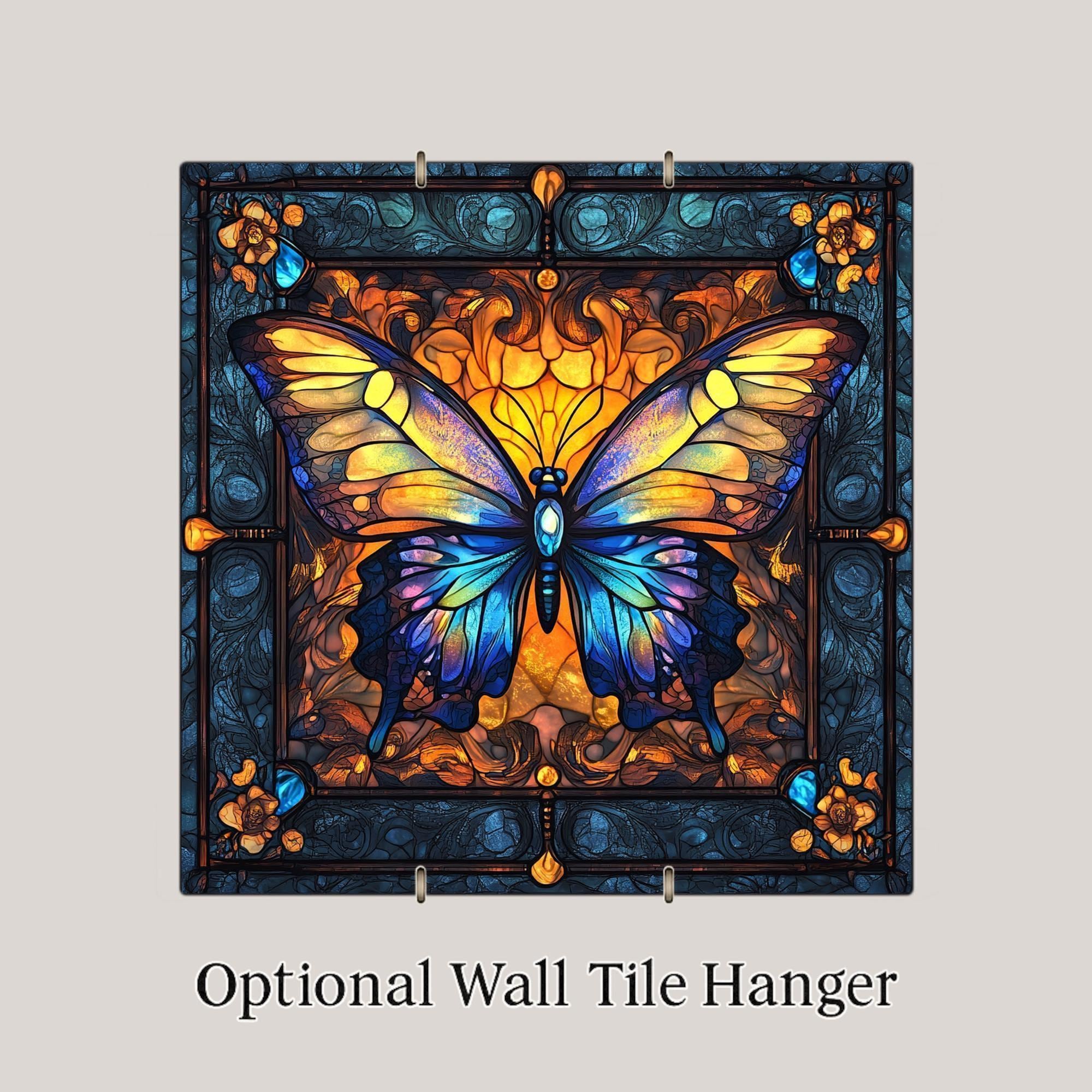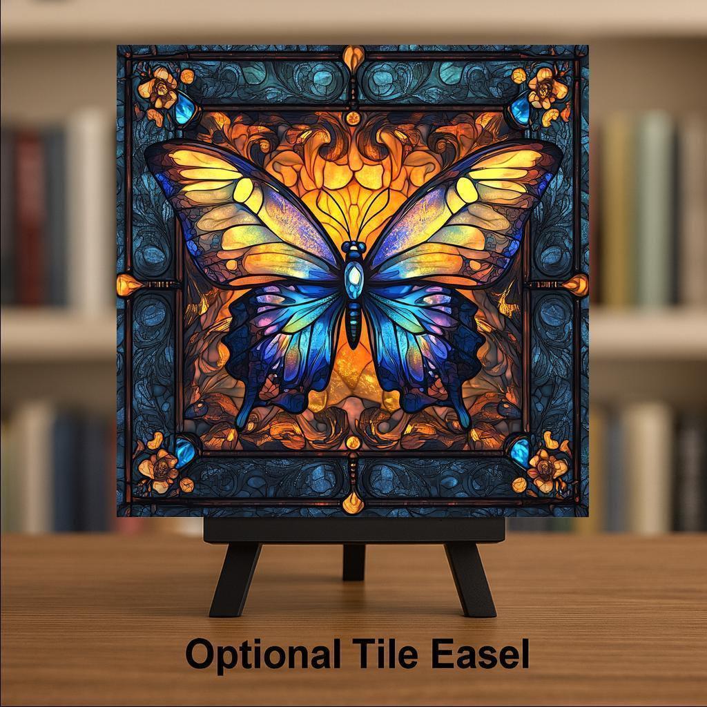 Celebrate transformation and beauty with this William Morris-inspired butterfly ceramic tile, glowing with the rich colors and intricate style of Tiffany stained glass. The butterfly’s luminous wings burst with jewel-toned blues, warm ambers, and golden yellows, perfectly framed by swirling floral borders that echo the elegance of Art Nouveau. Whether you're decorating a cozy cottage, an art-filled hallway, or a sacred space, this tile adds light, life, and color.