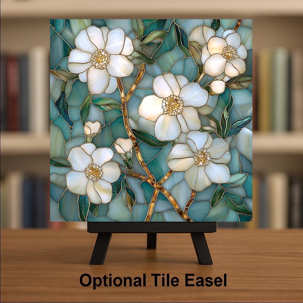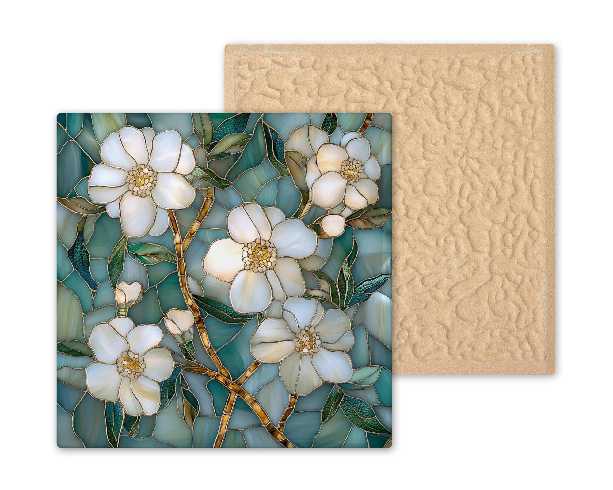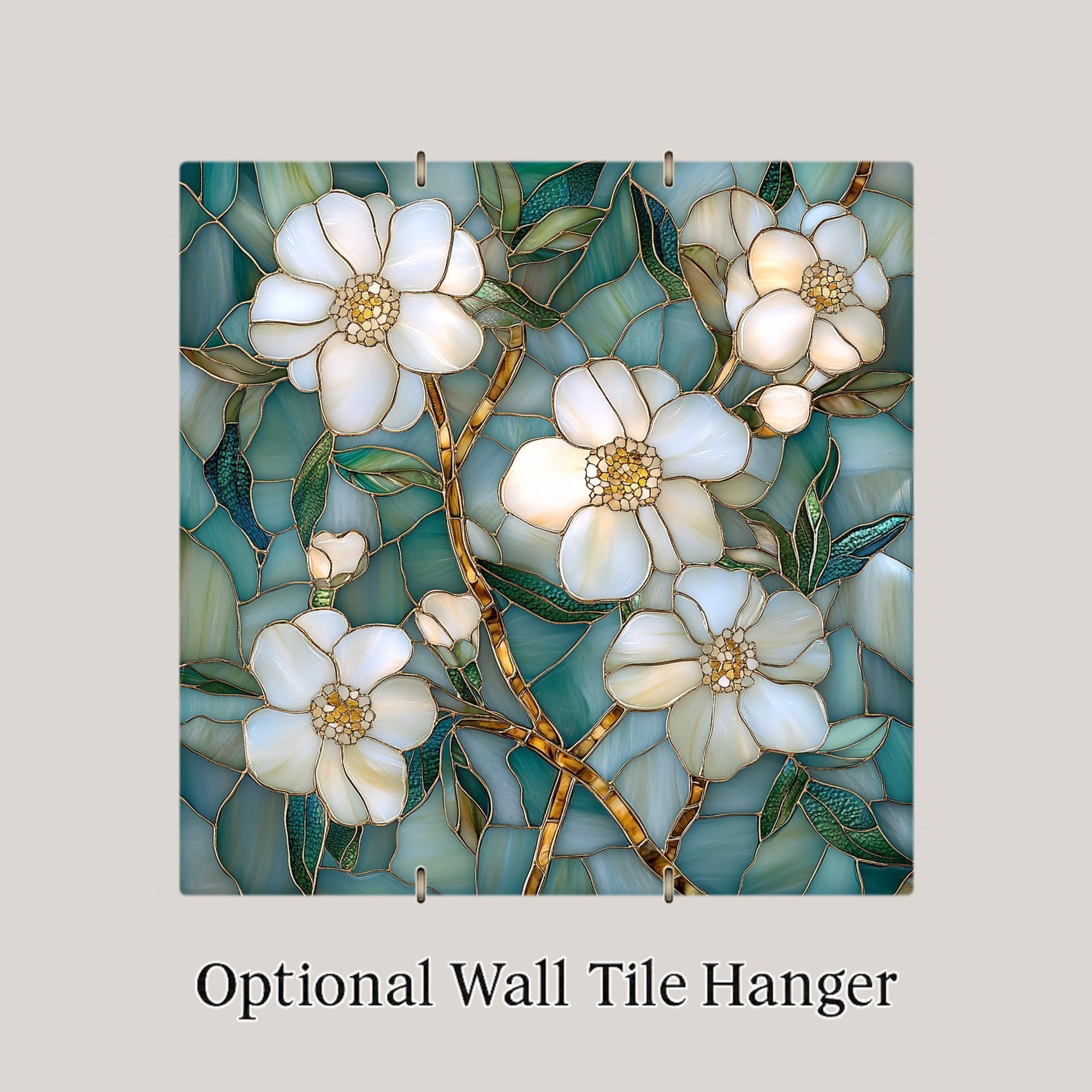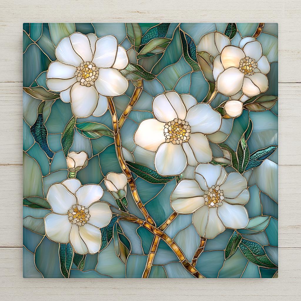 This Cherry Blossom Ceramic Tile blends the flowing style of Art Nouveau with a fresh botanical palette of teal, white, and gold. Featuring soft white blossoms outlined in golden veining against a richly textured background, it mimics the look of stained glass but is actually a high-quality ceramic print designed to last.