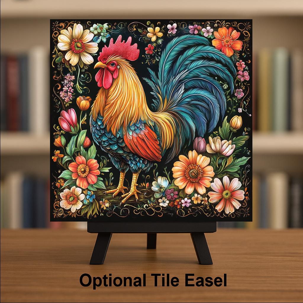 Celebrate rustic beauty and country pride with this bold and beautiful rooster ceramic tile. The rich folk art styling captures a classic farmhouse rooster in dazzling detail, surrounded by blooming flowers in every color. From the intricate feather patterns to the ornate floral frame, this piece brings warmth and personality to your home.