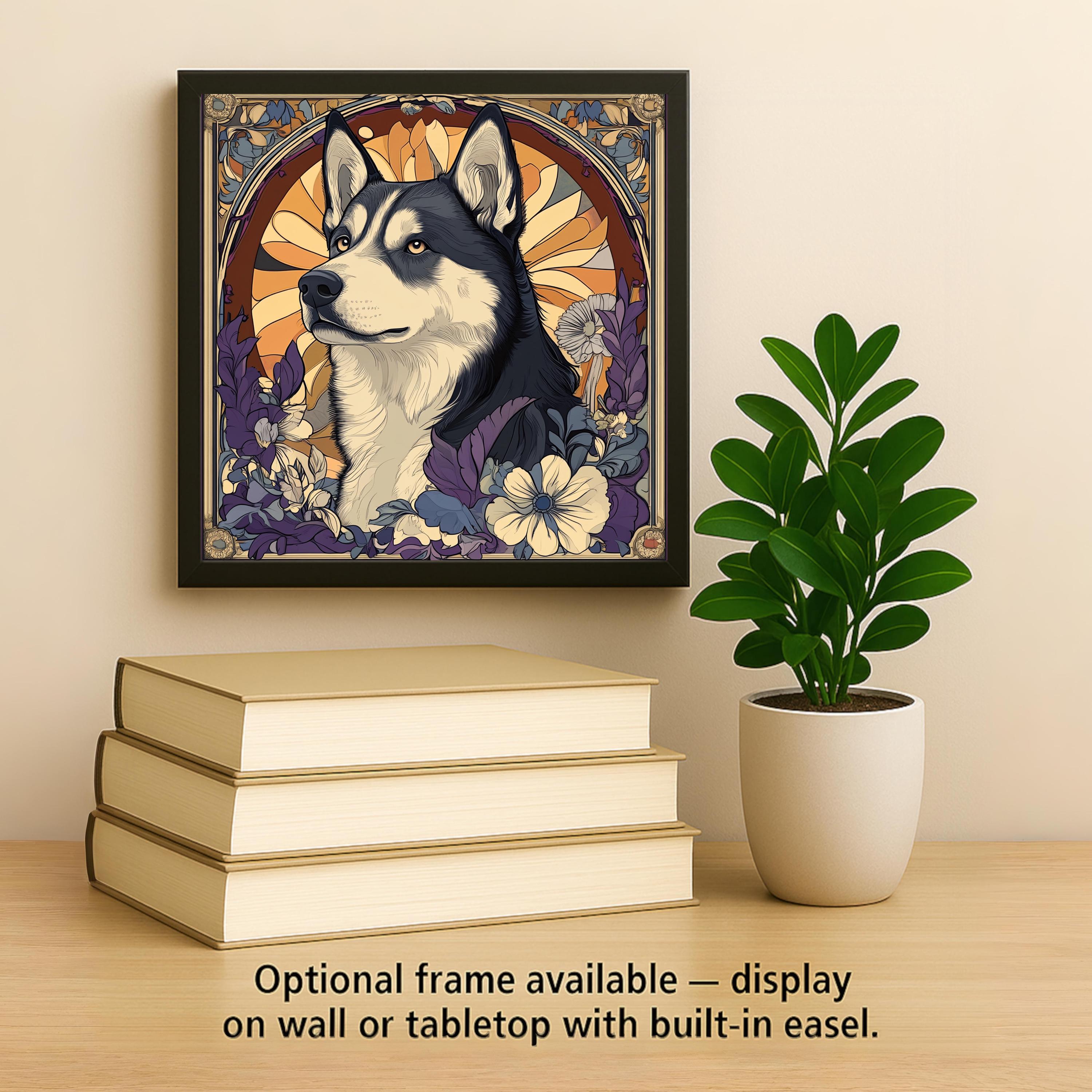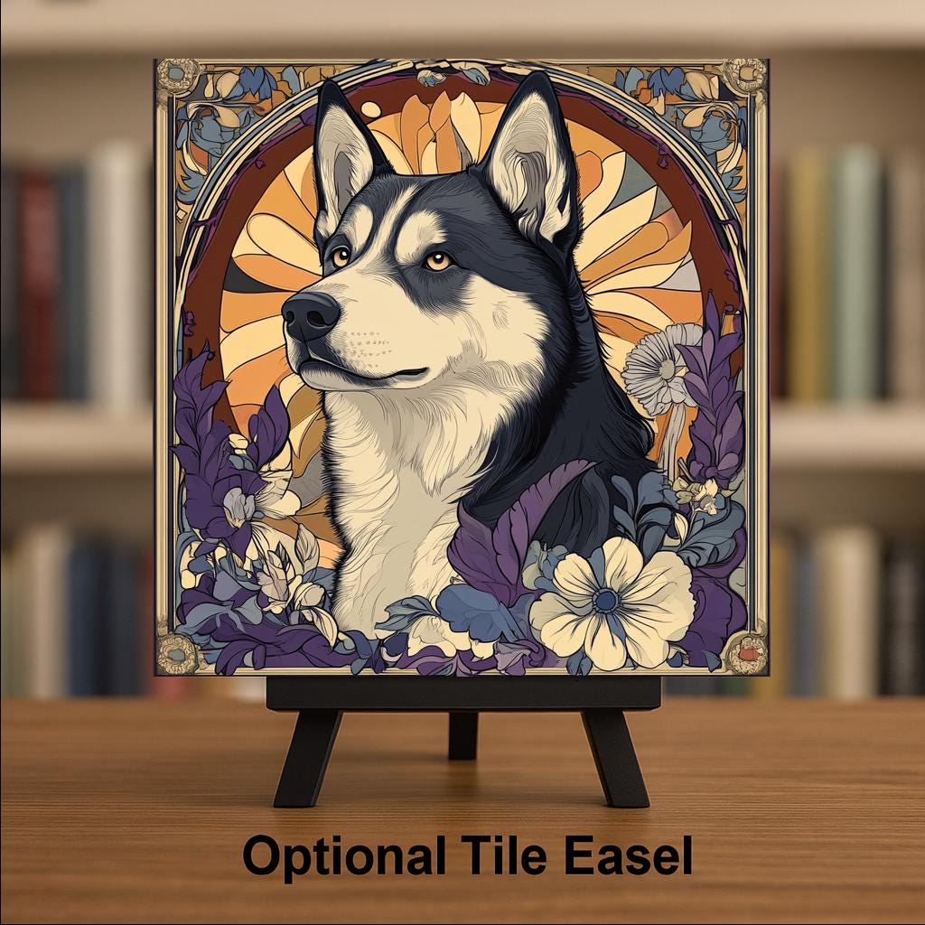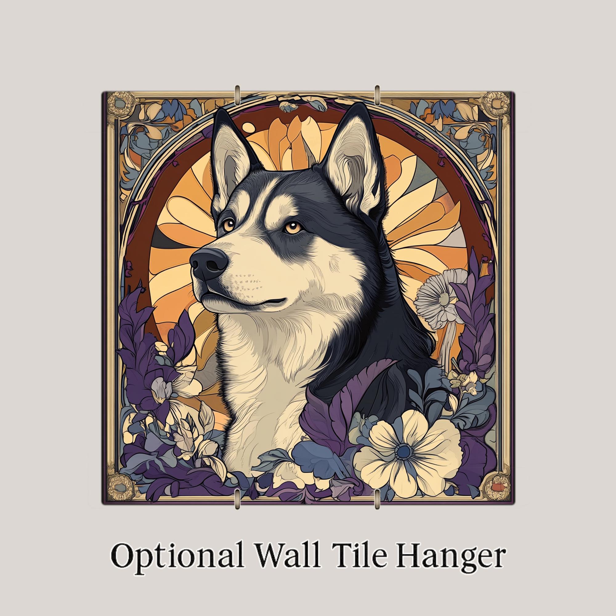 This Siberian Husky Art Nouveau ceramic tile is more than just a home accent—it's a tribute to one of the most beloved dog breeds. With flowing lines, botanical elements, and warm vintage tones, the Mucha-style artwork captures the husky’s strength and soulful nature. Whether you're a husky owner or simply love classic dog art, this tile offers a beautiful focal point for any room. It’s perfect for dog-themed kitchens, rustic cabins, or elegant entryways. The floral frame gives it a timeless feel, while the deep black and silver-blue fur tones create contrast and grace.