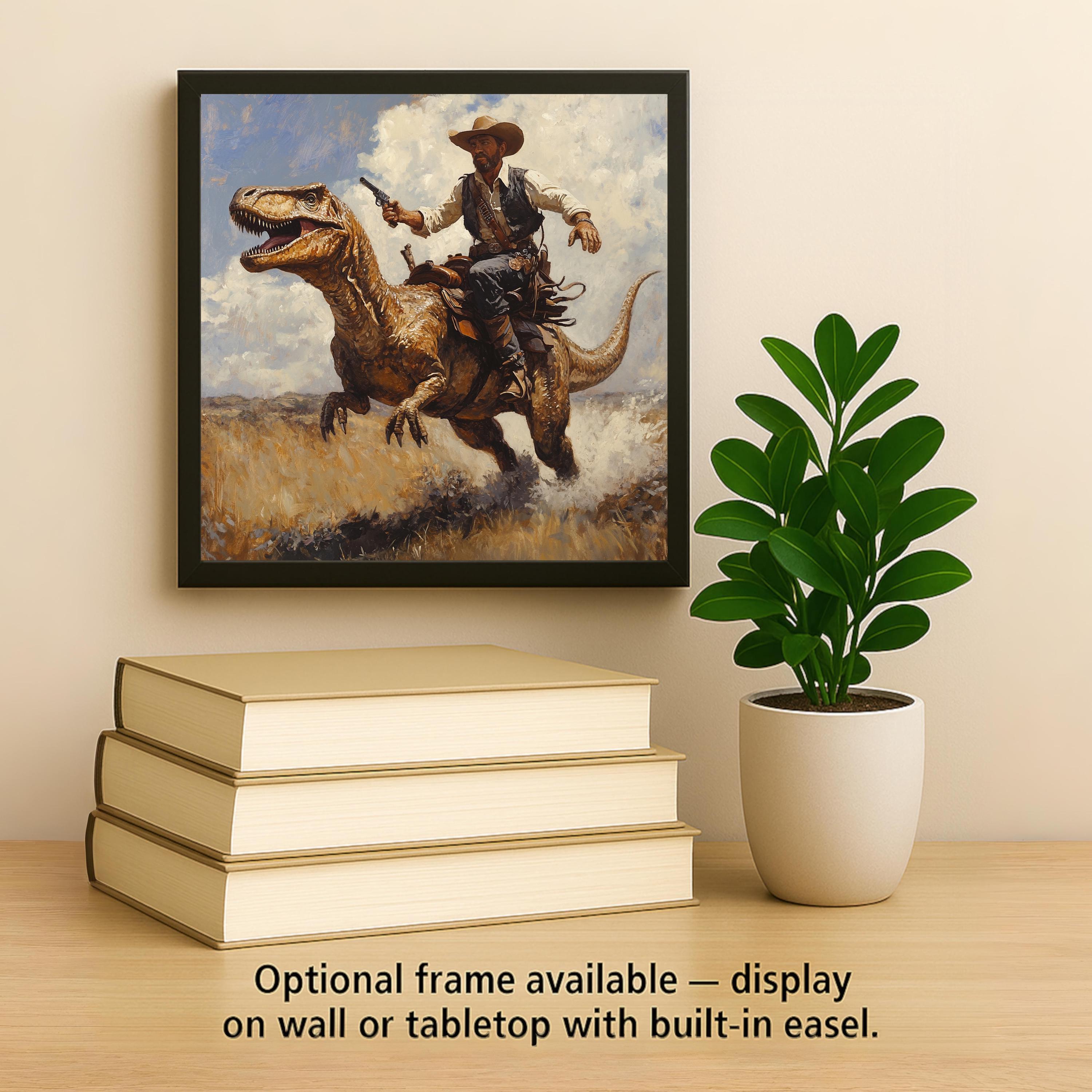 Whether used as a standalone visual punch or displayed alongside other whimsical tiles, this cowboy-and-raptor artwork adds energy, humor, and adventure to your wall decor.