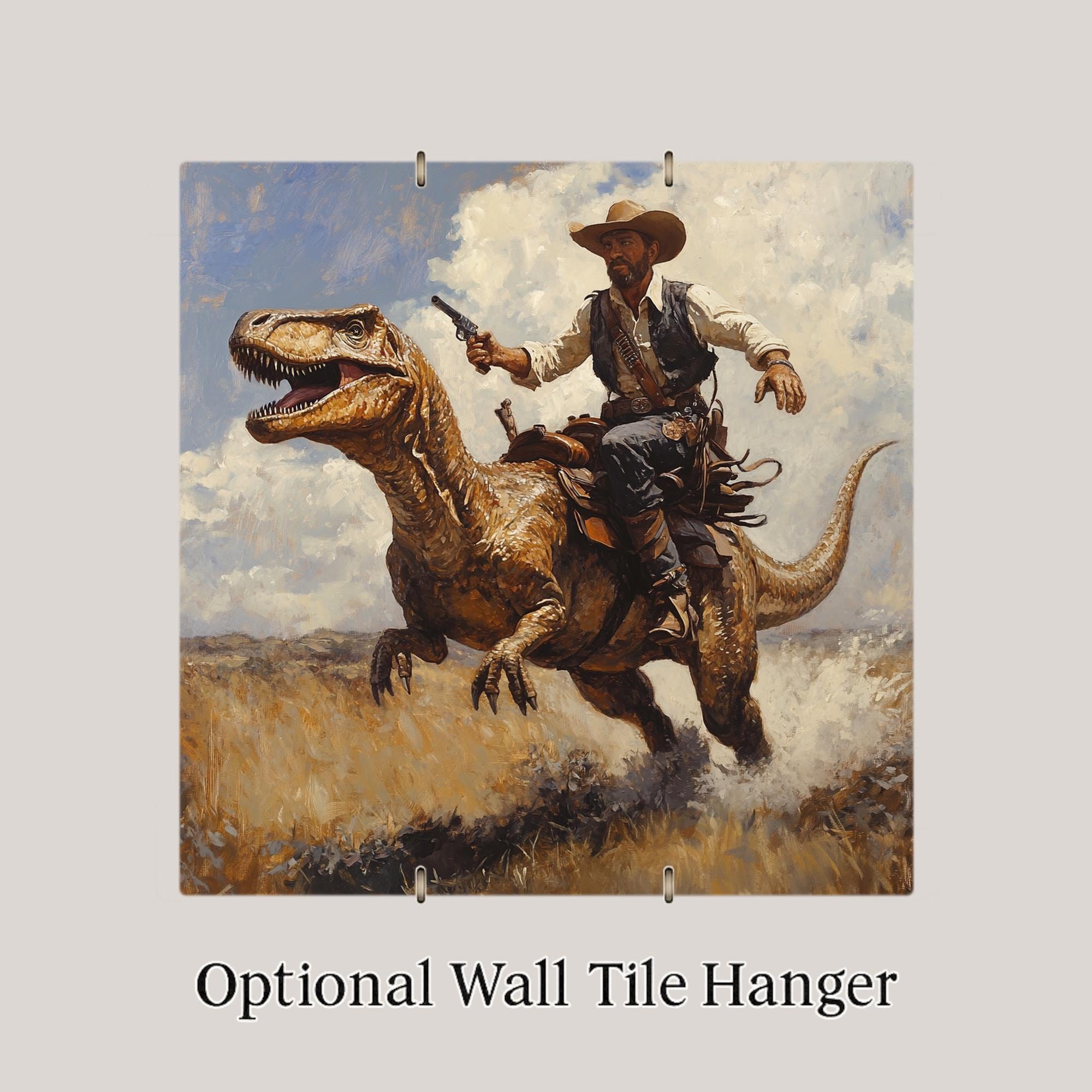 This tile makes a great gift for fans of Western movies, dinosaur mashups, novelty art, or unique home decor. The dynamic motion, expressive lighting, and rugged frontier vibe give the piece a bold and entertaining personality. It fits beautifully in game rooms, home bars, man caves, offices, or quirky living spaces.