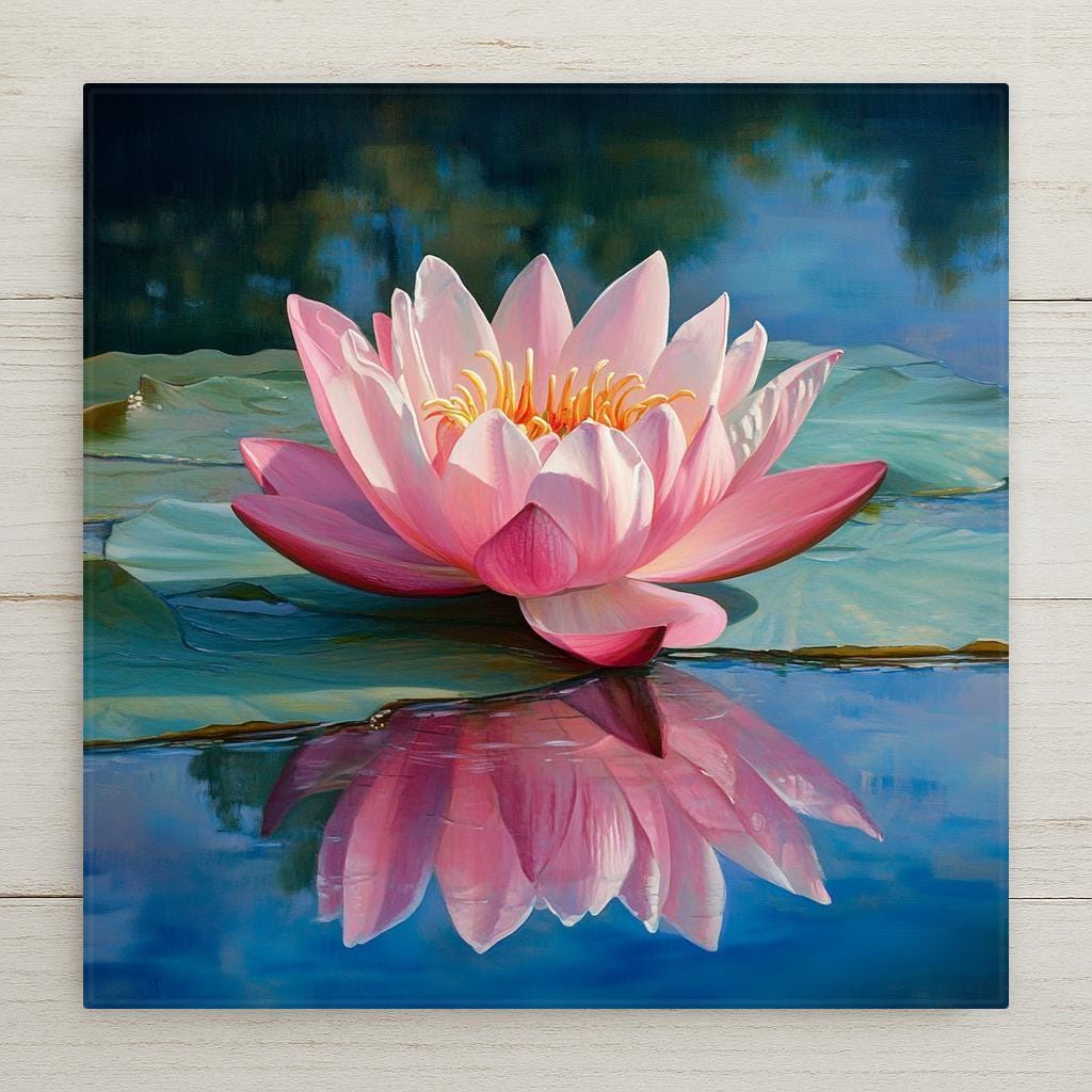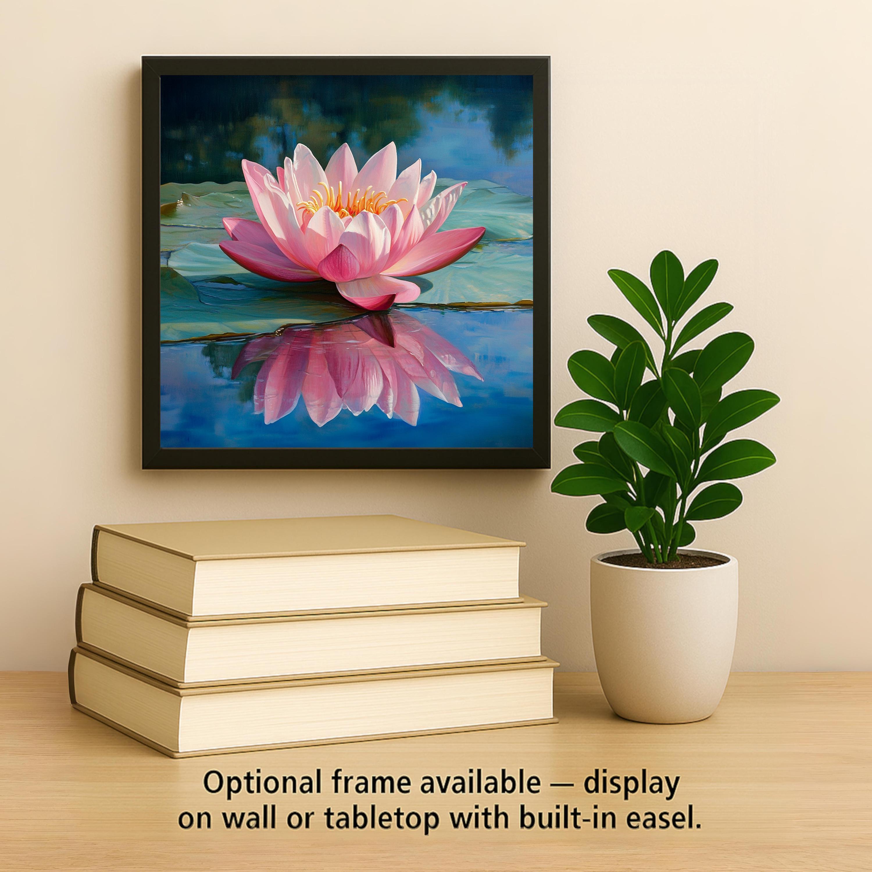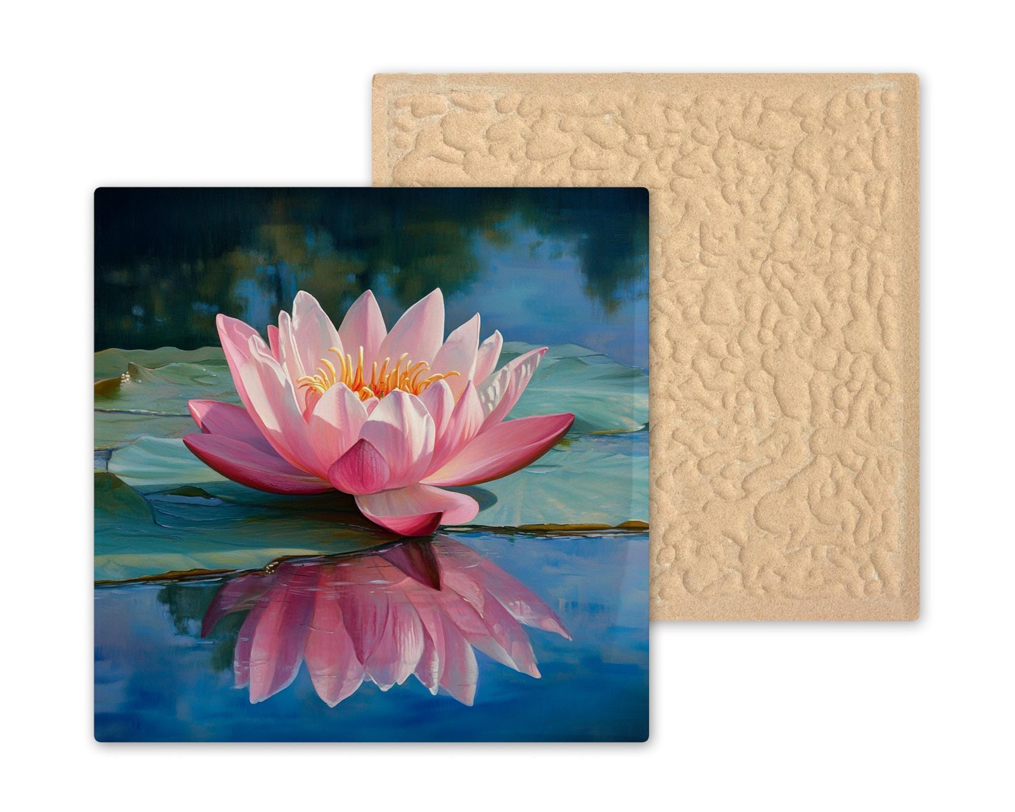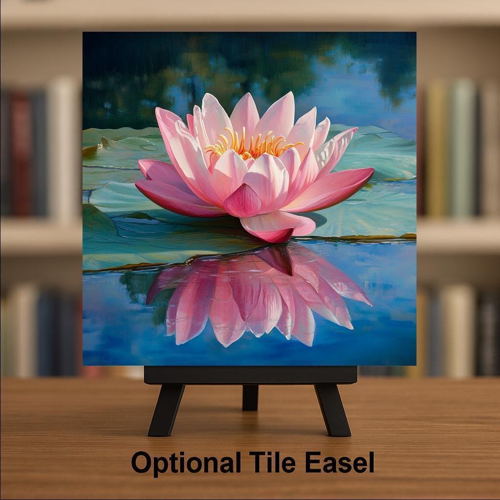Celebrate nature, mindfulness, and artistic charm with this pink lotus ceramic tile—an elegant piece of wall decor inspired by Zen gardens and peaceful water scenes. The delicate bloom appears to float on a quiet pond, its petals and reflection glowing against a tranquil blue background. This handcrafted tile brings peace and intention to your home.