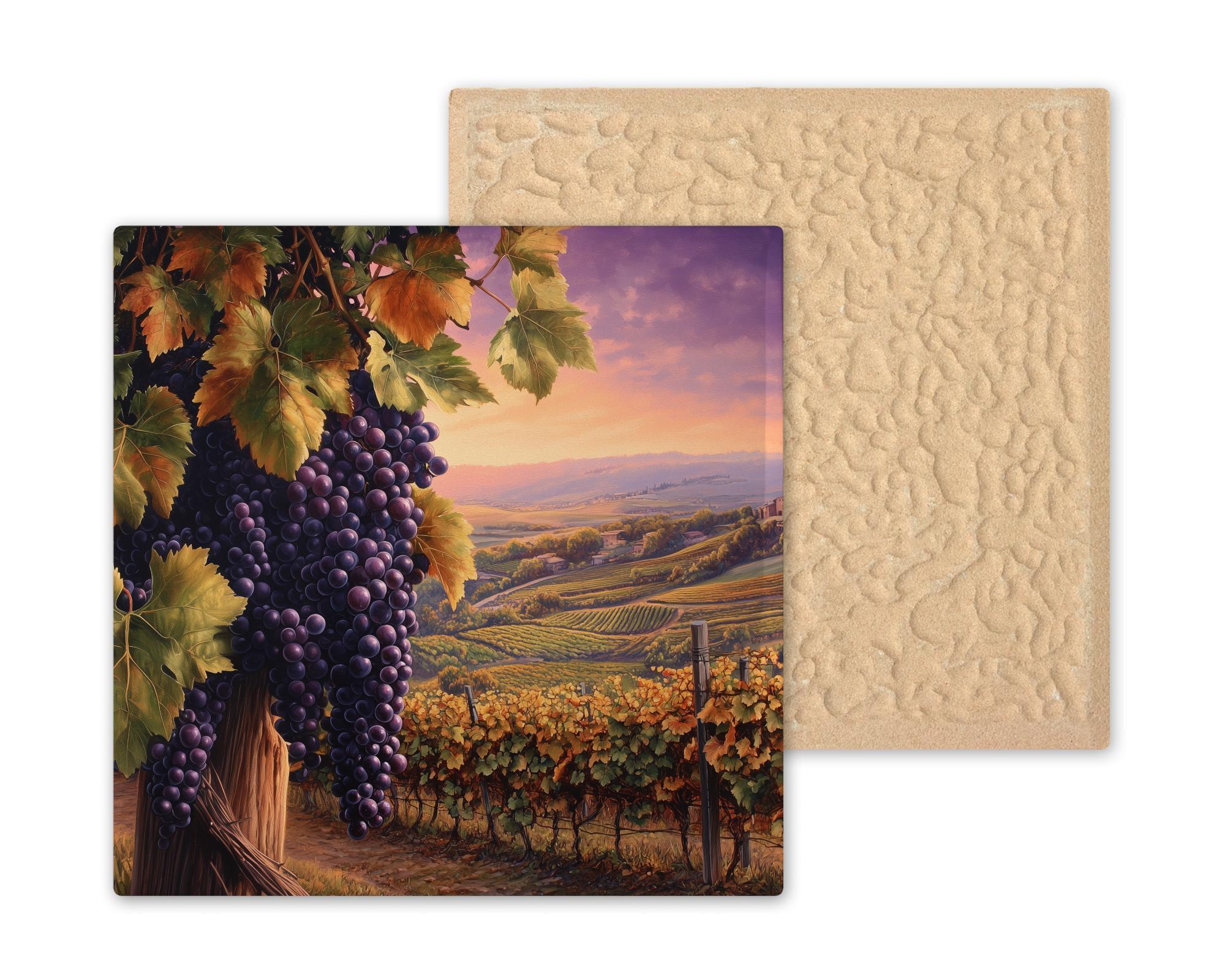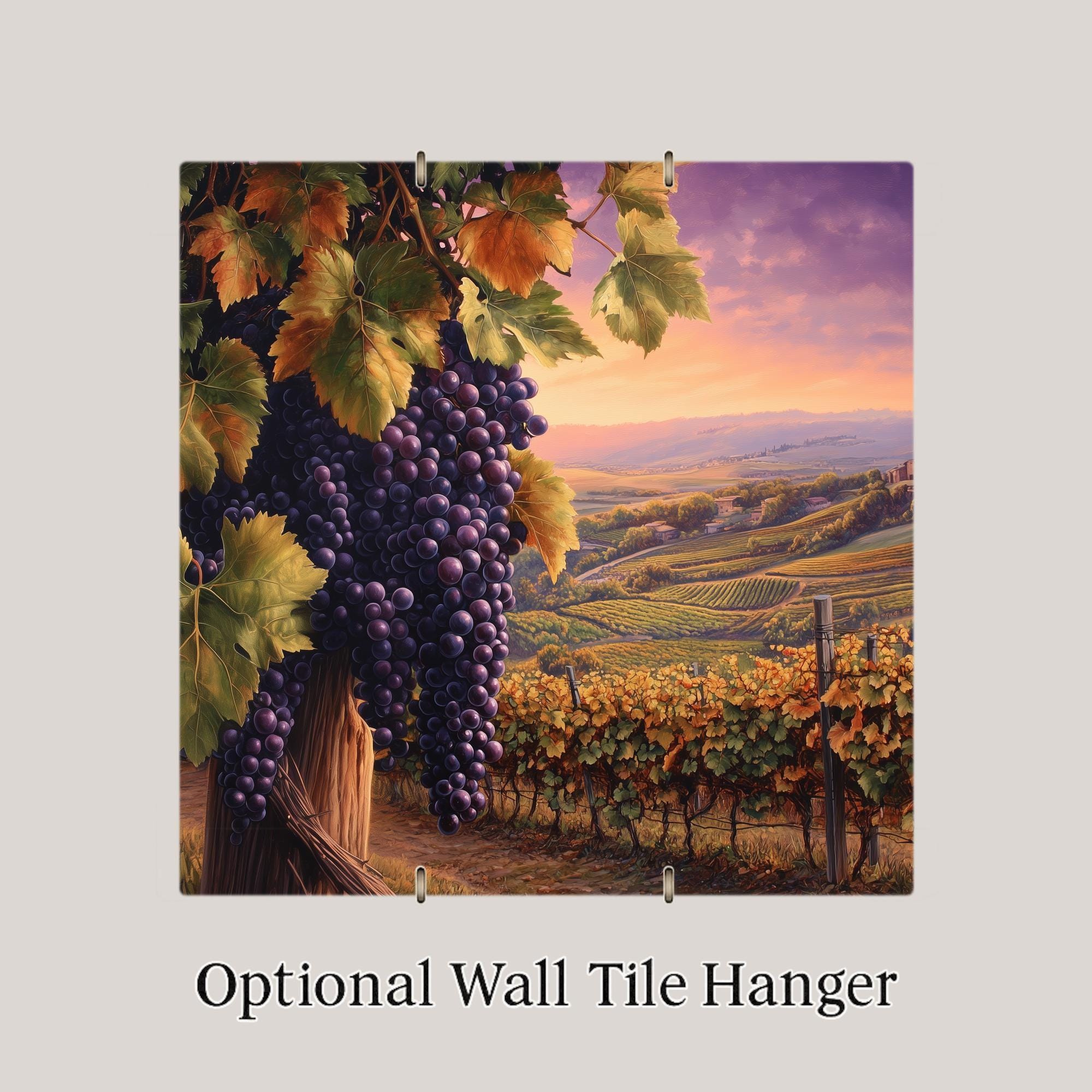 Celebrate vineyard charm and countryside elegance with this Tuscany ceramic tile art, showcasing a beautiful bunch of ripe purple grapes set against the golden glow of sunset. The lush vineyard rolls into the hills beyond, evoking memories of Italian wine country and timeless rustic beauty. It's a perfect accent for kitchens, wine bars, or farmhouse-themed interiors.